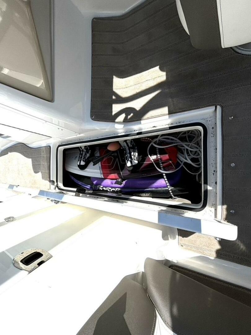 | Notable Upgrades: CUSTOM FIT FULL CANVAS COVER - TOWER WITH BIMINI AND INTEGRATED LIGHTING - NO WAKE MODE/CRUISE ASSIST - STERN HOSE DOWN - TANDEM AXLE TRAILER |