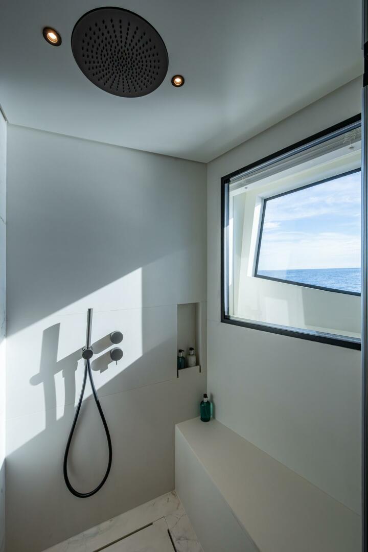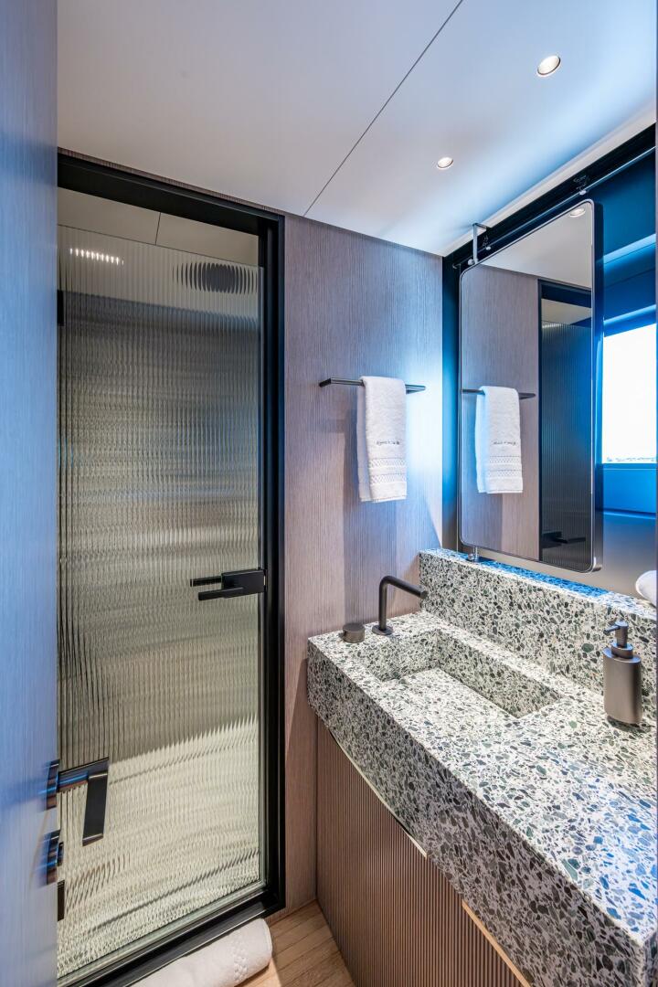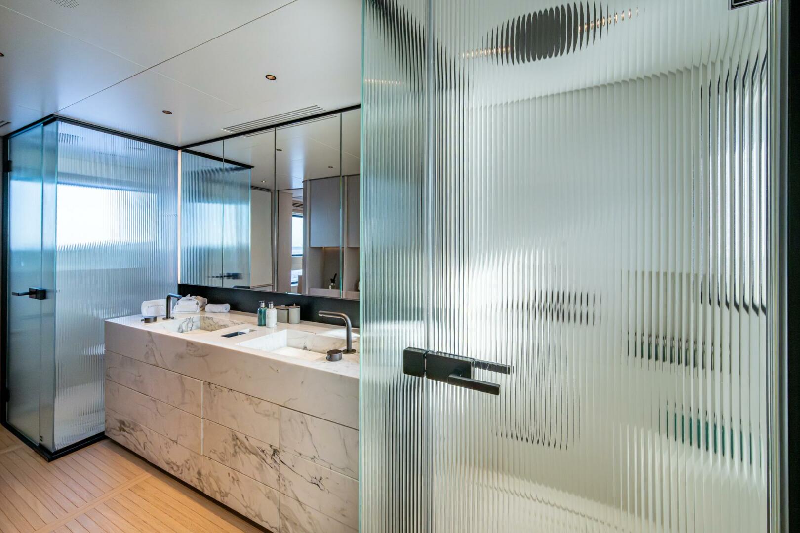 The master head is a his and hers behind the forward bulkhead with port and starboard access. The shower is to starboard and the marine head is to port. In between are the shared his and her white marble sinks with decorative contemporary fixtures.