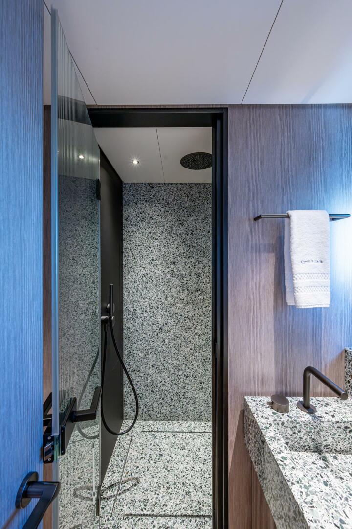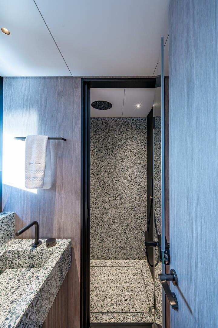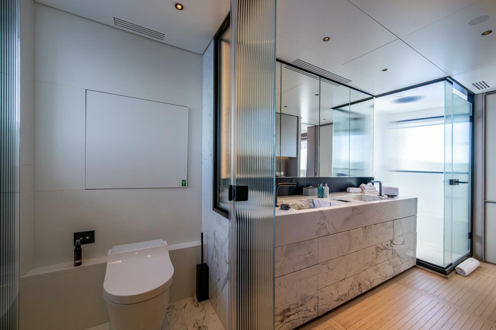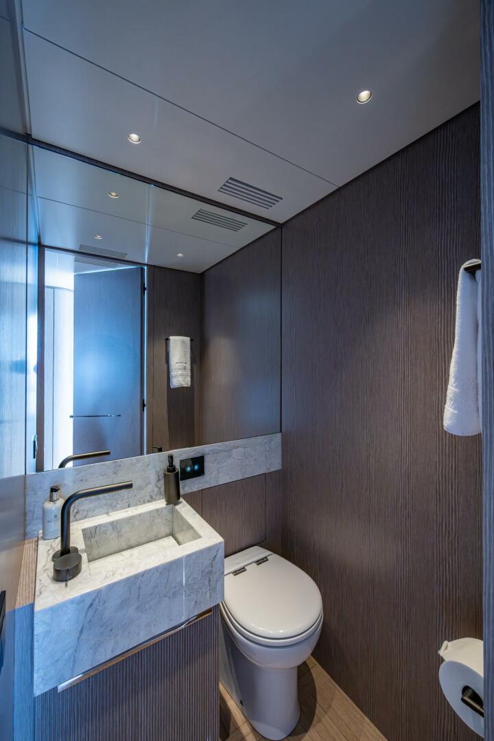 The master head is a his and hers behind the forward bulkhead with port and starboard access. The shower is to starboard and the marine head is to port. In between are the shared his and her white marble sinks with decorative contemporary fixtures.