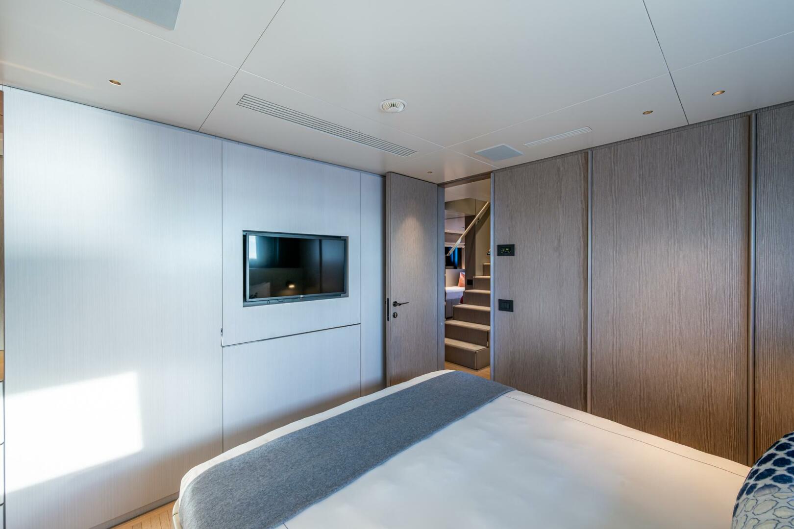 The master stateroom on board King’s Lair is full beam and offers natural light and spectacular views from large windows both port and starboard. Her island king birth is on center set against a forward bulkhead. Additional master stateroom features include….