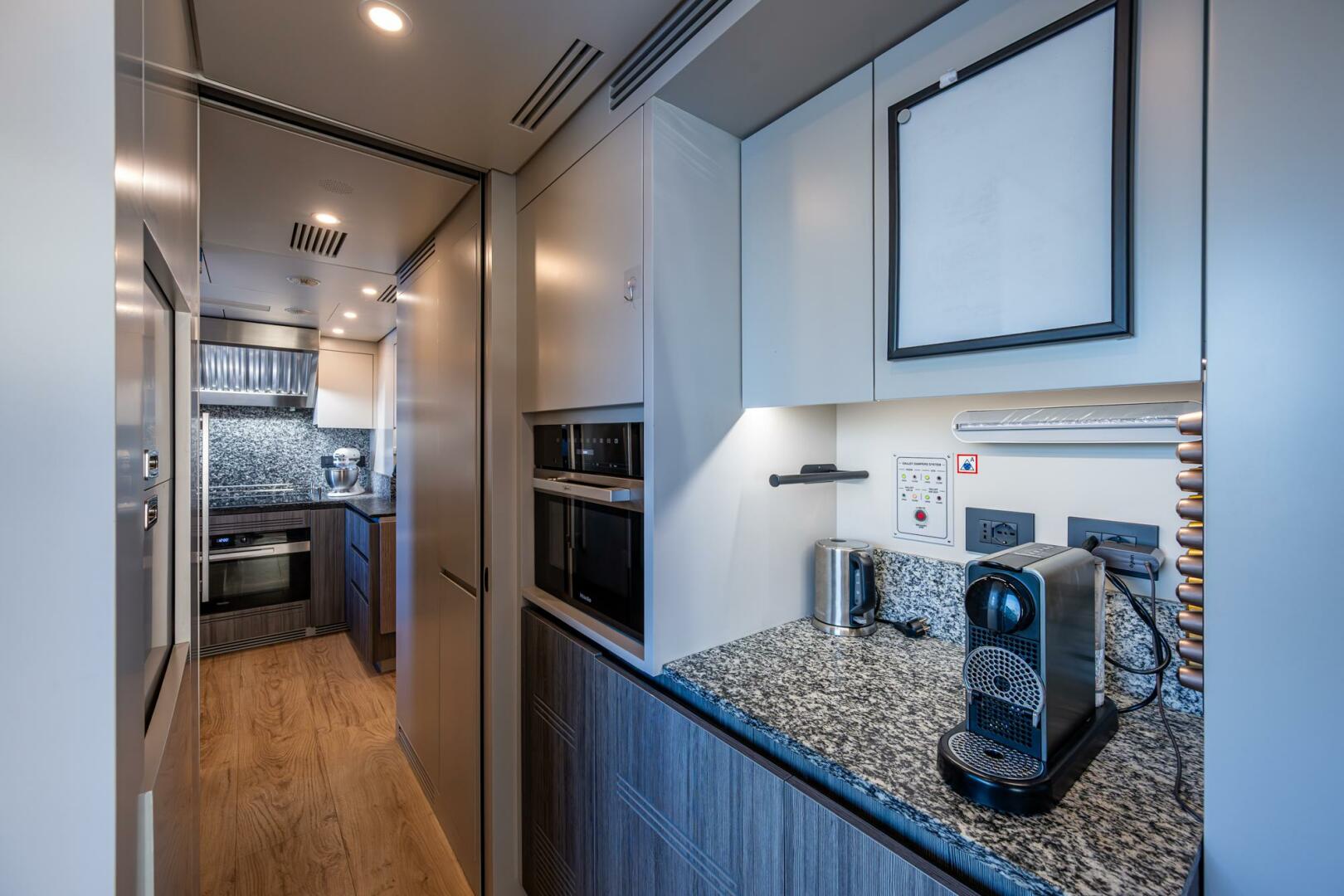 Back on the aft deck there are grand, stainless steel trim, semi-circle panoramic electric glass doors to enter the salon. The salon has an Italian elegance to it, simple, clean and contemporary. Huge floor to ceiling windows allow for tons of natural light. The interior color scheme is a combination of light and darker grey tones with splashes of color. She features decorative light wood flooring throughout. Her seating arrangement is very social with contemporary lounges port and starboard with a centerline circular glass table. Just forward, incorporated into the salon is your formal dining area. King’s Lair offers a table setting for 10 at decorative glass table. On the forward bulkhead there is a large drop down flat screen TV. On the port side forward there is a pocket door to the fully equipped galley. Galley highlights include….