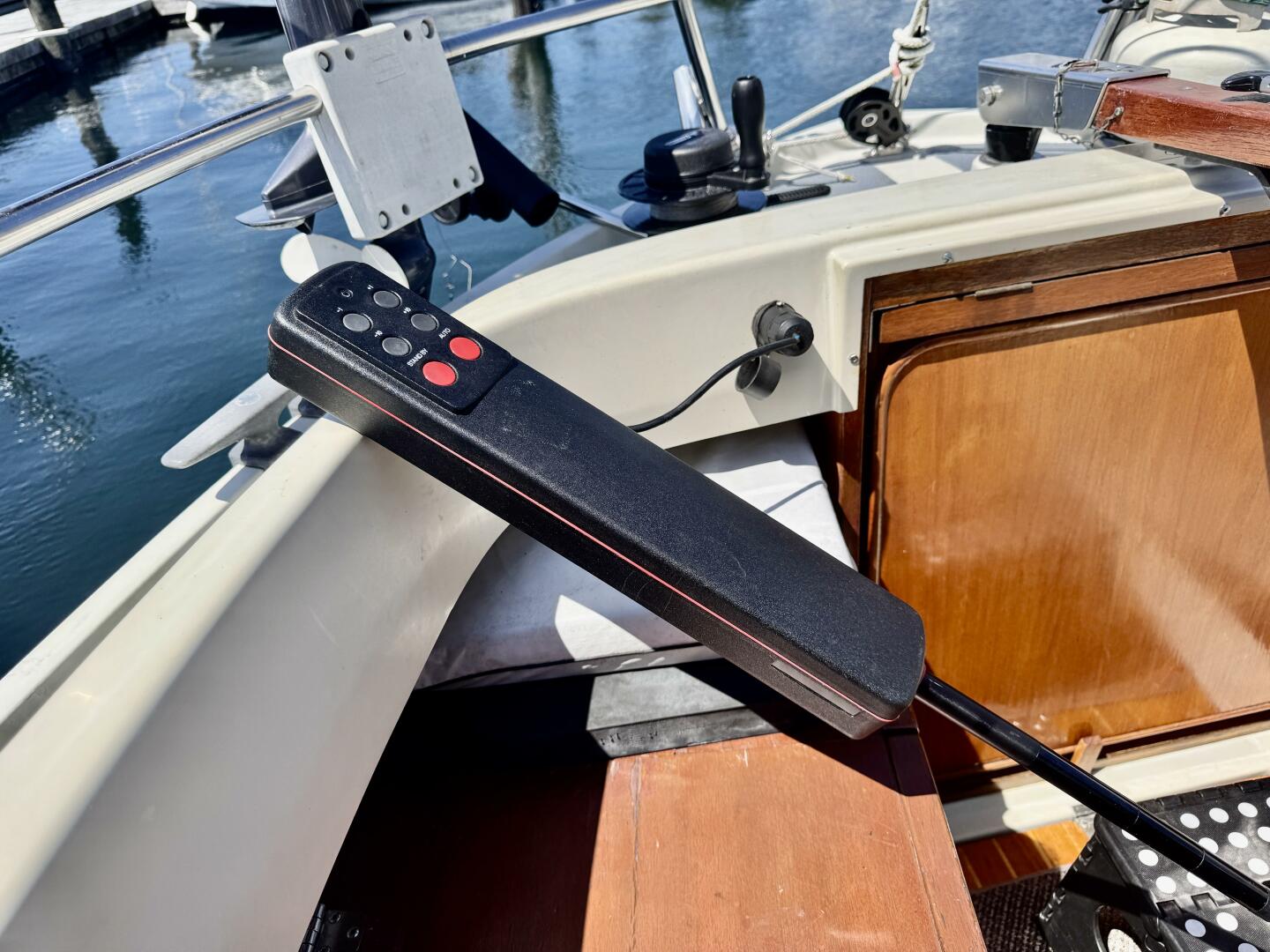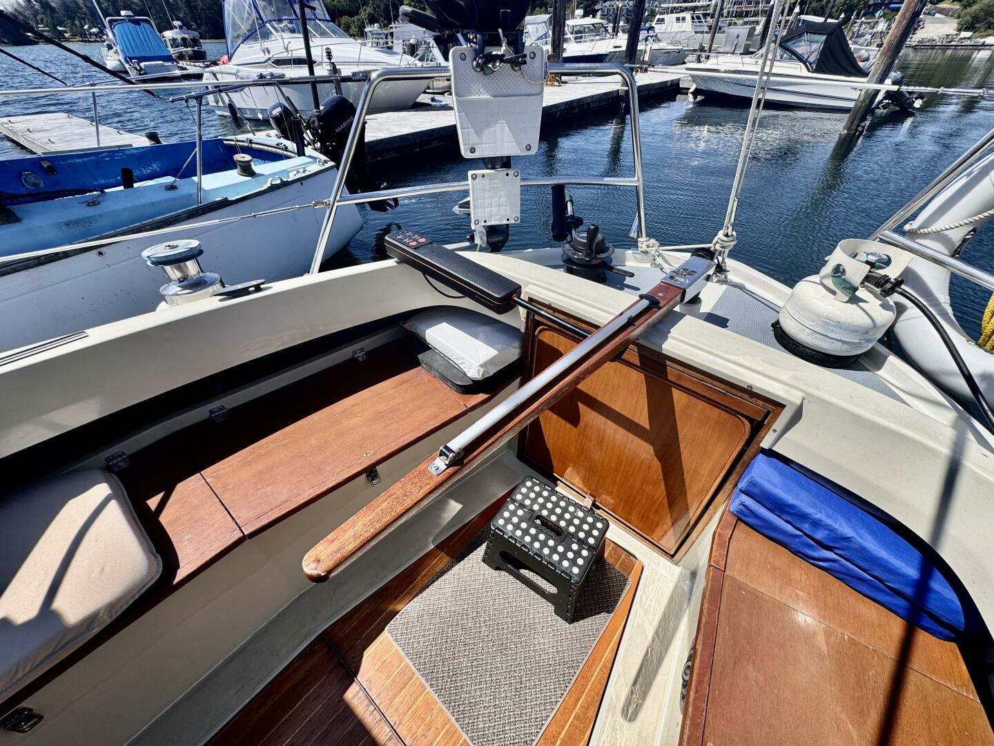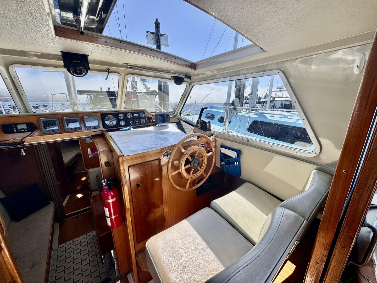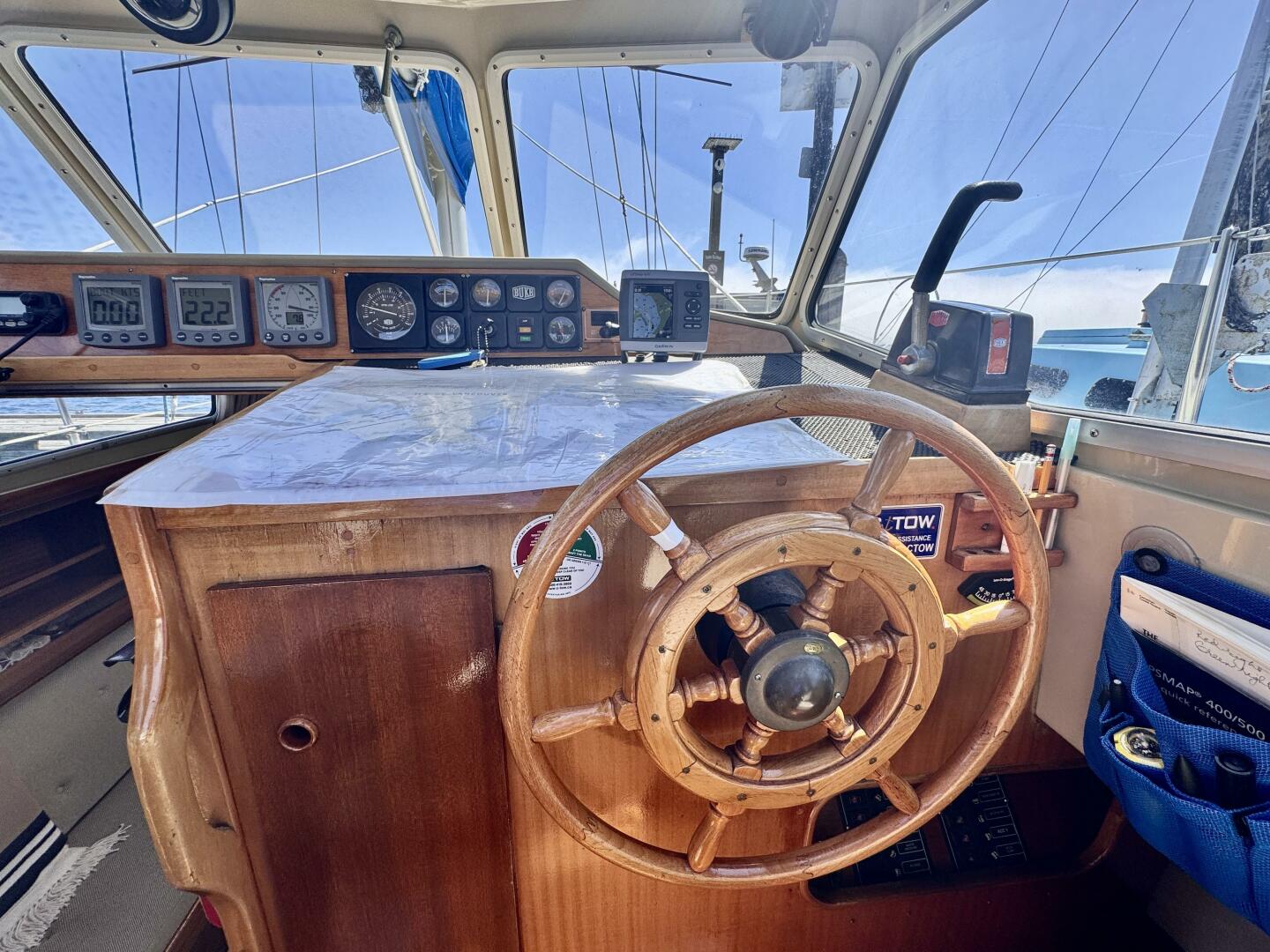 Two steering stations - helm wheel in the pilothouse or tiller control from cockpit