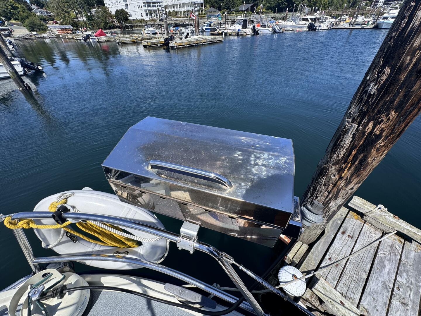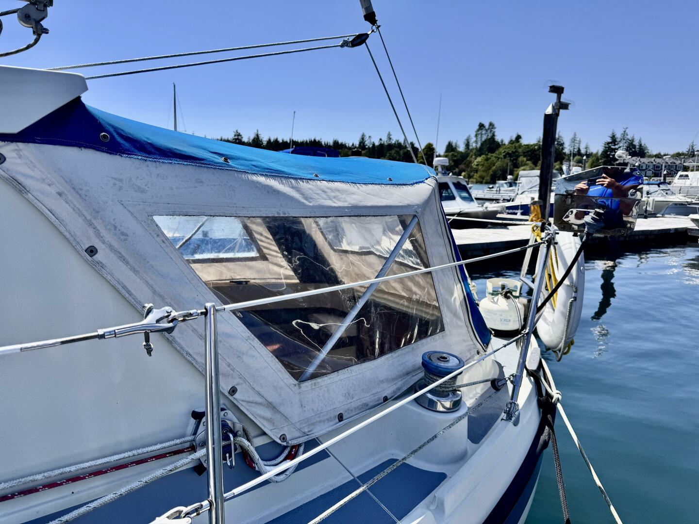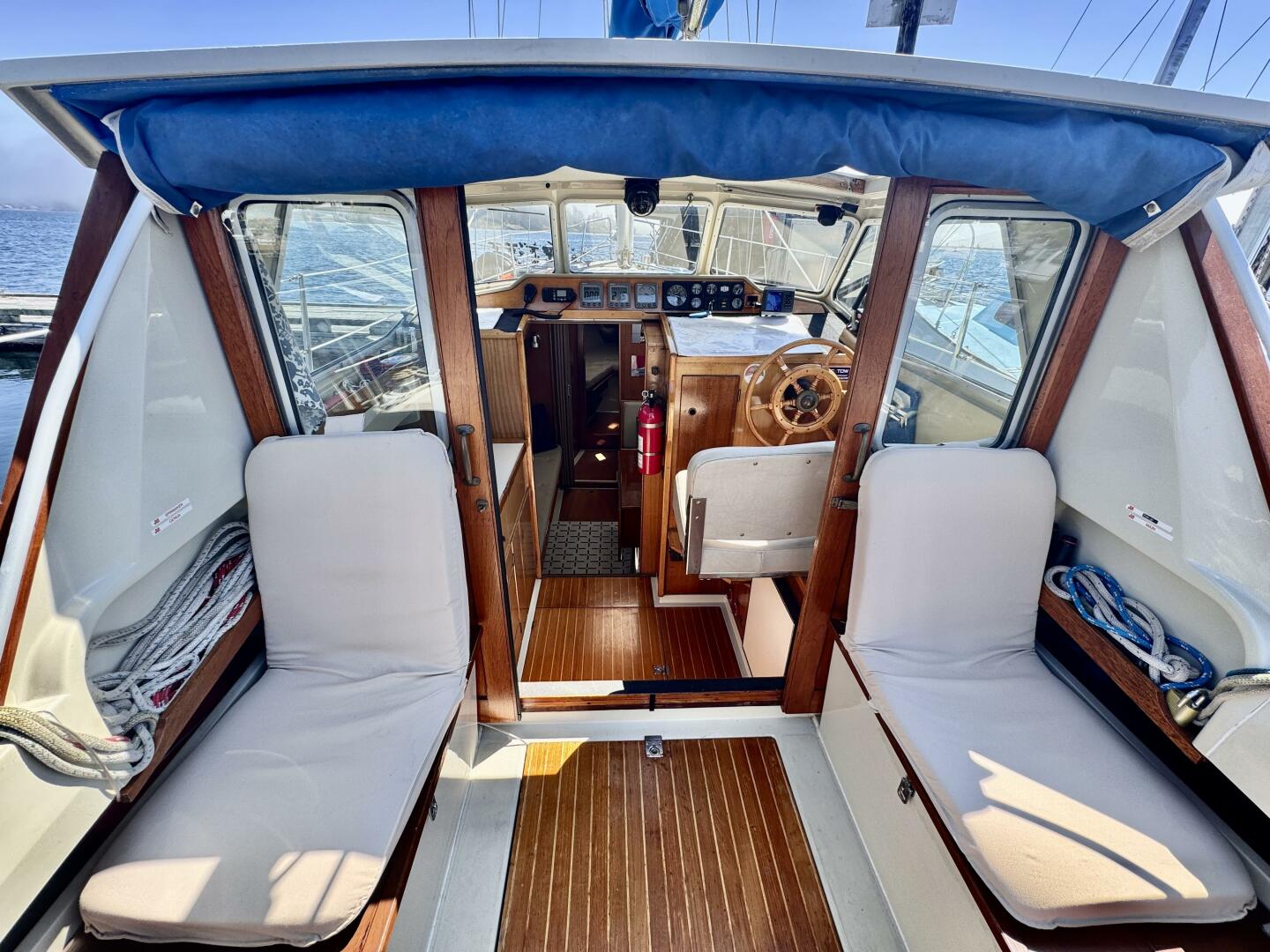The interior helm station, protected cockpit, and full canvas enclosure make shoulder-season and winter cruising not just possible but enjoyable. Whether you’re exploring Desolation Sound or hopping between Gulf Islands in variable weather, you’ll appreciate the ability to stay warm and dry while underway. And when the sun is out, open the top hatch, fold away the enclosure, and enjoy full visibility and airflow from the helm.