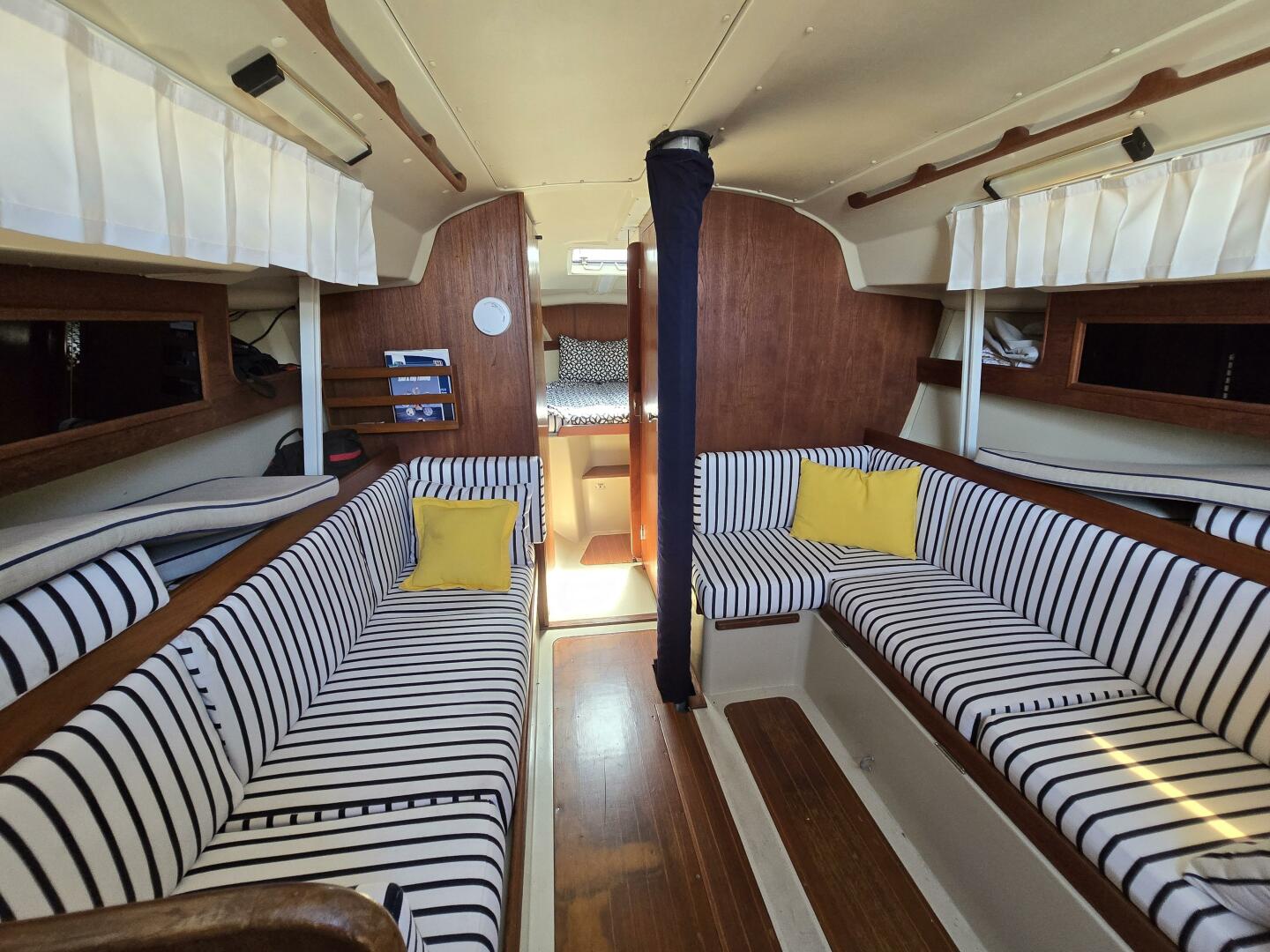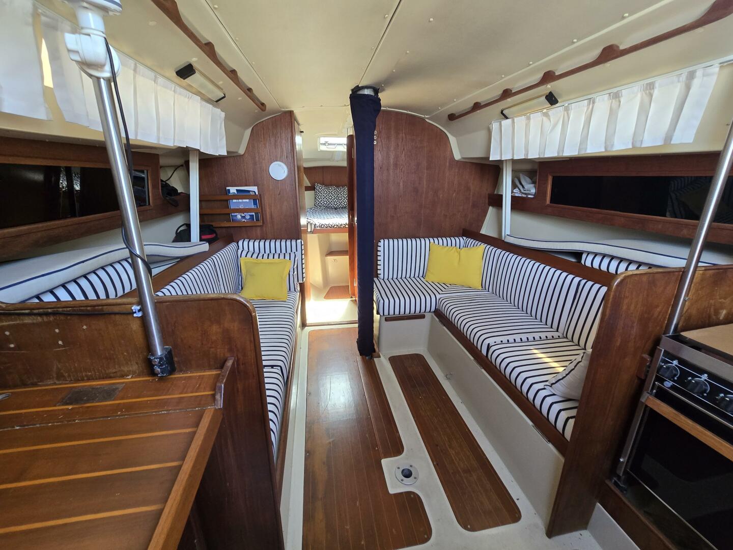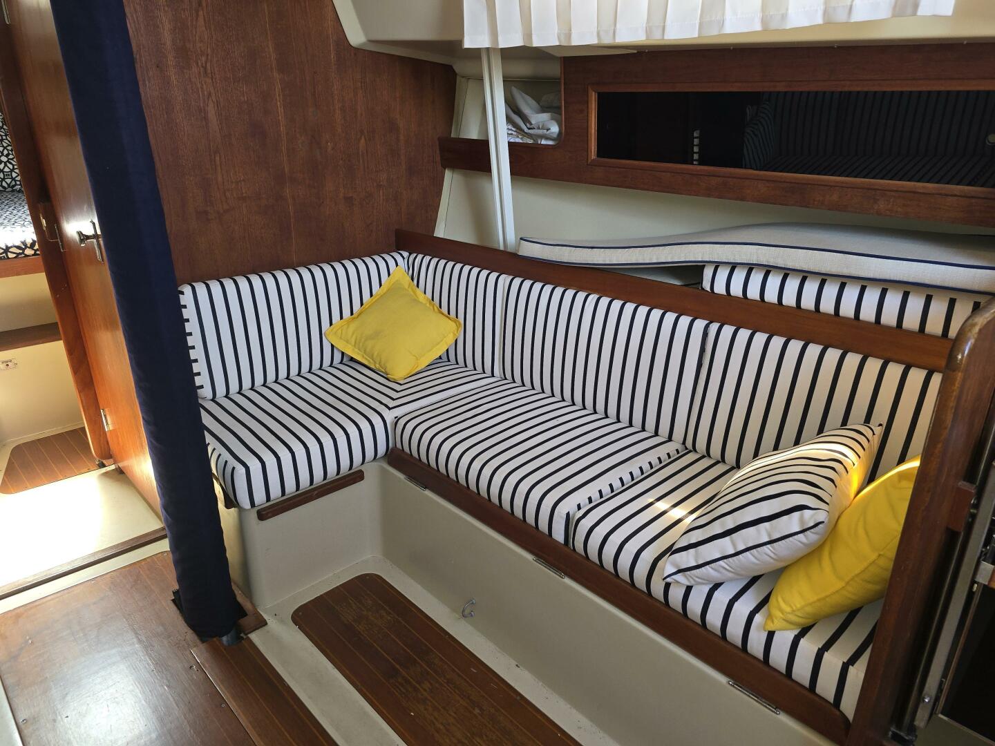 - Teak & holly style sole, custom cushions, folding dinette and cockpit tables.