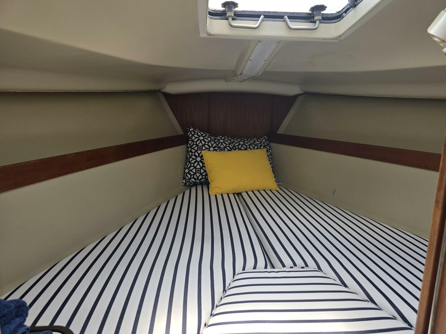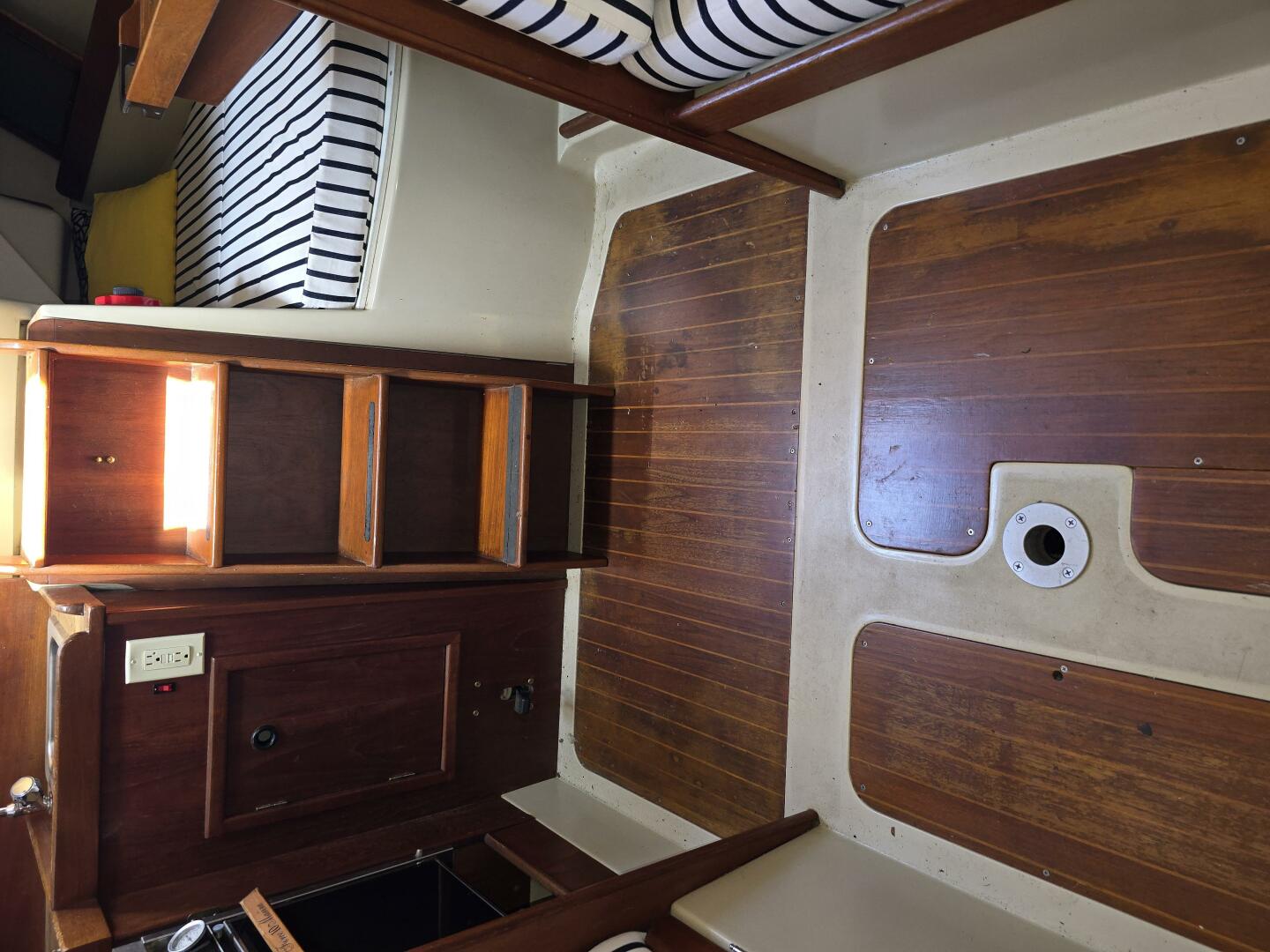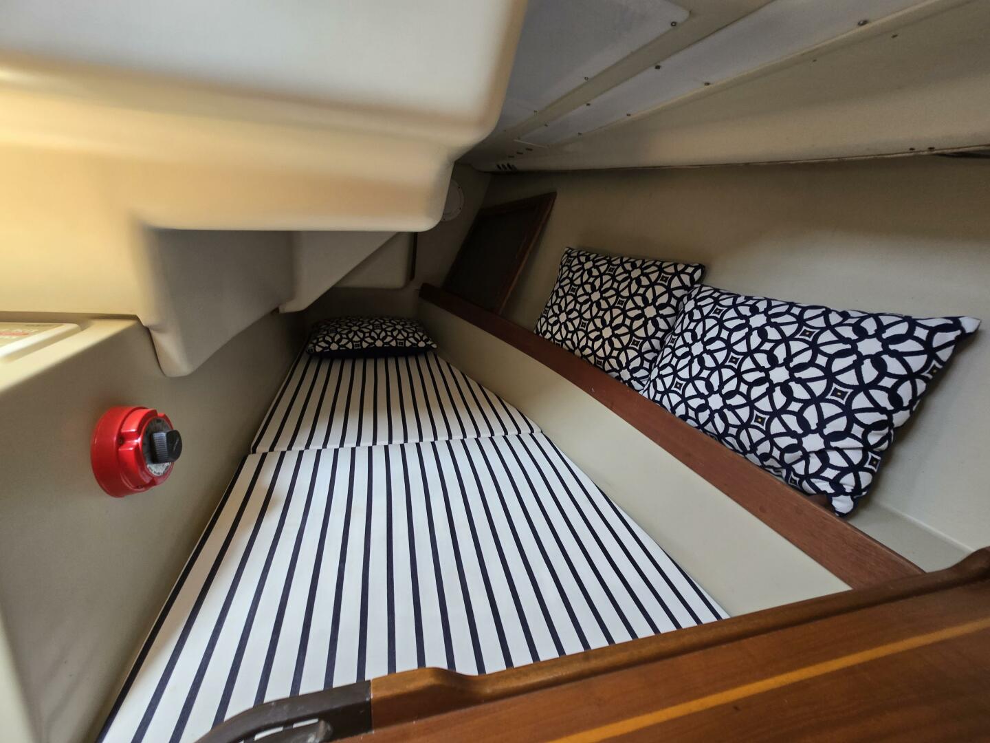 - Teak & holly style sole, custom cushions, folding dinette and cockpit tables.