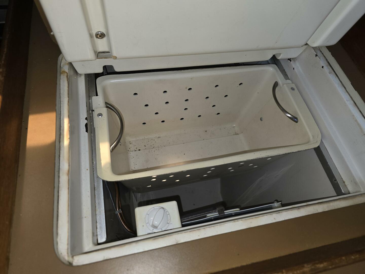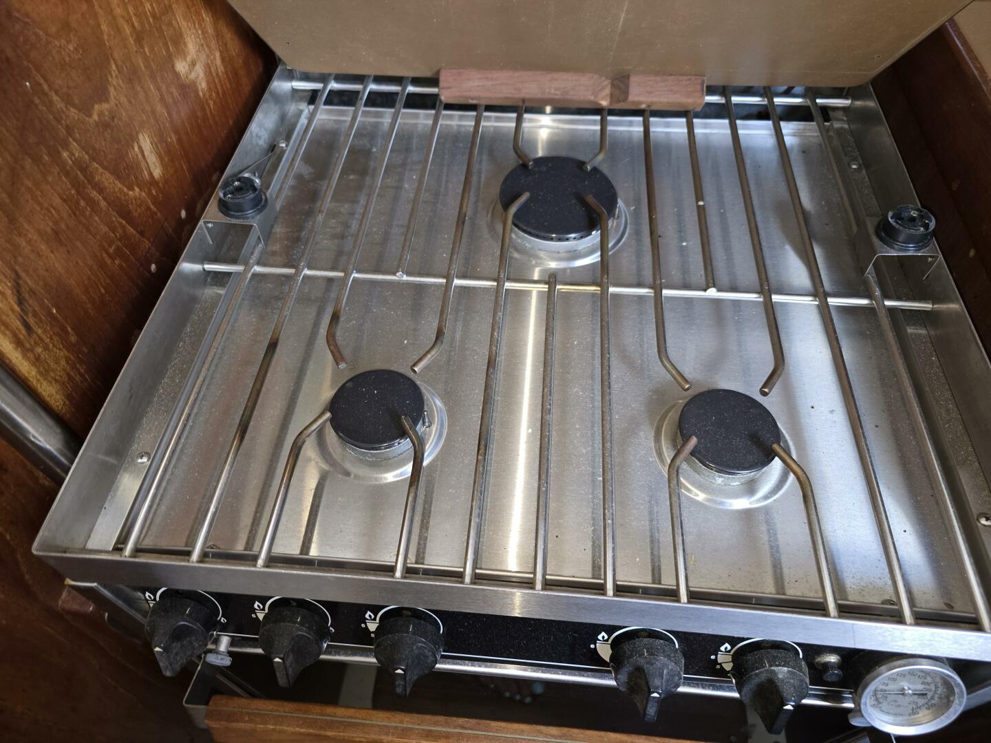 - Galley with Force 10 three-burner propane stove/oven, Nova Kool refrigeration, pressure water.