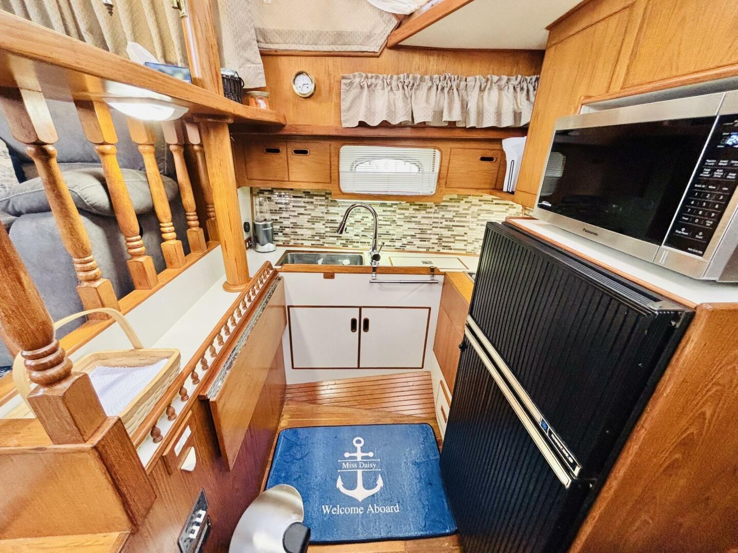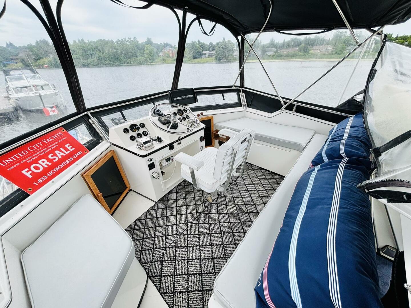 Topside, enjoy a large covered aft deck perfect for entertaining, plus a fully enclosed flybridge with excellent visibility. Powered by reliable twin gasoline engines and equipped with fore and aft thrusters, air conditioning, and more, this President 35 is ready for your next adventure.