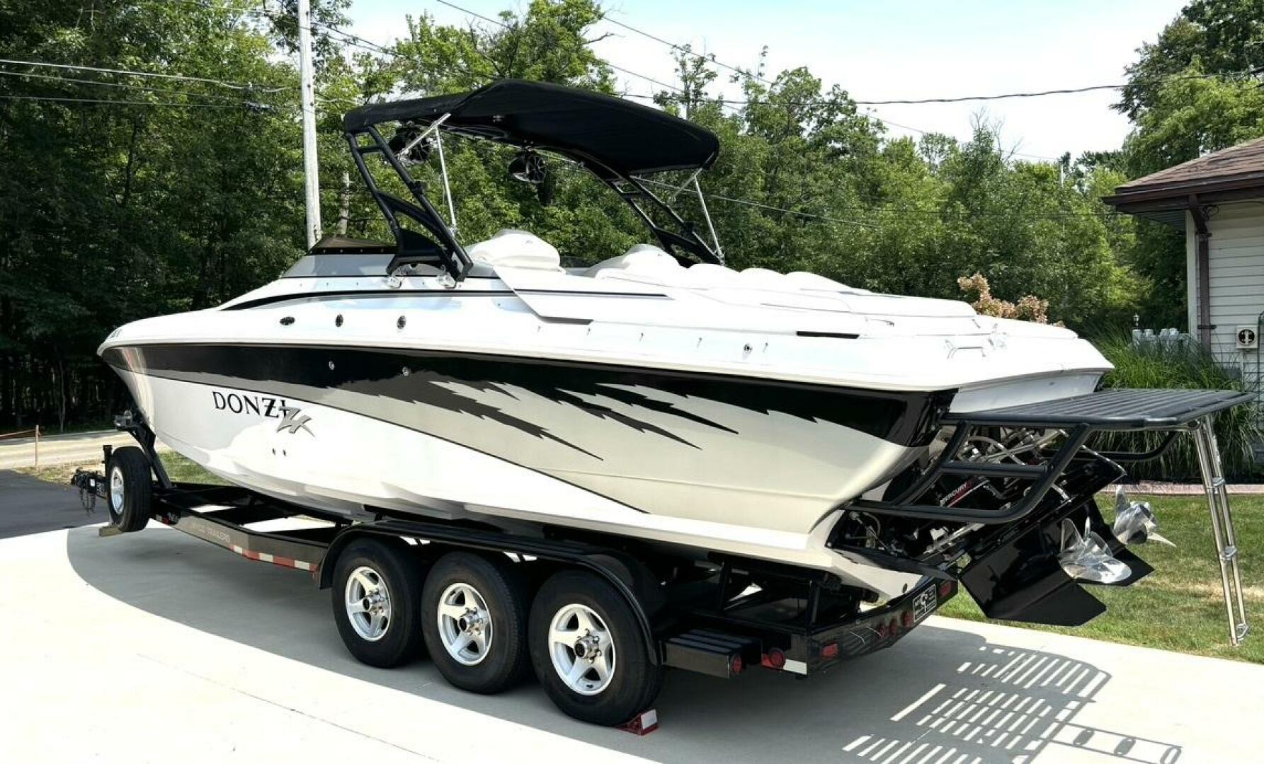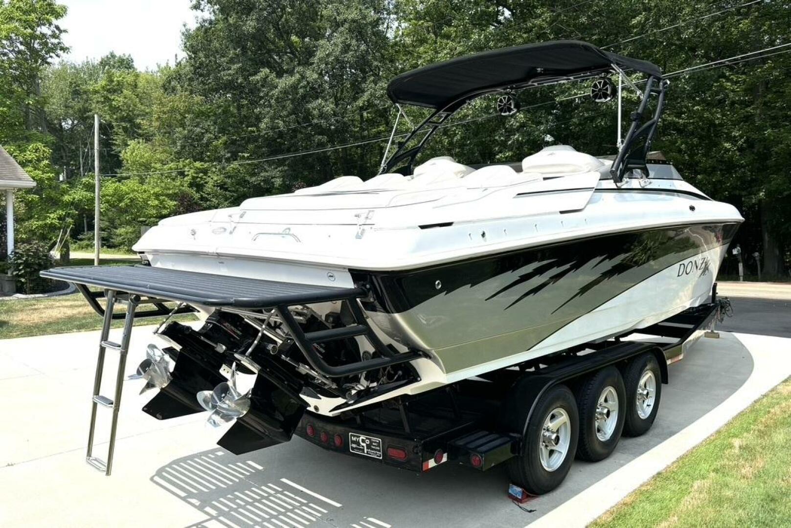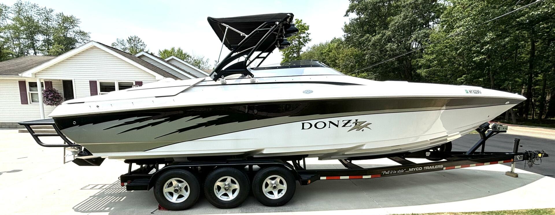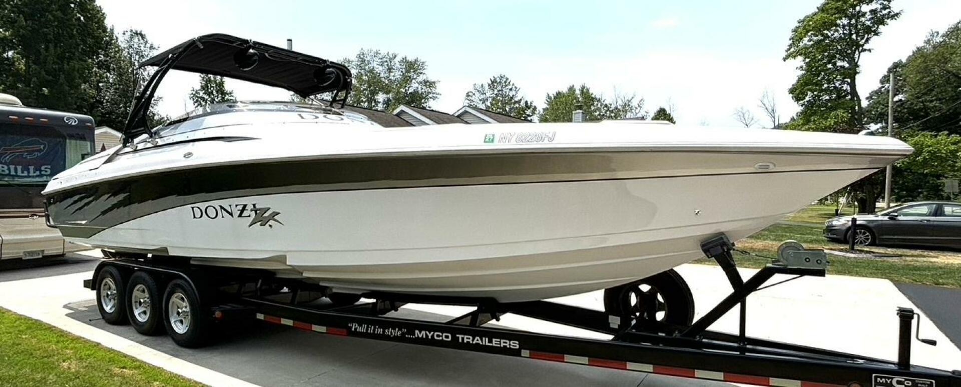 This Donzi 33ZX truly is in gorgeous condition and just absolutely beautiful to look at. Pride of ownership shows from the one owner. This is a fresh water only vessel and was never stored in water. Starting at the exterior, you will notice the 3 step hull, which performs great in rough choppy waters, has zero bottom paint and is just as shiny and clean as when she was new. The outdrives are immaculate, which have been upgraded to Bravo 1 XRs and both have less than 100 hours on them. You will notice some wonderfully functional and high end custom fabrications, such as the extended swim platform and the arch with built in extendable bimini and speaker mounts. Not only does the swim platform extend your entertainment space, but it also provides added protection for loved ones, as it fully covers the outdrives and props. The extendable bimini is a must have for protection and shade on those sunny, hot days. These amenities certainly create a beautiful dynamic between a day lounger and a need for speed go fast, which is what she was really built for! And with twin low hour (approximately 675 hours each) MerCruiser 496 MAG H.O.s, putting out 425HP each, she can certainly get up and go, getting you to 70+ MPH easily! Once on deck, you will find a beautiful ZX logo sun pad, McLeod power bolsters and footwells for when you are really throttled down, a fully upgraded stereo with amplifiers and subwoofers, and a full helm of goodies including your silent choice exhaust option. Venture into the galley and you will find it nicely equipped with a large fridge, sink & tap, microwave, enclosed head with shower, table with wrap around seating, and a large v berth. This vessel is regularly maintained, turn key and ready to rip! Comes with mooring cover and excellent condition Myco custom tri-axle trailer. Don't let this gem slip away, call today!