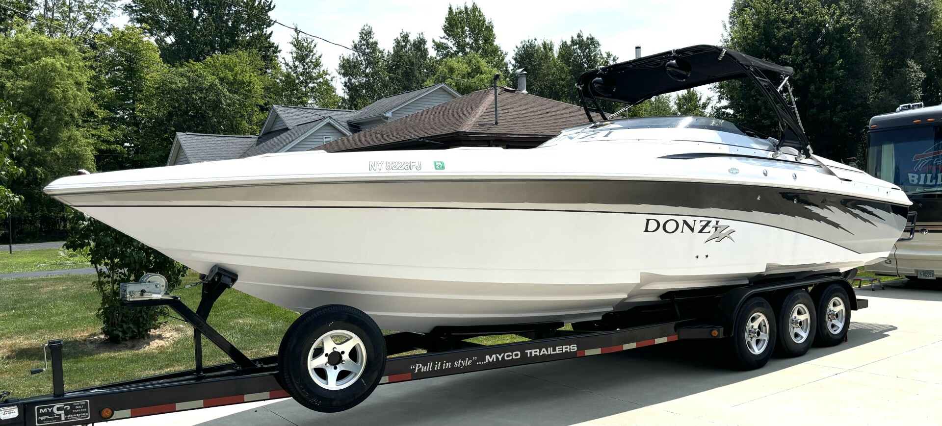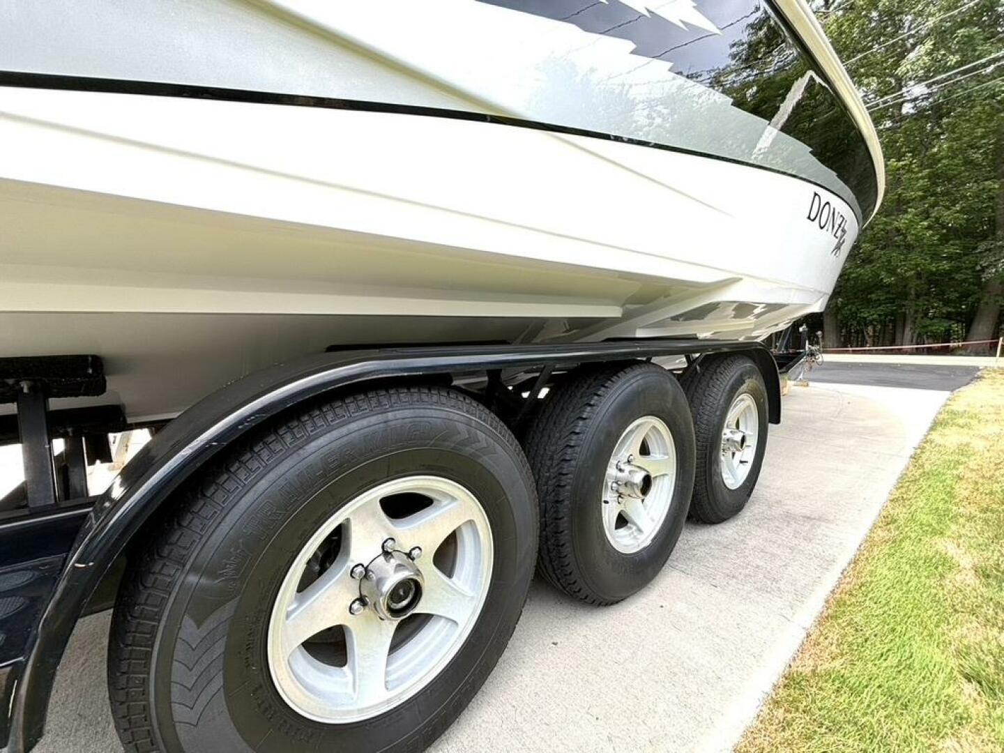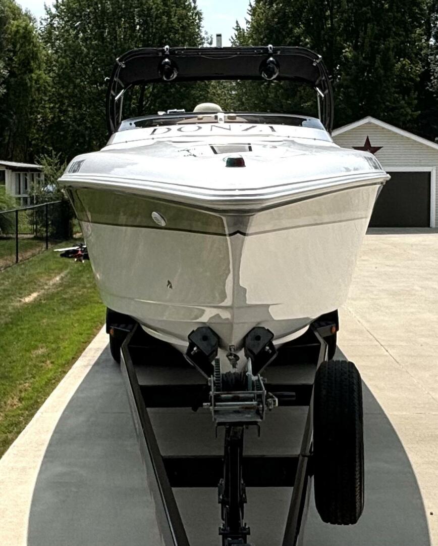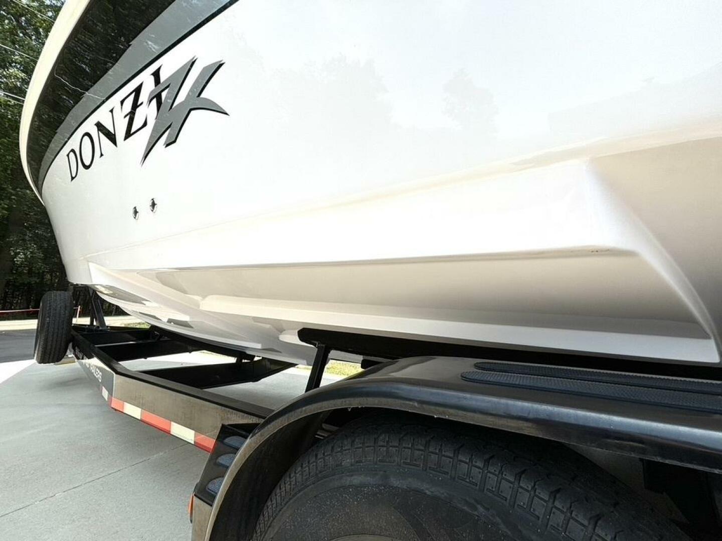 This Donzi 33ZX truly is in gorgeous condition and just absolutely beautiful to look at. Pride of ownership shows from the one owner. This is a fresh water only vessel and was never stored in water. Starting at the exterior, you will notice the 3 step hull, which performs great in rough choppy waters, has zero bottom paint and is just as shiny and clean as when she was new. The outdrives are immaculate, which have been upgraded to Bravo 1 XRs and both have less than 100 hours on them. You will notice some wonderfully functional and high end custom fabrications, such as the extended swim platform and the arch with built in extendable bimini and speaker mounts. Not only does the swim platform extend your entertainment space, but it also provides added protection for loved ones, as it fully covers the outdrives and props. The extendable bimini is a must have for protection and shade on those sunny, hot days. These amenities certainly create a beautiful dynamic between a day lounger and a need for speed go fast, which is what she was really built for! And with twin low hour (approximately 675 hours each) MerCruiser 496 MAG H.O.s, putting out 425HP each, she can certainly get up and go, getting you to 70+ MPH easily! Once on deck, you will find a beautiful ZX logo sun pad, McLeod power bolsters and footwells for when you are really throttled down, a fully upgraded stereo with amplifiers and subwoofers, and a full helm of goodies including your silent choice exhaust option. Venture into the galley and you will find it nicely equipped with a large fridge, sink & tap, microwave, enclosed head with shower, table with wrap around seating, and a large v berth. This vessel is regularly maintained, turn key and ready to rip! Comes with mooring cover and excellent condition Myco custom tri-axle trailer. Don't let this gem slip away, call today!