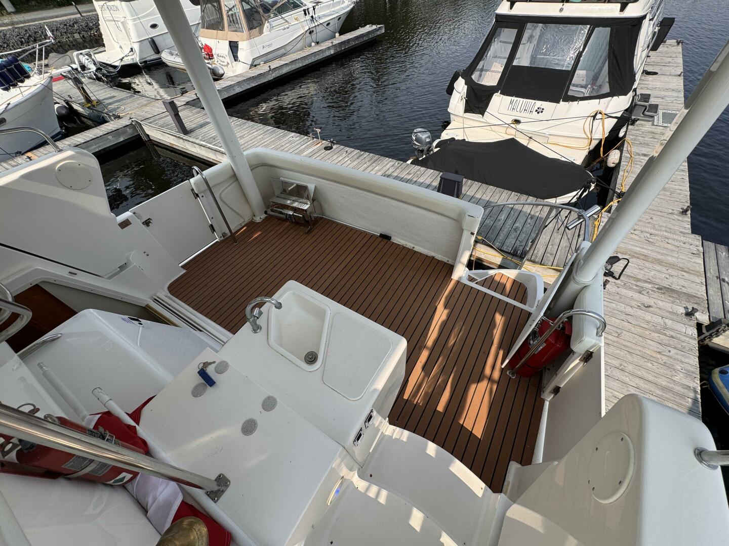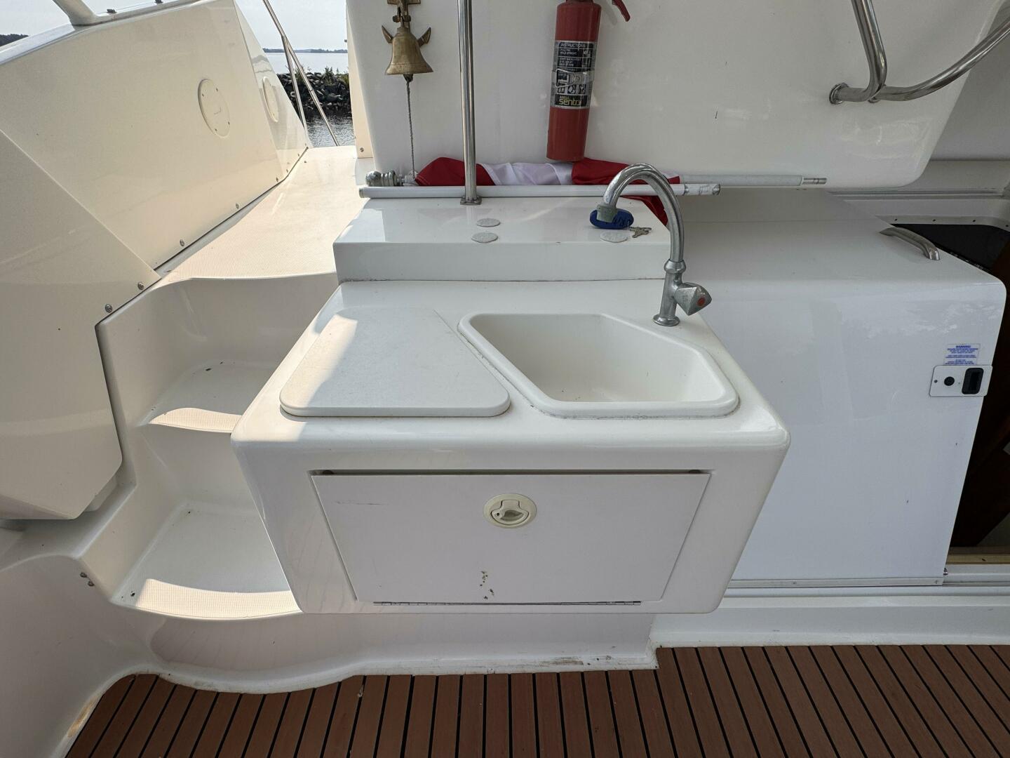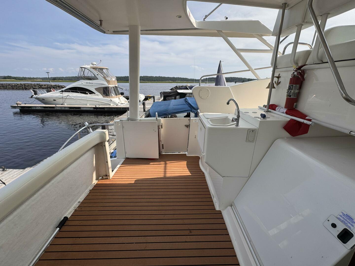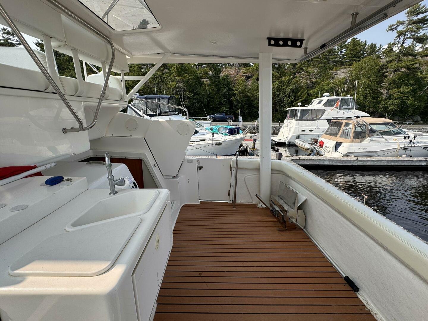 Topside, enjoy a fully enclosed flybridge and aft deck with updated SeaDek flooring, a cockpit sink, and easy access to the molded-in swim platform.