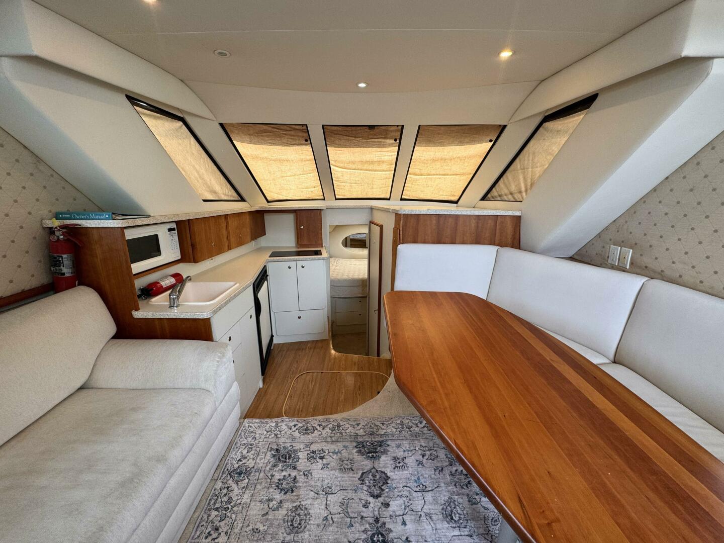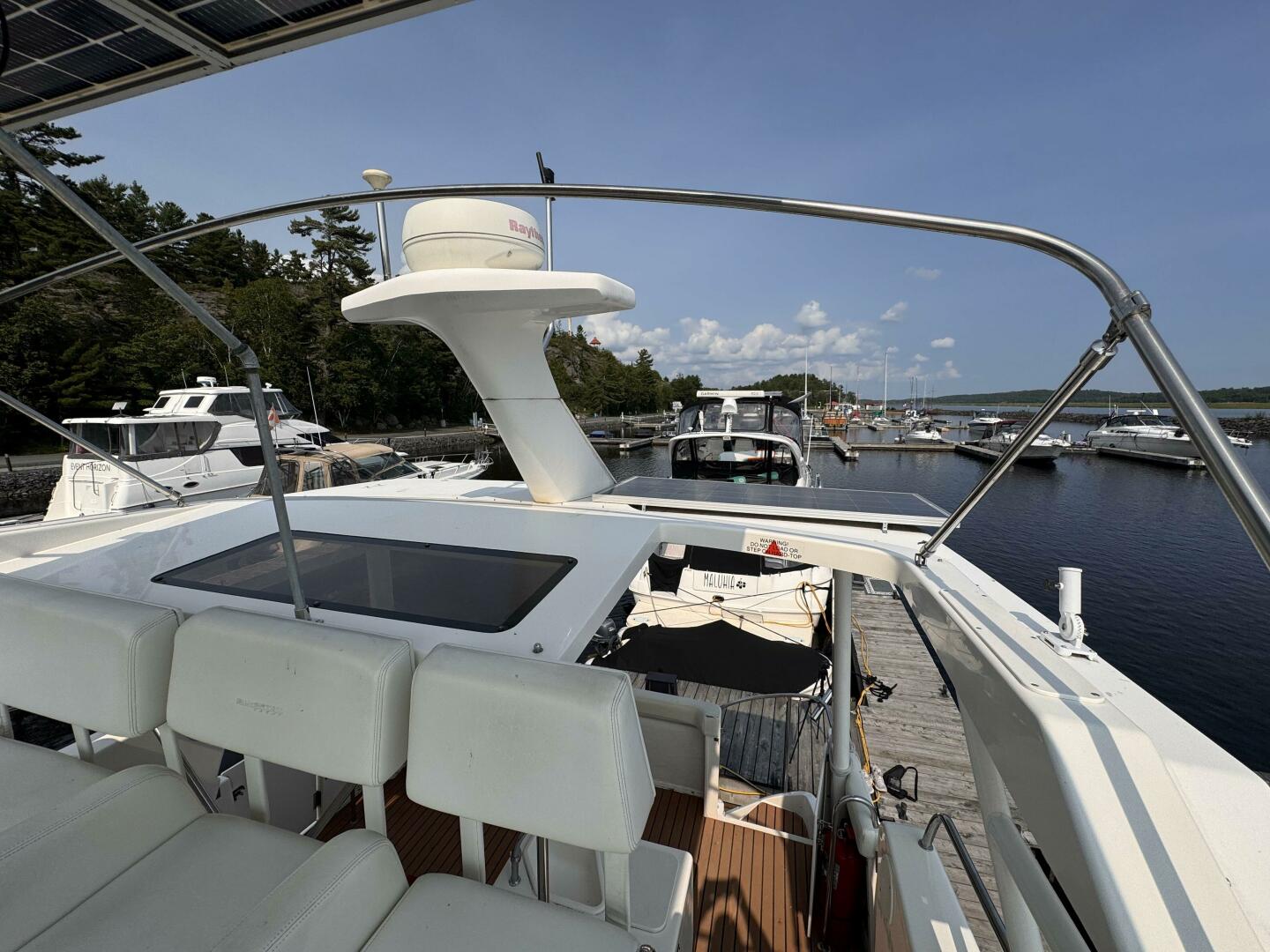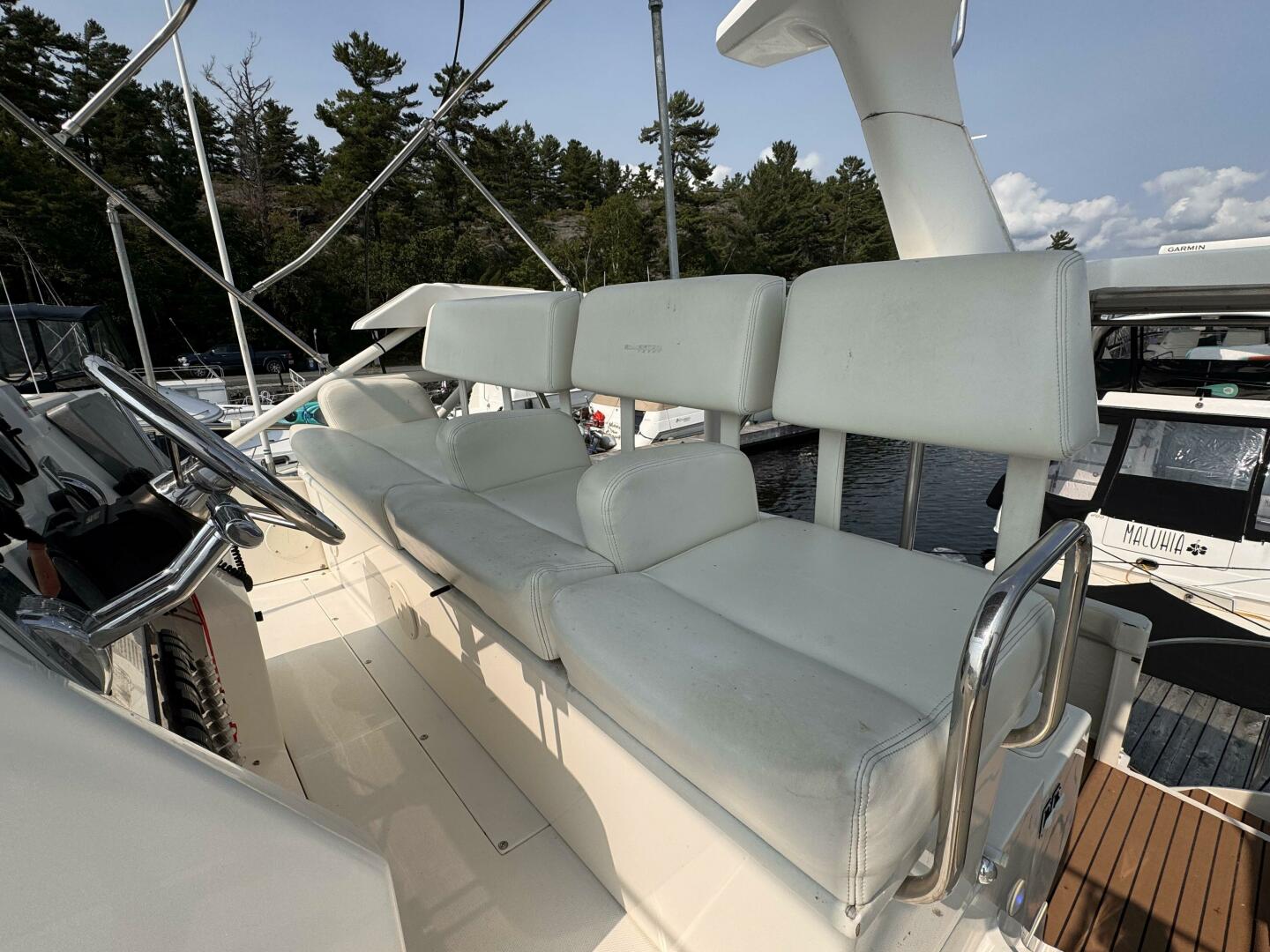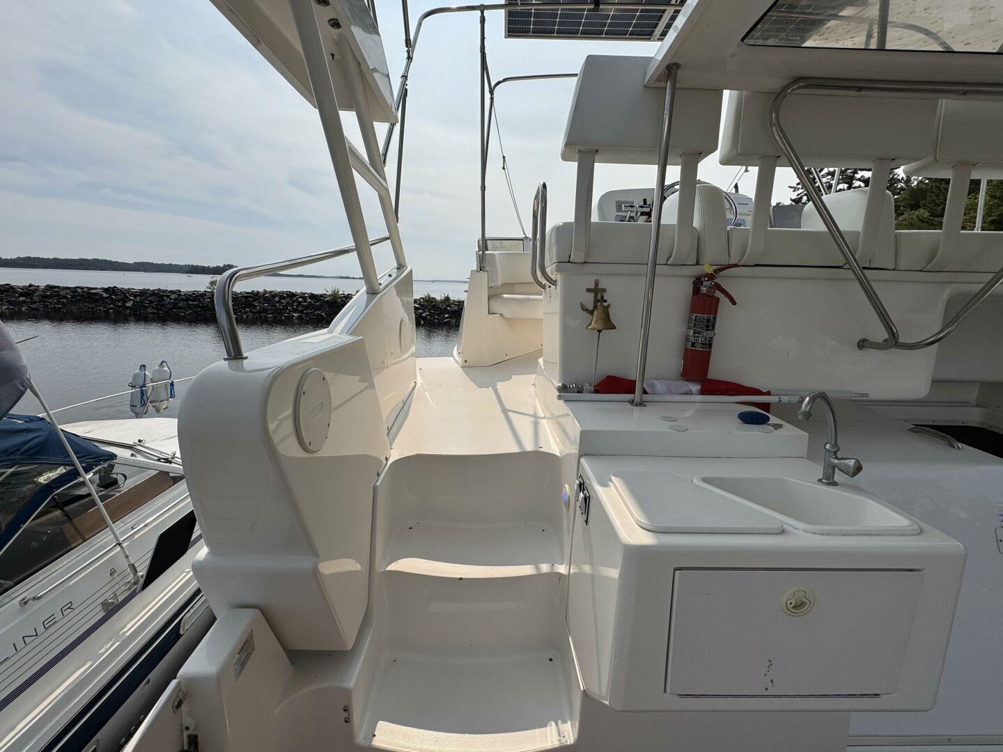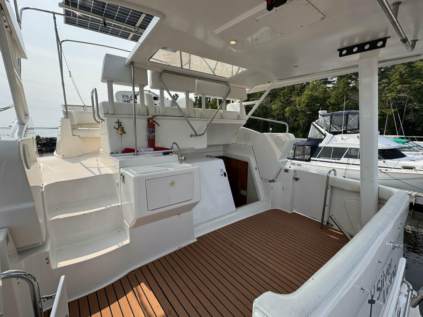 Topside, enjoy a fully enclosed flybridge and aft deck with updated SeaDek flooring, a cockpit sink, and easy access to the molded-in swim platform.