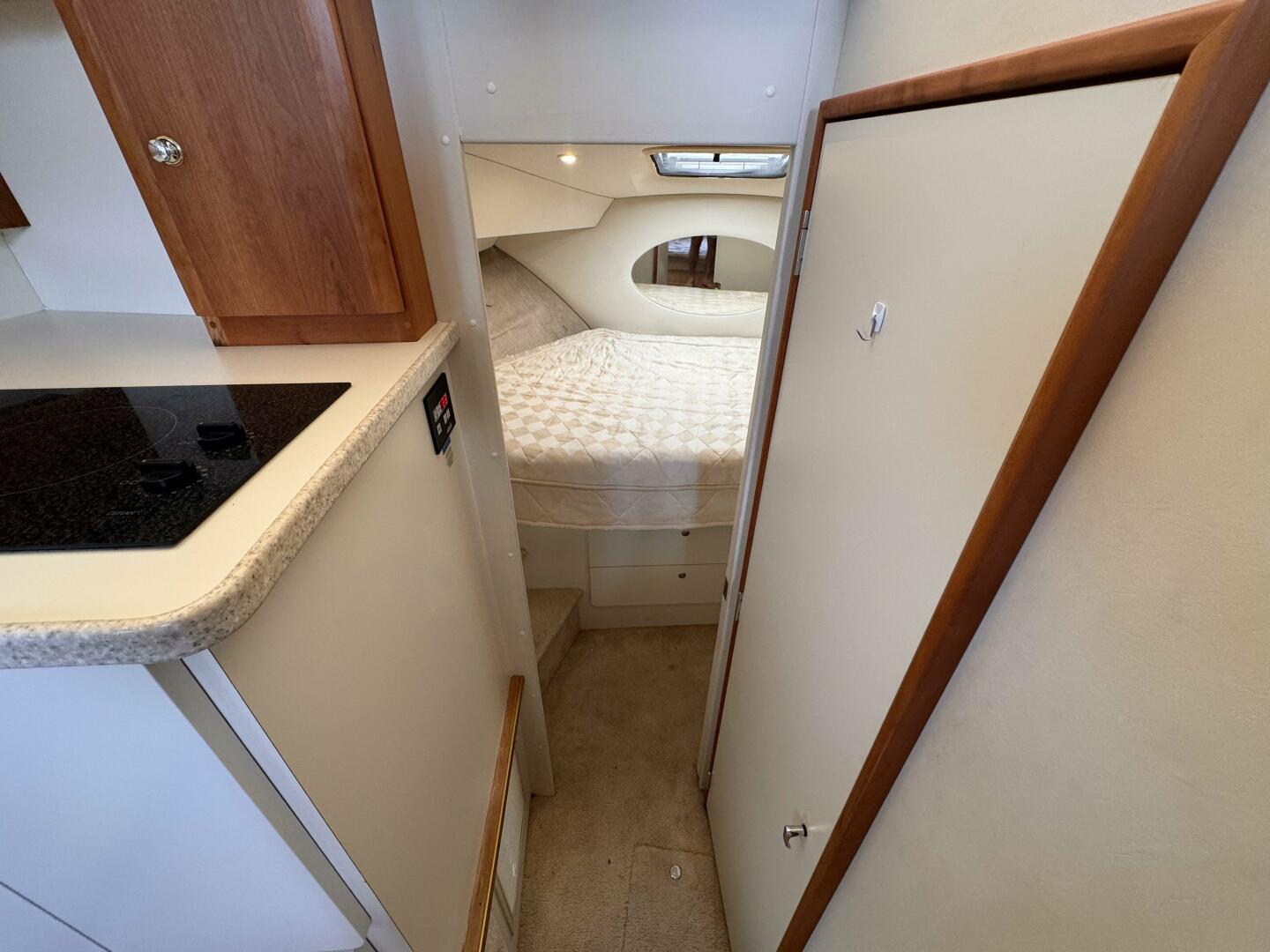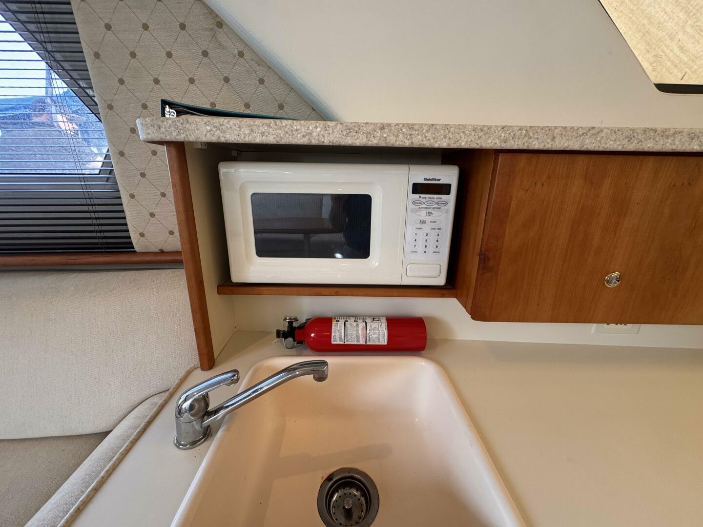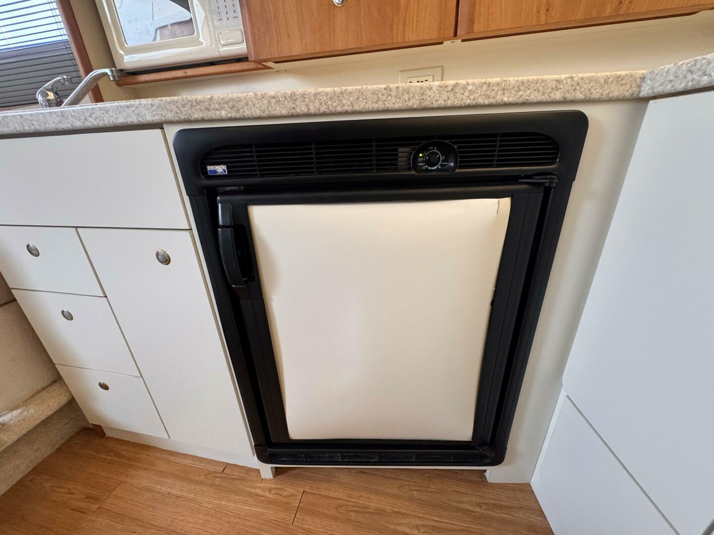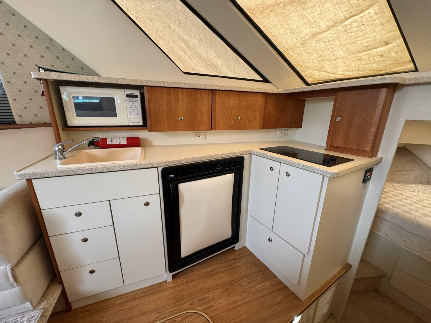 The galley is fully equipped with a 2-burner stove, oven, microwave, and fridge/freezer, making extended stays onboard comfortable and convenient.