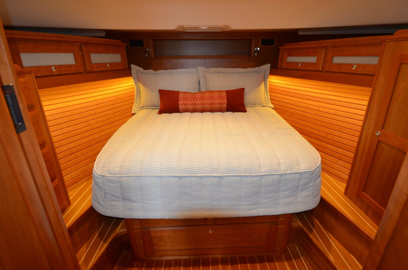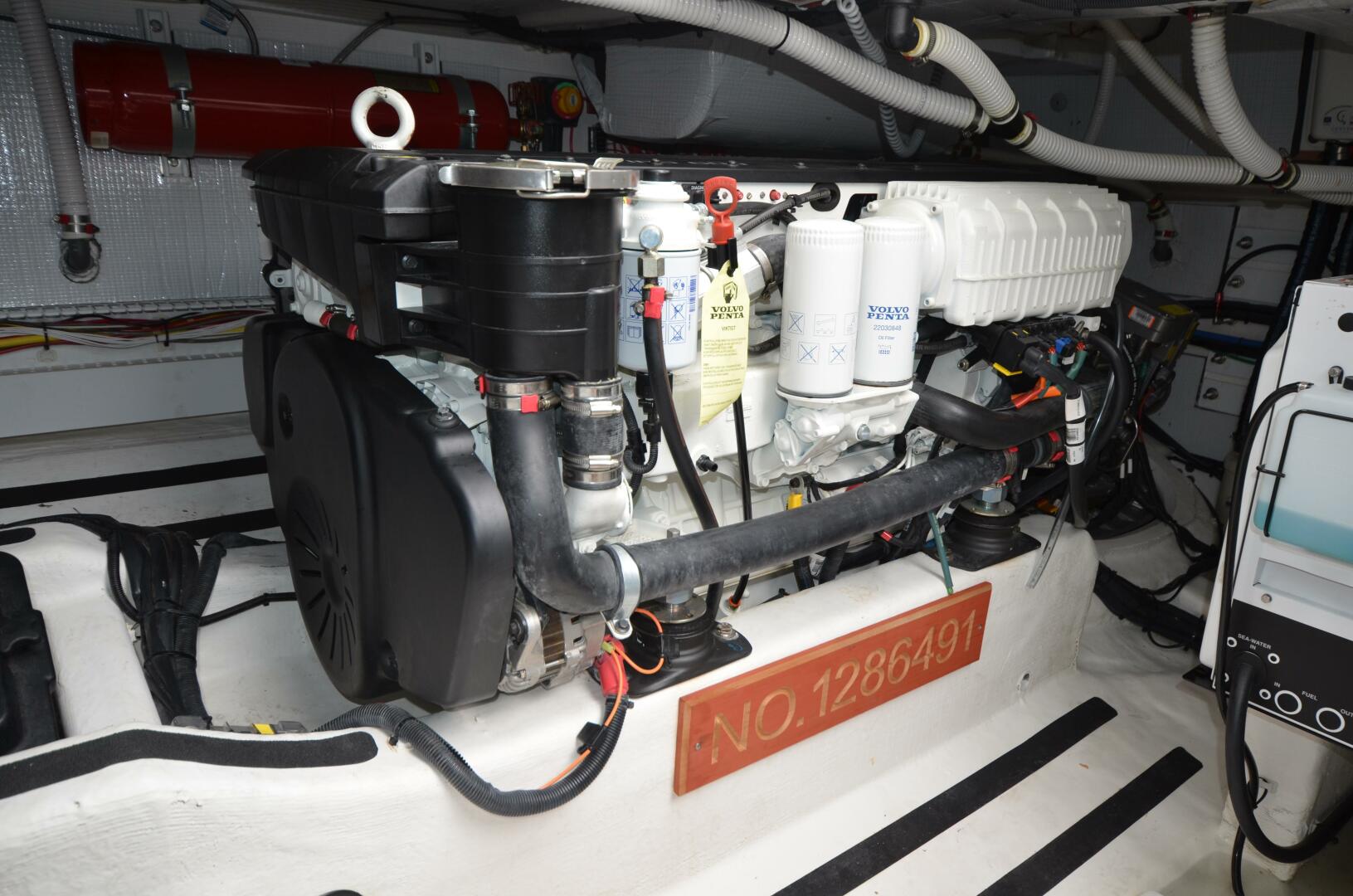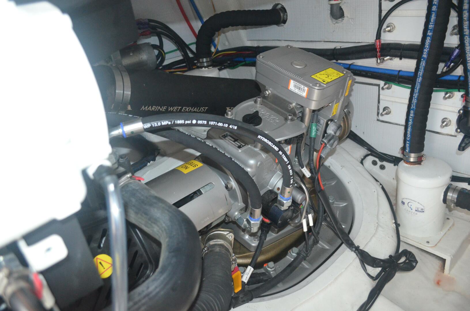 Over the last fifteen years, the Sabre range of Salon Express motor yachts has redefined the Downeast style boating market. Unlike typical express cruisers, which tend to go out on those all- -too rare perfect days, owners of the salon express style can enjoy boating each and every day of the season, tucked in the comfort and quiet of a climate controlled interior. An abundance of light and air enter the main salon through large opening windows, overhead hatches, an aft swing door and an electrically controlled drop-down window. The standard helm door offers the helmsperson immediate access to the side deck. Her helm is equipped with Volvo’s Glass Cockpit system offering two Multi Function Displays. Two full staterooms, each with their own head and stall shower, are located on the lower level. The master stateroom forward is a quiet oasis for her owner and offers many drawers and lockers for best-in class stowage capacity. Guests will enjoy their own private stateroom to starboard. The attached guest head is accessible the companionway. Opposite the guest stateroom to port is the full galley with all of the right appliances for the preparation of gourmet meals aboard. A unique feature of the Sabre 45 is the large utility space below the main salon sole where optional equipment such as washer, dryer, additional fridge or freezer or perhaps a wine cooler can be situated Her cockpit is an inviting space where the crew can relax underway and where everyone can gather at the end of a great day on the water. An optional Sureshade can be fitted at the yard. Nautical sensibilities are important elements of each Sabre design. Safety and security play a large part in the design of our decks. An aggressive anti slip pattern in the fiberglass, hand holds above the windows, large diameter perimeter rails and a wide foredeck, all provide a sense of security for the crew. The optional Seakeeper is located on centerline as seen here in this bright and well planned engine room.