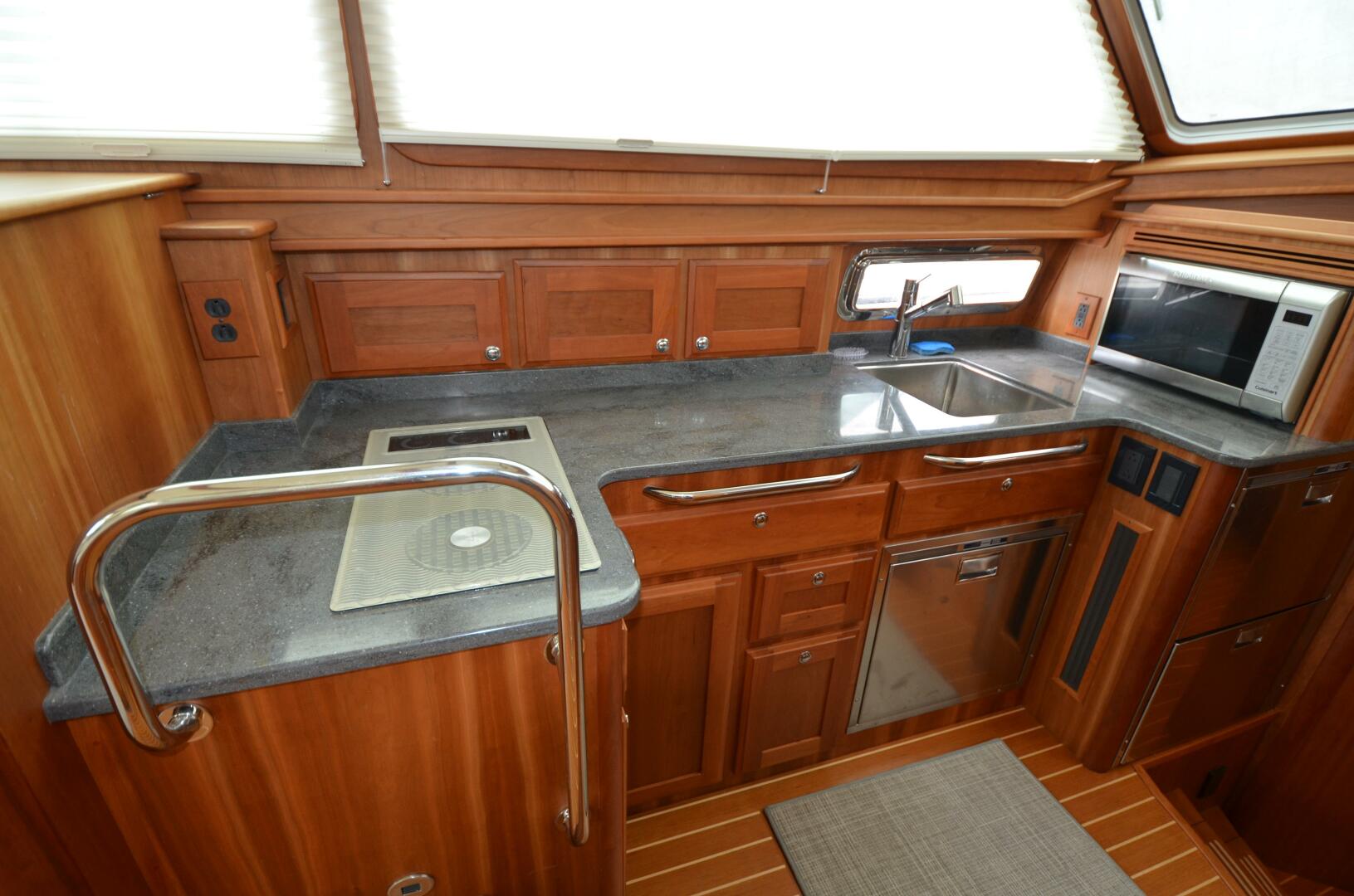 The half-up galley boasts Lava Rock Corian countertops, induction cooking, a convection microwave, and ample refrigeration. Below, two staterooms and two heads provide private comfort—highlighted by a convertible guest berth and a master suite with ensuite head and shower.