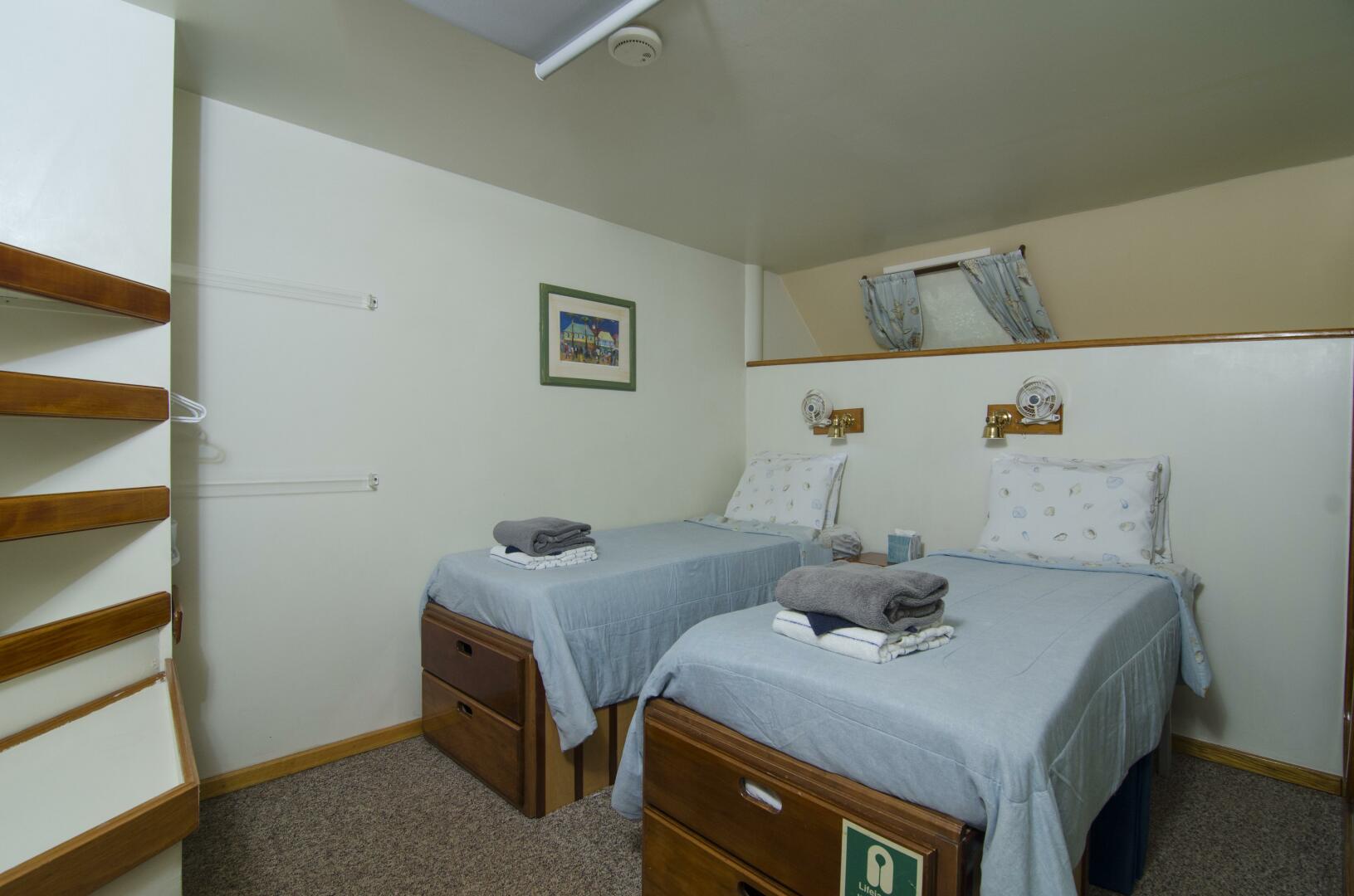 - Cabin sole carpeted in light purple/beige (guest areas)