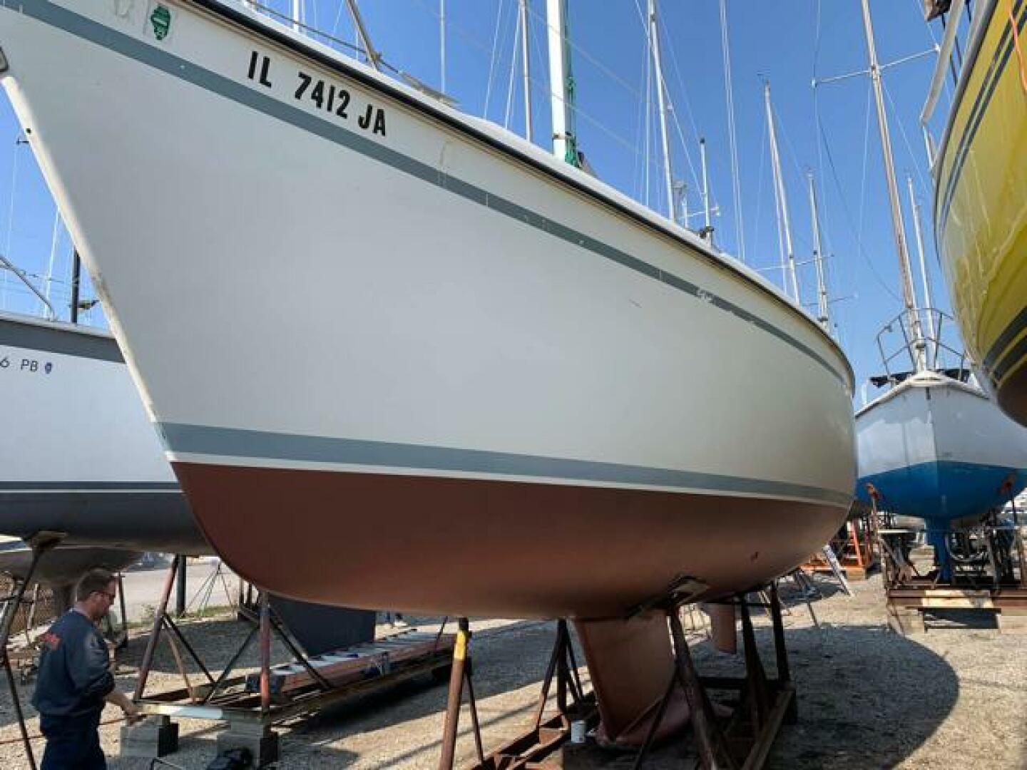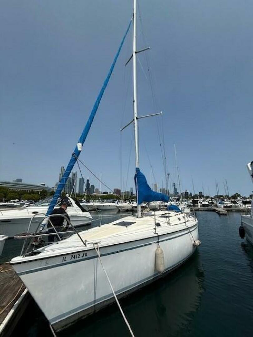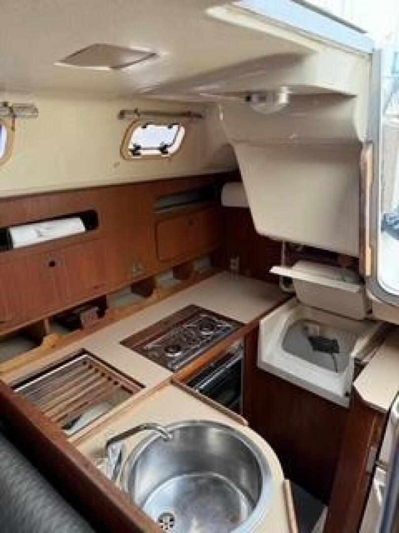 The 1988 Hunter 33.5 is a recreational keelboat designed for cruising, built by Hunter Marine in the United States from 1987 to 1994. It features a fractional sloop B&R rig, a raked stem, a walk-through reverse transom, and an internally-mounted spade-type rudder controlled by a wheel. The boat is