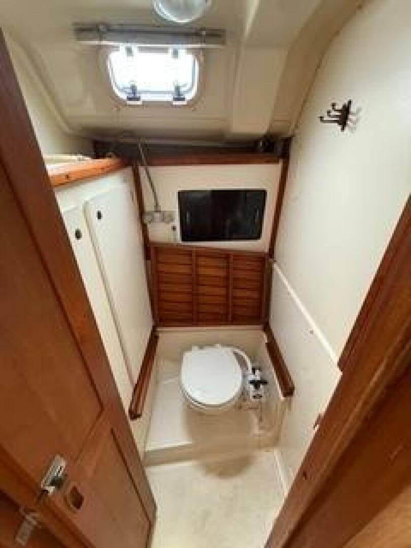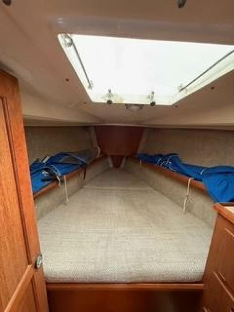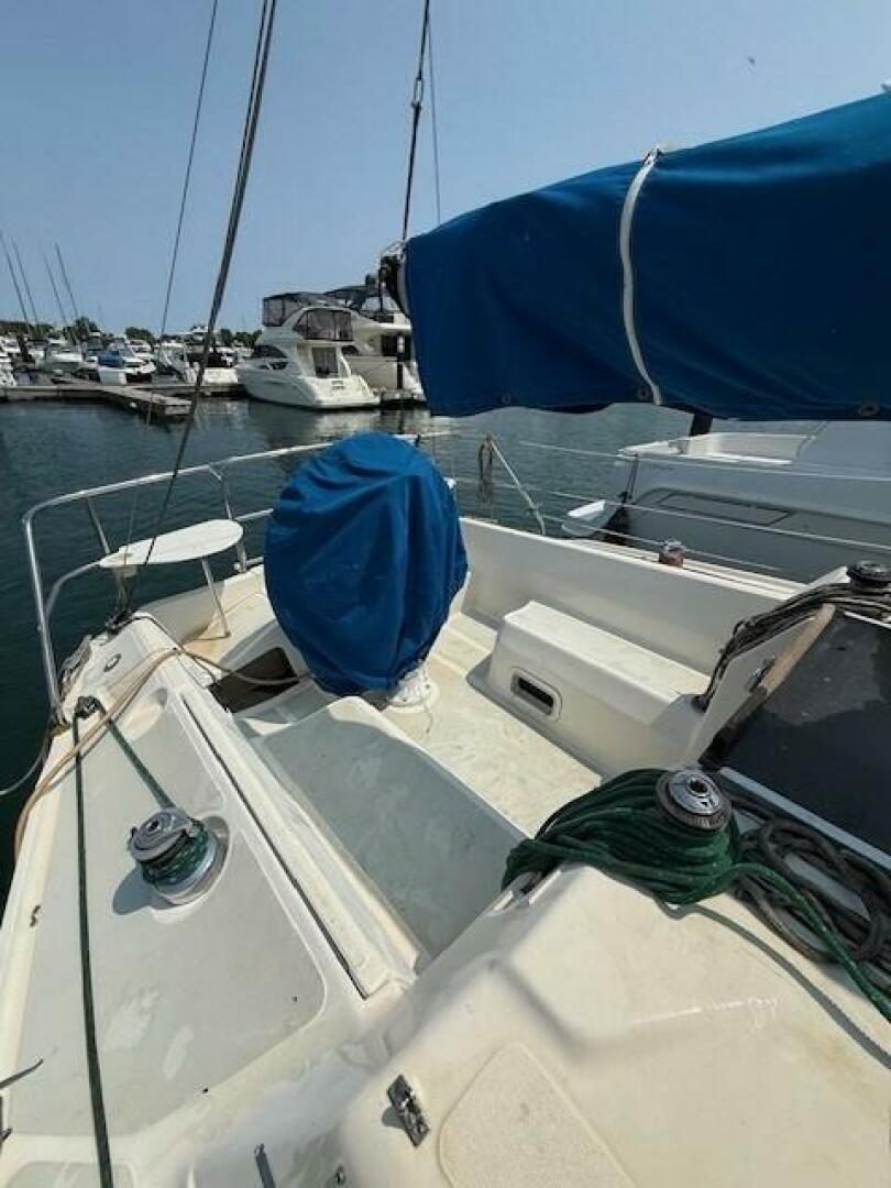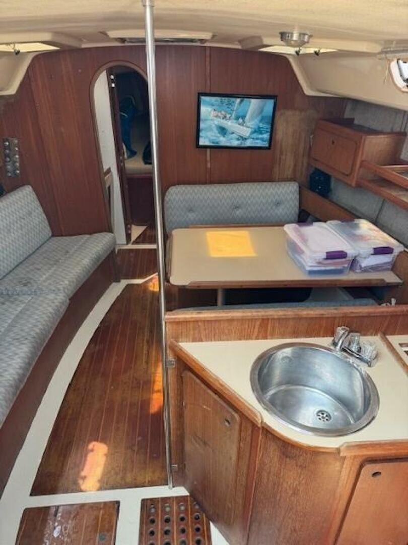 The 1988 Hunter 33.5 is a recreational keelboat designed for cruising, built by Hunter Marine in the United States from 1987 to 1994. It features a fractional sloop B&R rig, a raked stem, a walk-through reverse transom, and an internally-mounted spade-type rudder controlled by a wheel. The boat is