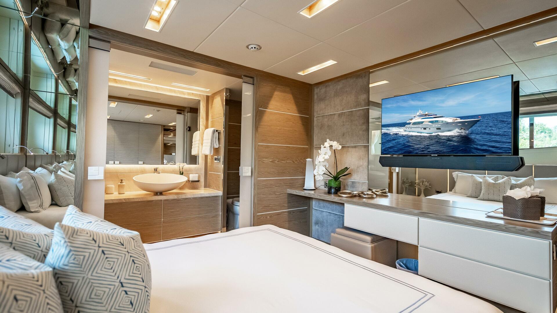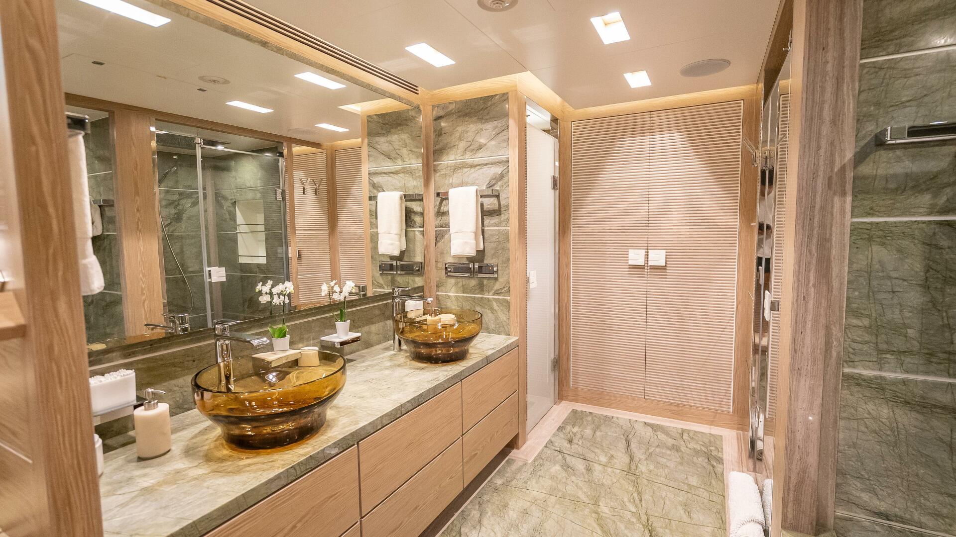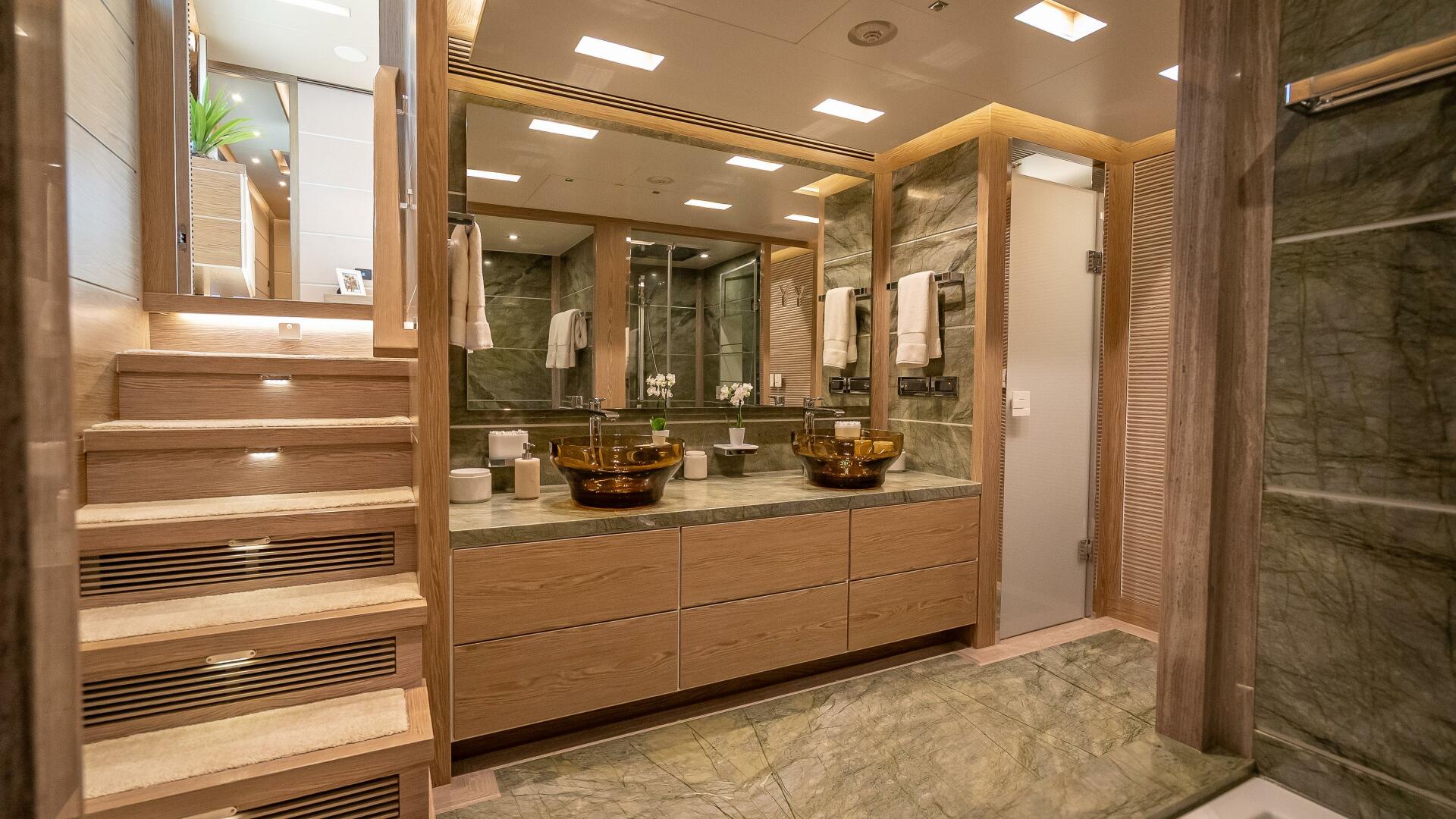 From the dining room, a starboard-side passageway leads forward through the main-deck foyer and beyond to the on-deck master. Here, a split-level design wows with breathtaking views and plenty of light flowing in from the upper level. A King-sized bed, mirror-embedded LCD TV, along with soft furnishings and accessories in this light, neutral Gray-toned wood, with hints of green and metallic tones, lend a contemporary elegance to the bedroom. On the lower level, the master en suite head features a striking emerald green marble for the floor and walls and is fitted with two sinks, Jacuzzi, shower and tub.