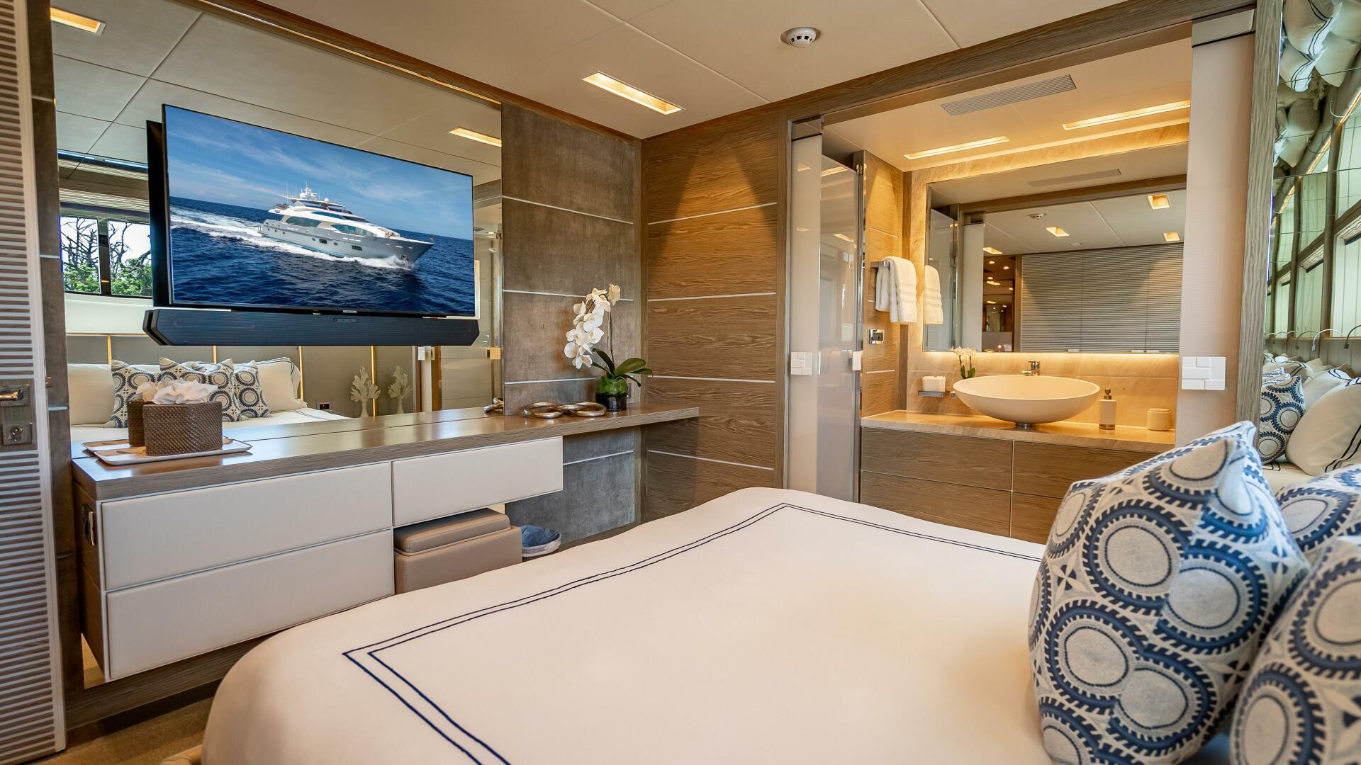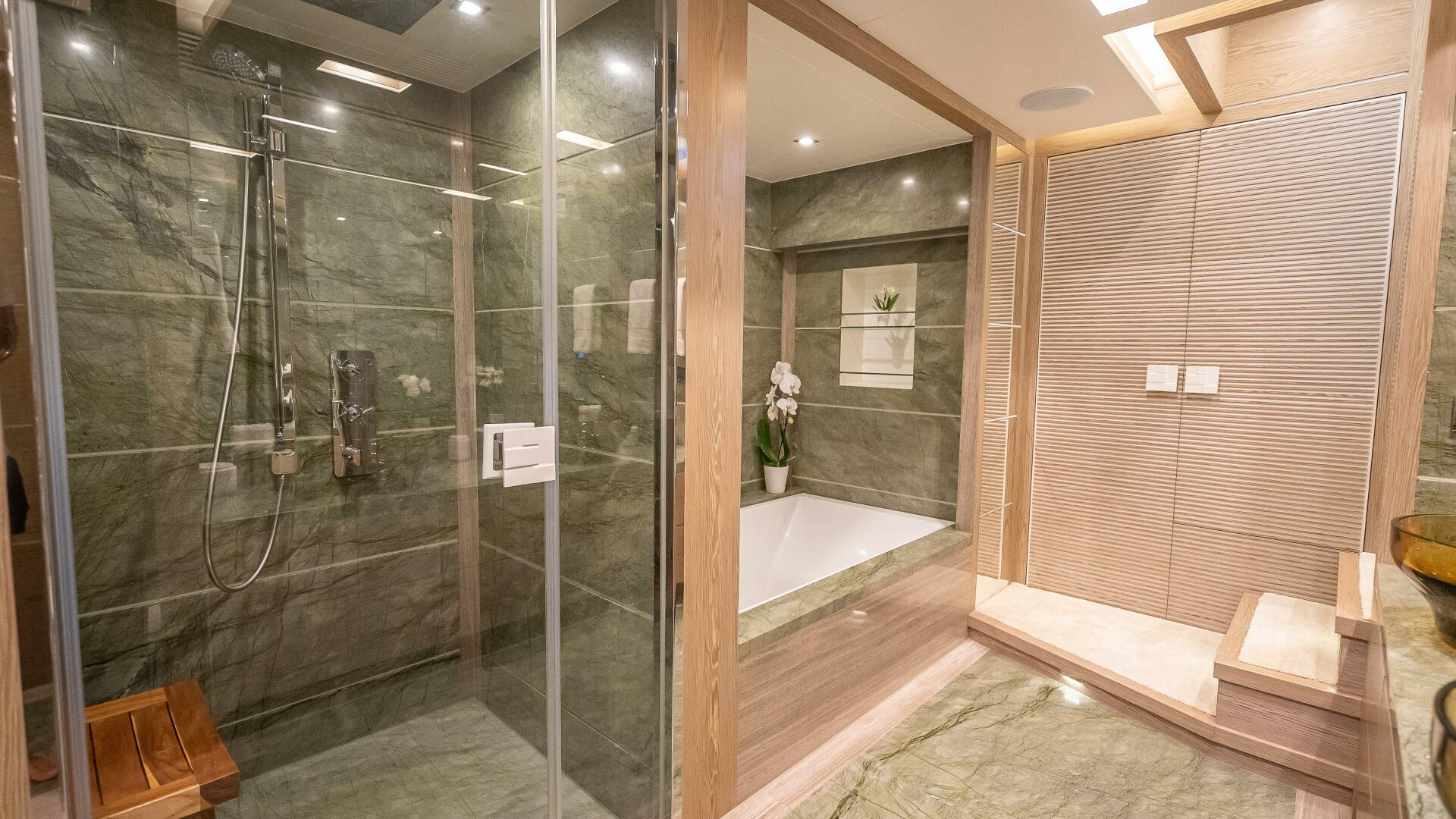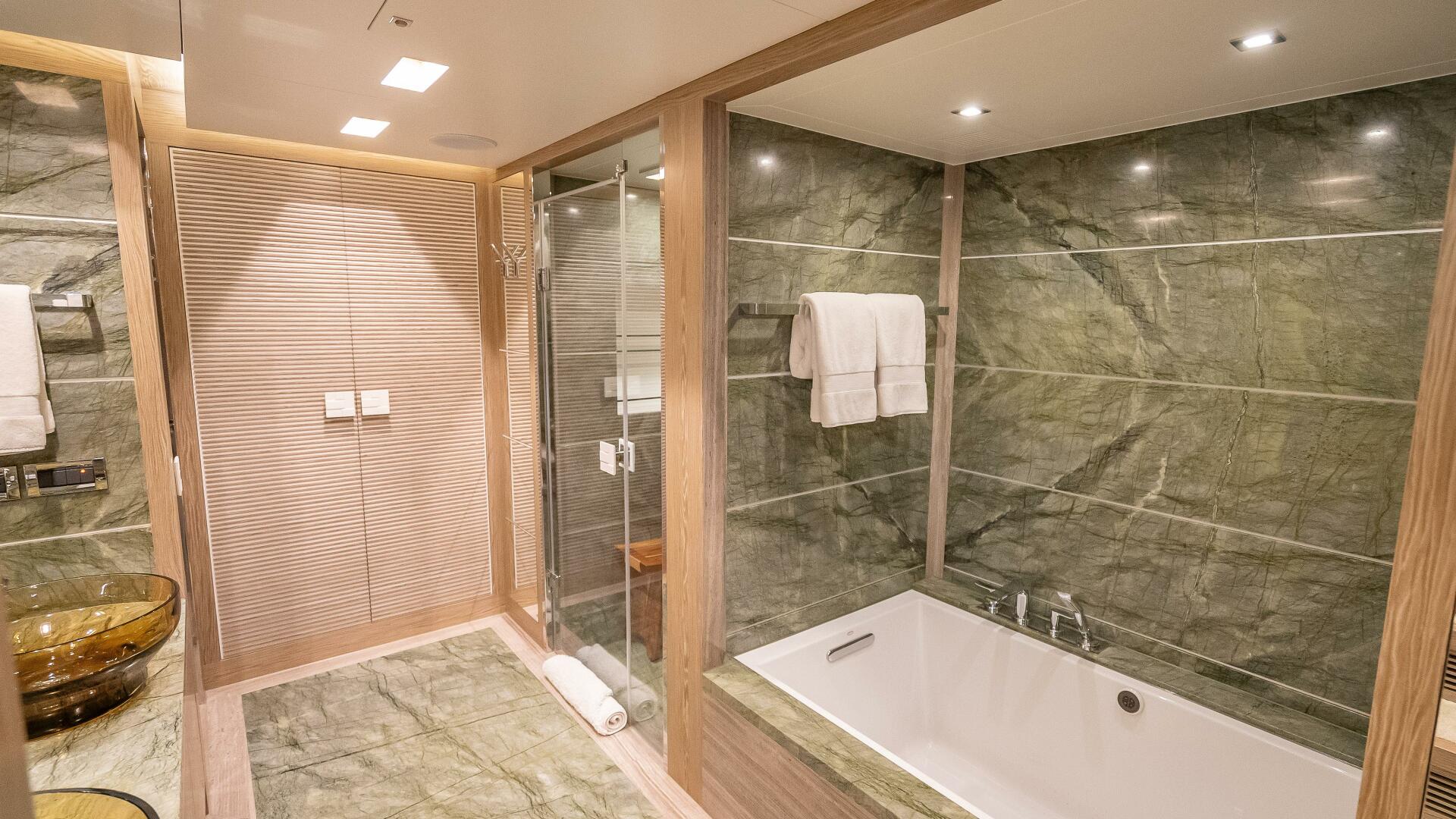 From the dining room, a starboard-side passageway leads forward through the main-deck foyer and beyond to the on-deck master. Here, a split-level design wows with breathtaking views and plenty of light flowing in from the upper level. A King-sized bed, mirror-embedded LCD TV, along with soft furnishings and accessories in this light, neutral Gray-toned wood, with hints of green and metallic tones, lend a contemporary elegance to the bedroom. On the lower level, the master en suite head features a striking emerald green marble for the floor and walls and is fitted with two sinks, Jacuzzi, shower and tub.