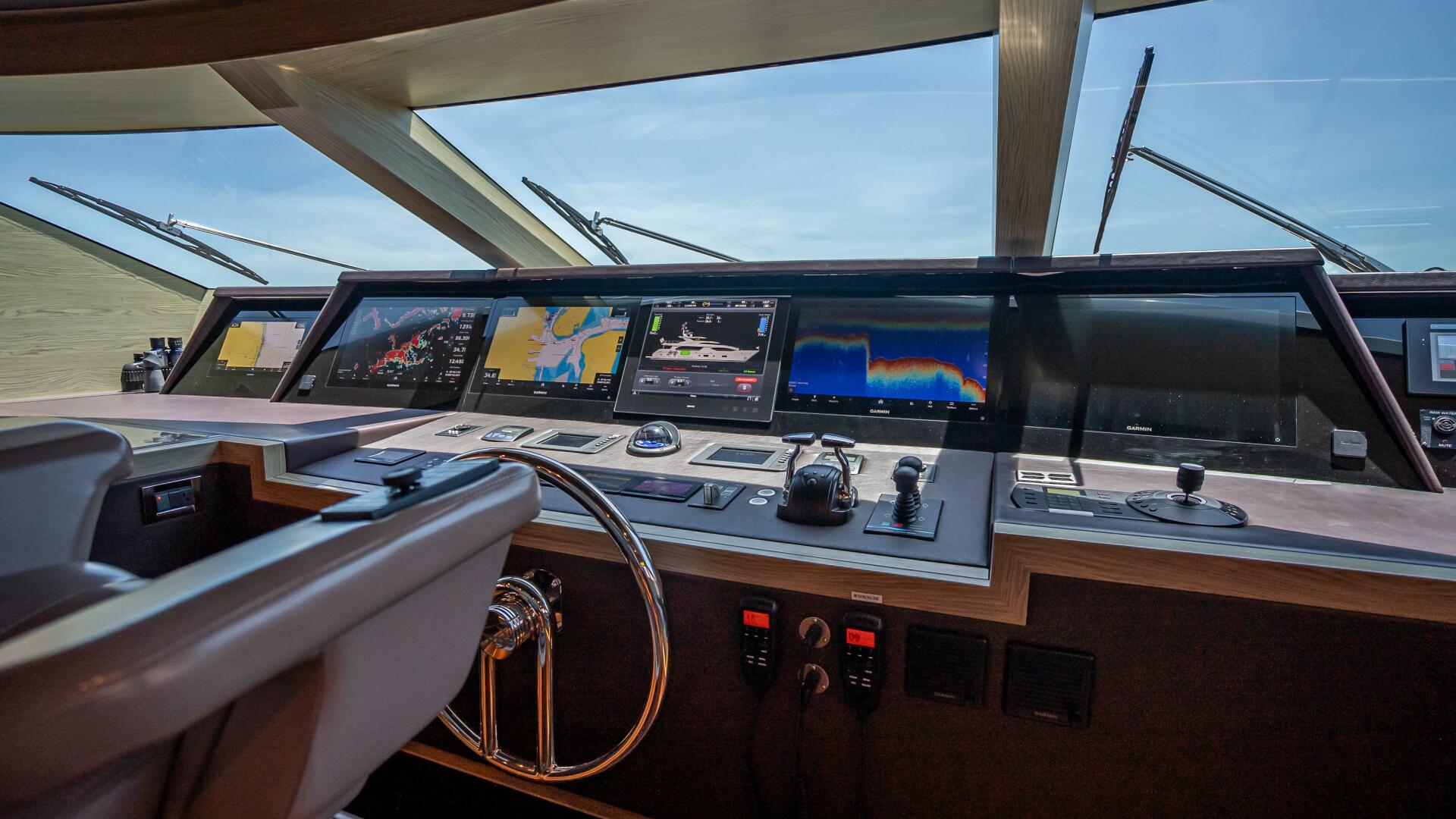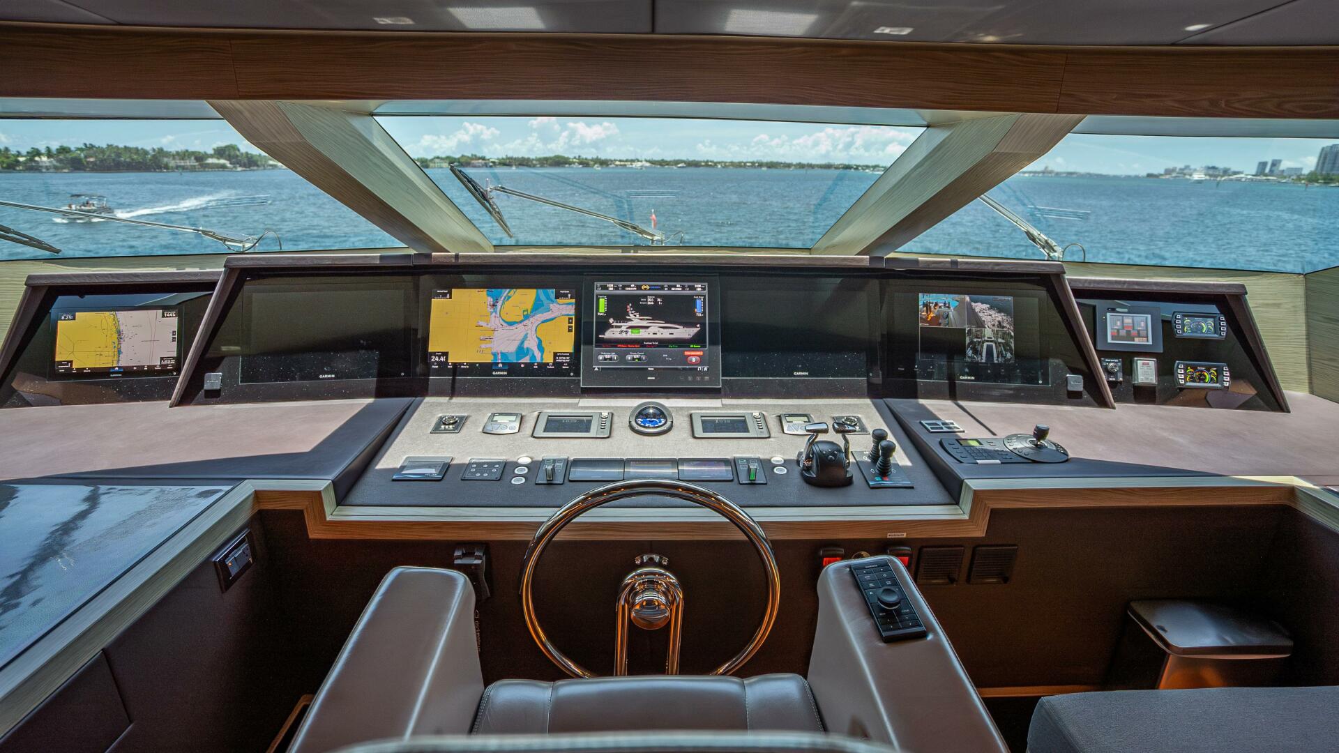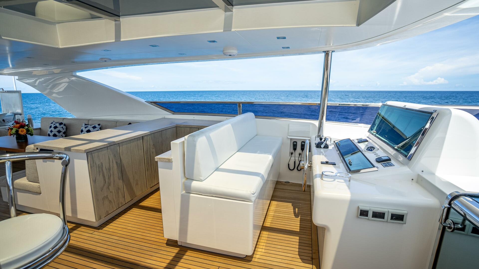 The pilothouse is finished in complementing light and dark color oak wood. It features a panoramic dashboard displaying all systems and controls to manage and monitor this RP120’s stellar features, such as the Boening monitoring system, Garmin navigation, satellite TV systems and Wi-Fi wireless network environments. A stepped overhead provides additional headroom in this space, which also offers an dual L-shaped seating area for owners and guests who wish to observe the action while underway.