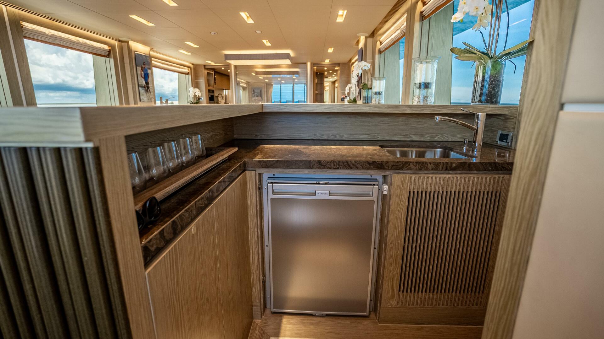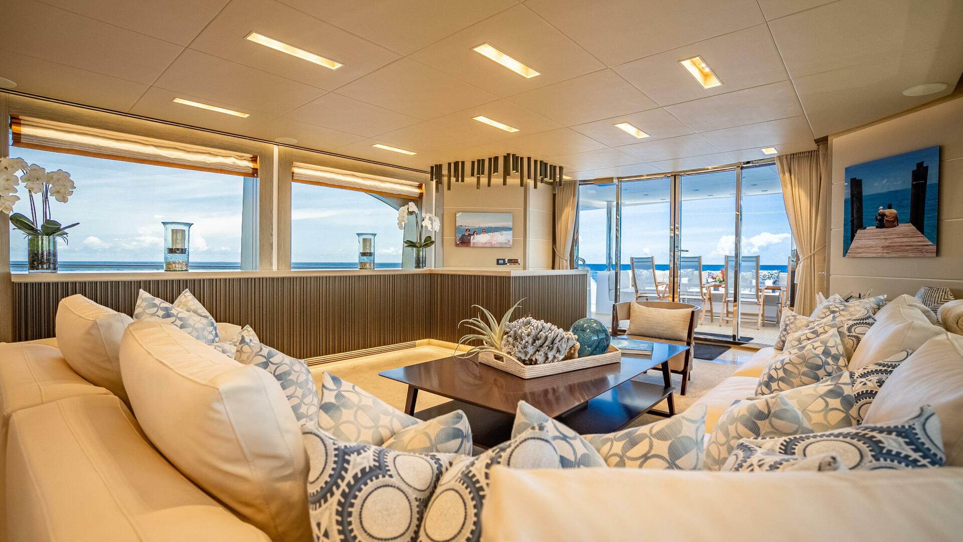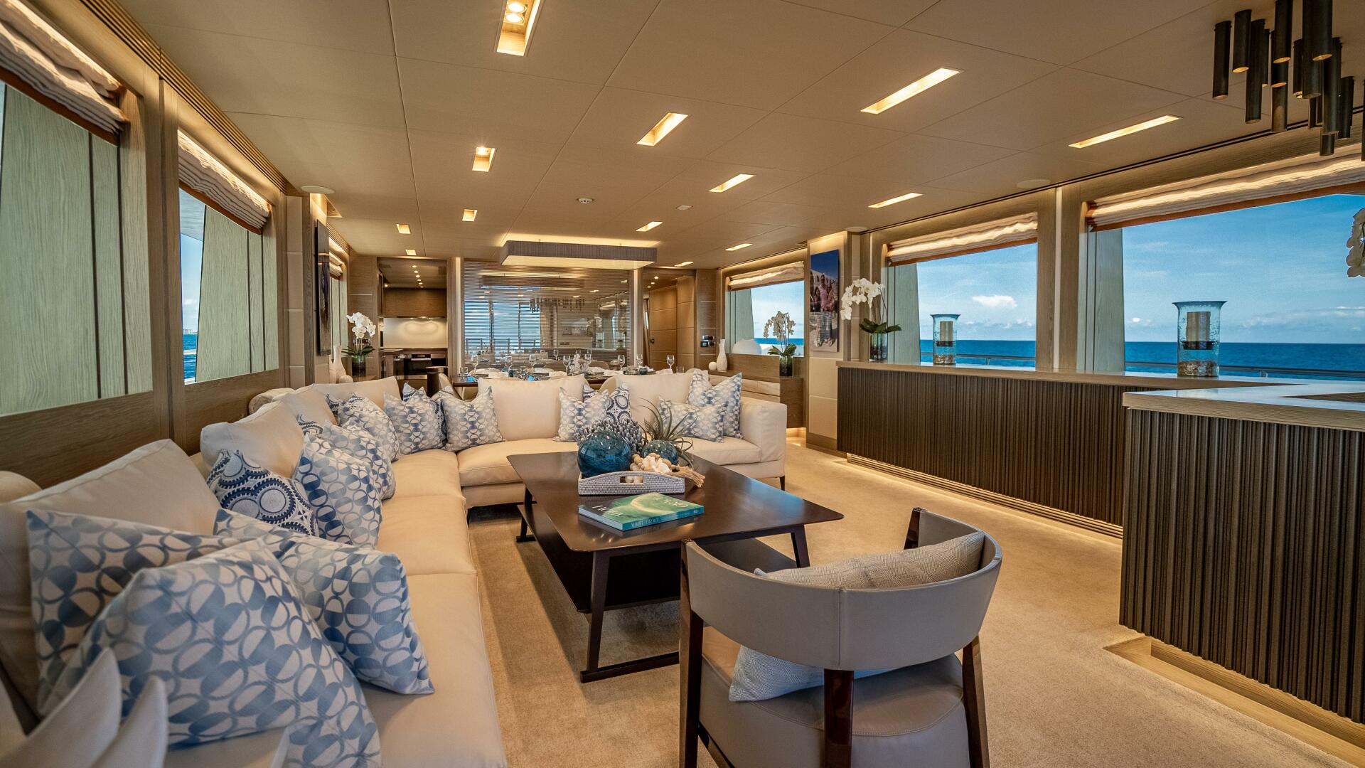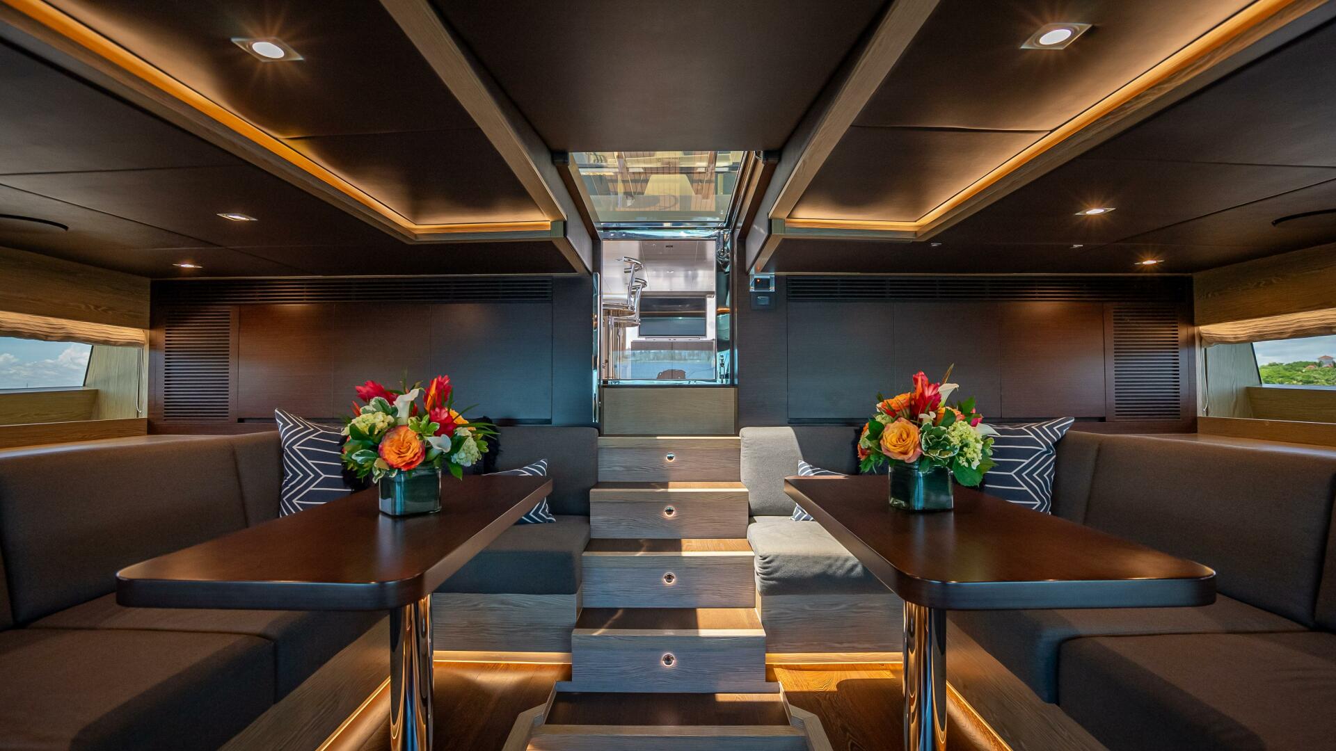 Highlighted by large windows that invite plenty of natural light, the main salon welcomes guests with a bar area in the aft foyer. This unique three-dimensional bar is set off by a custom overhead lighting installation comprised of small, oxidized metal pipes. A relaxing lounging area is situated just forward and is complemented by a 65” lifting TV and home theater system. A day head is conveniently located to port for ease of use from the aft deck.