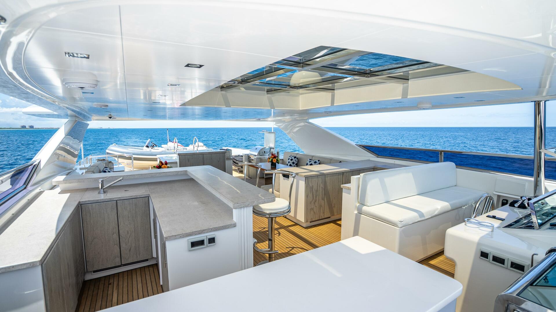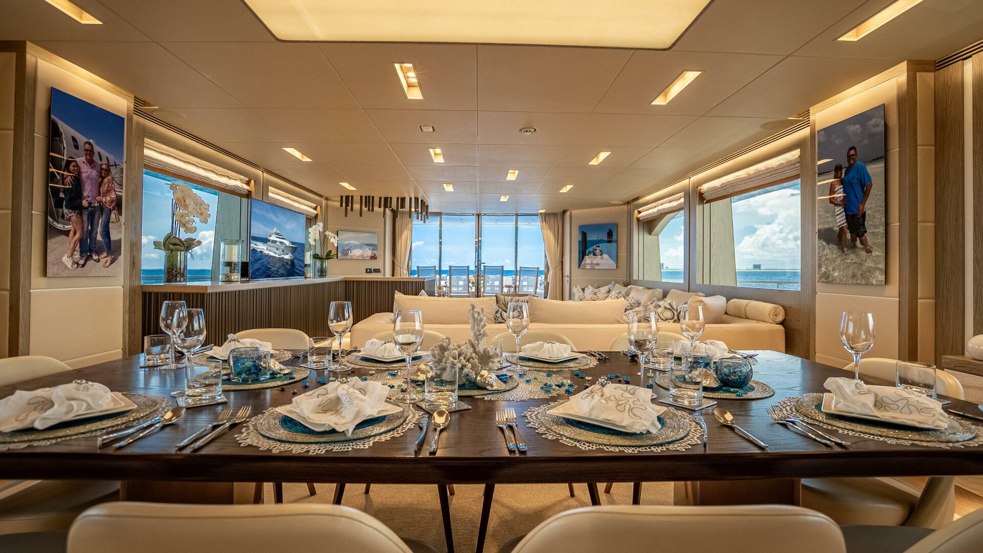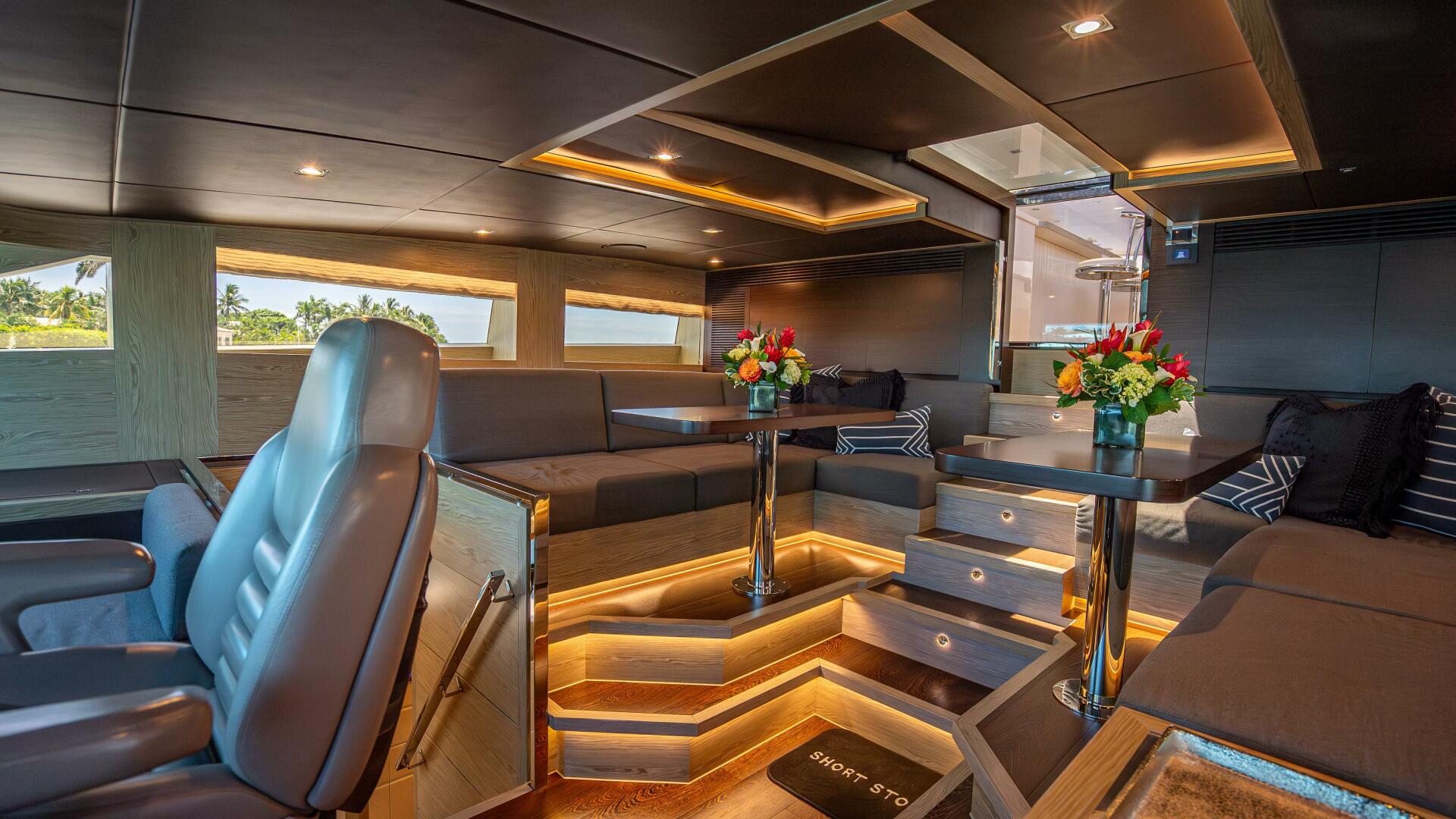 Highlighted by large windows that invite plenty of natural light, the main salon welcomes guests with a bar area in the aft foyer. This unique three-dimensional bar is set off by a custom overhead lighting installation comprised of small, oxidized metal pipes. A relaxing lounging area is situated just forward and is complemented by a 65” lifting TV and home theater system. A day head is conveniently located to port for ease of use from the aft deck.