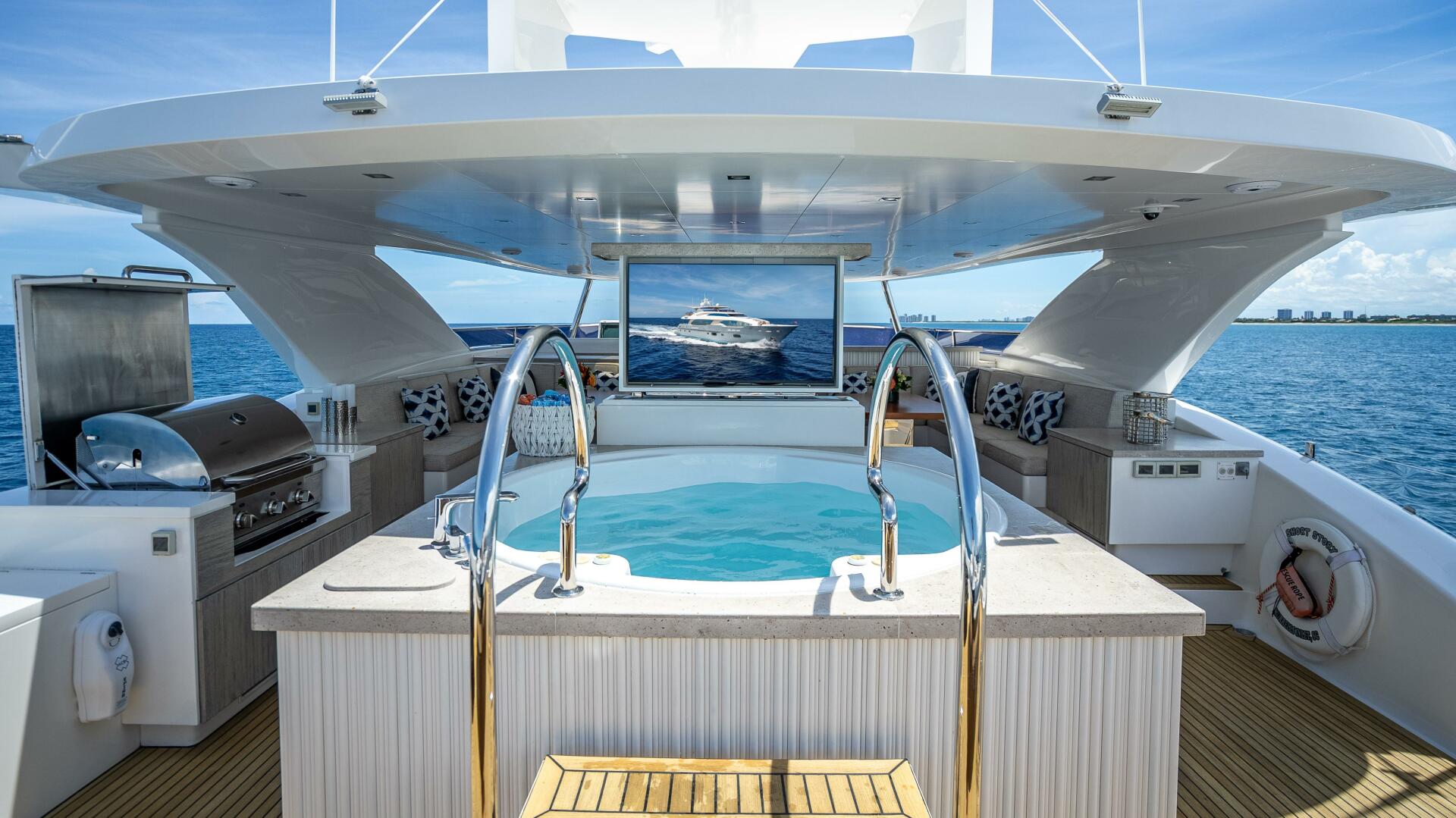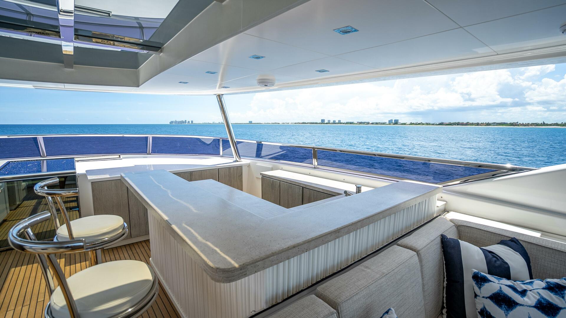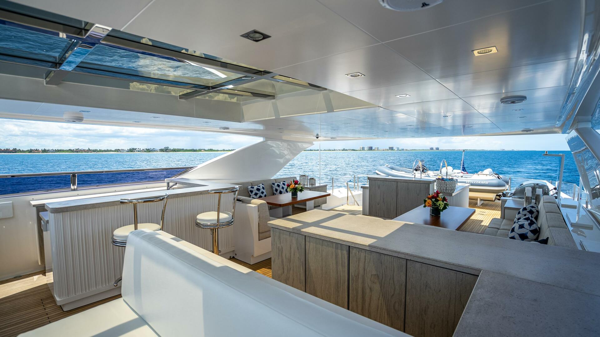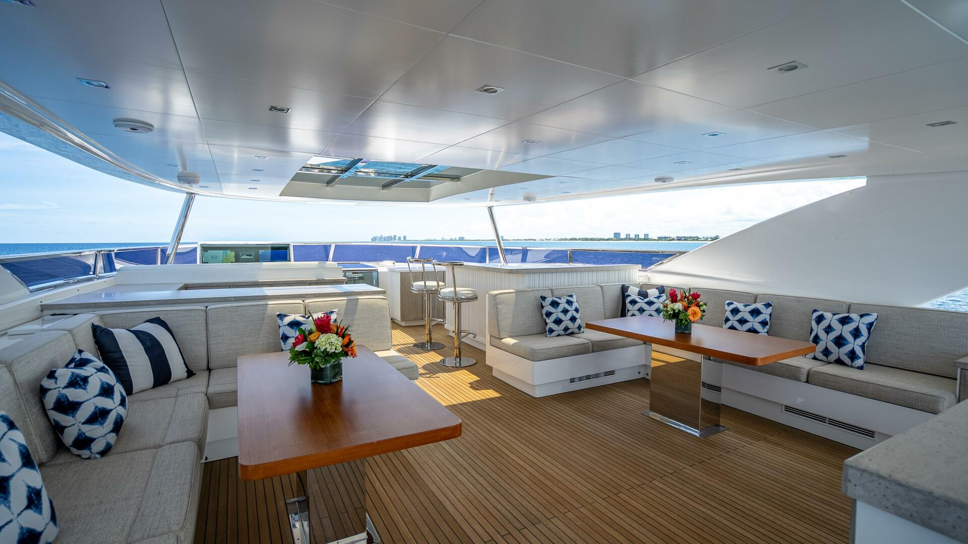 Highlighted by large windows that invite plenty of natural light, the main salon welcomes guests with a bar area in the aft foyer. This unique three-dimensional bar is set off by a custom overhead lighting installation comprised of small, oxidized metal pipes. A relaxing lounging area is situated just forward and is complemented by a 65” lifting TV and home theater system. A day head is conveniently located to port for ease of use from the aft deck.