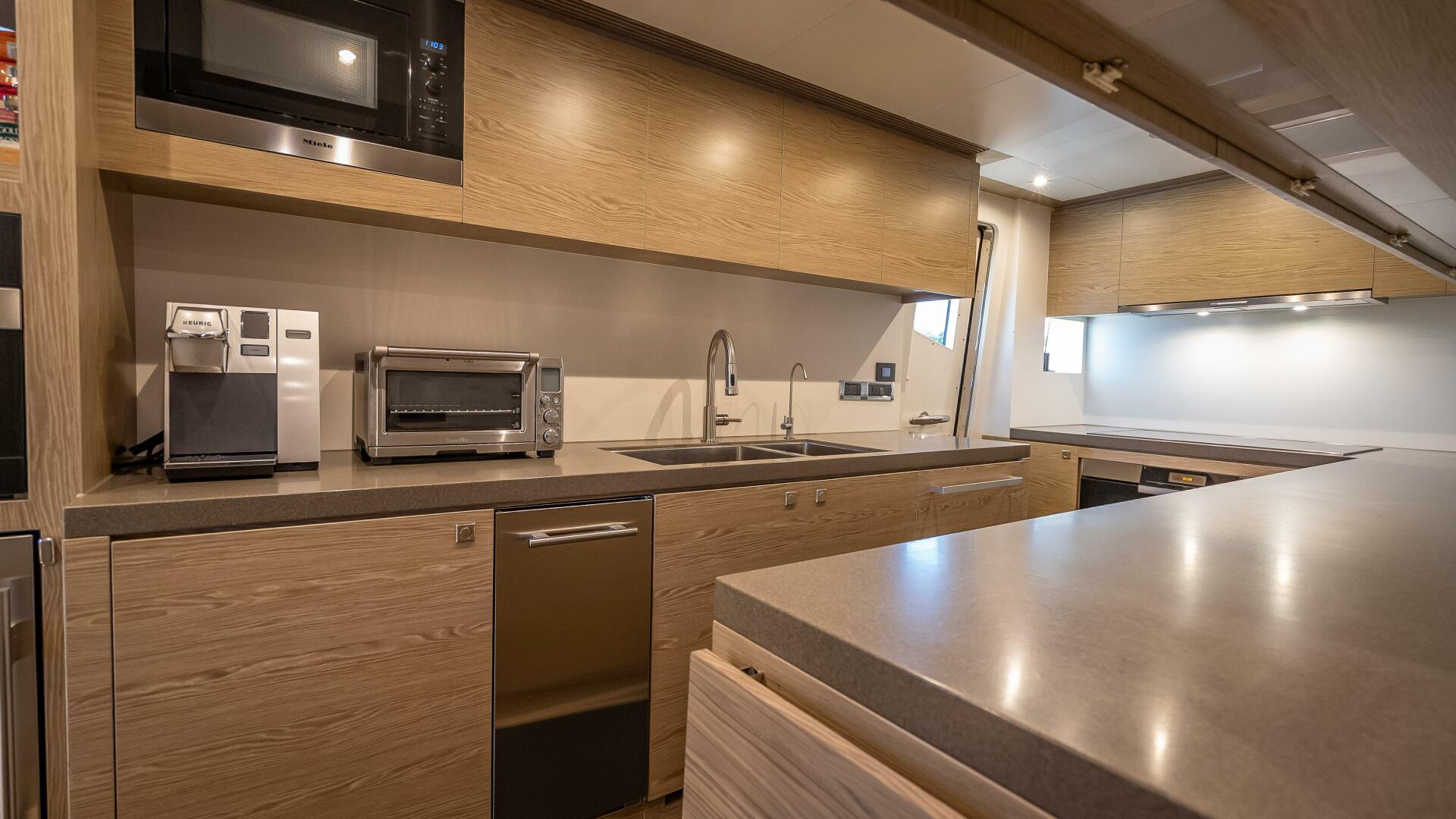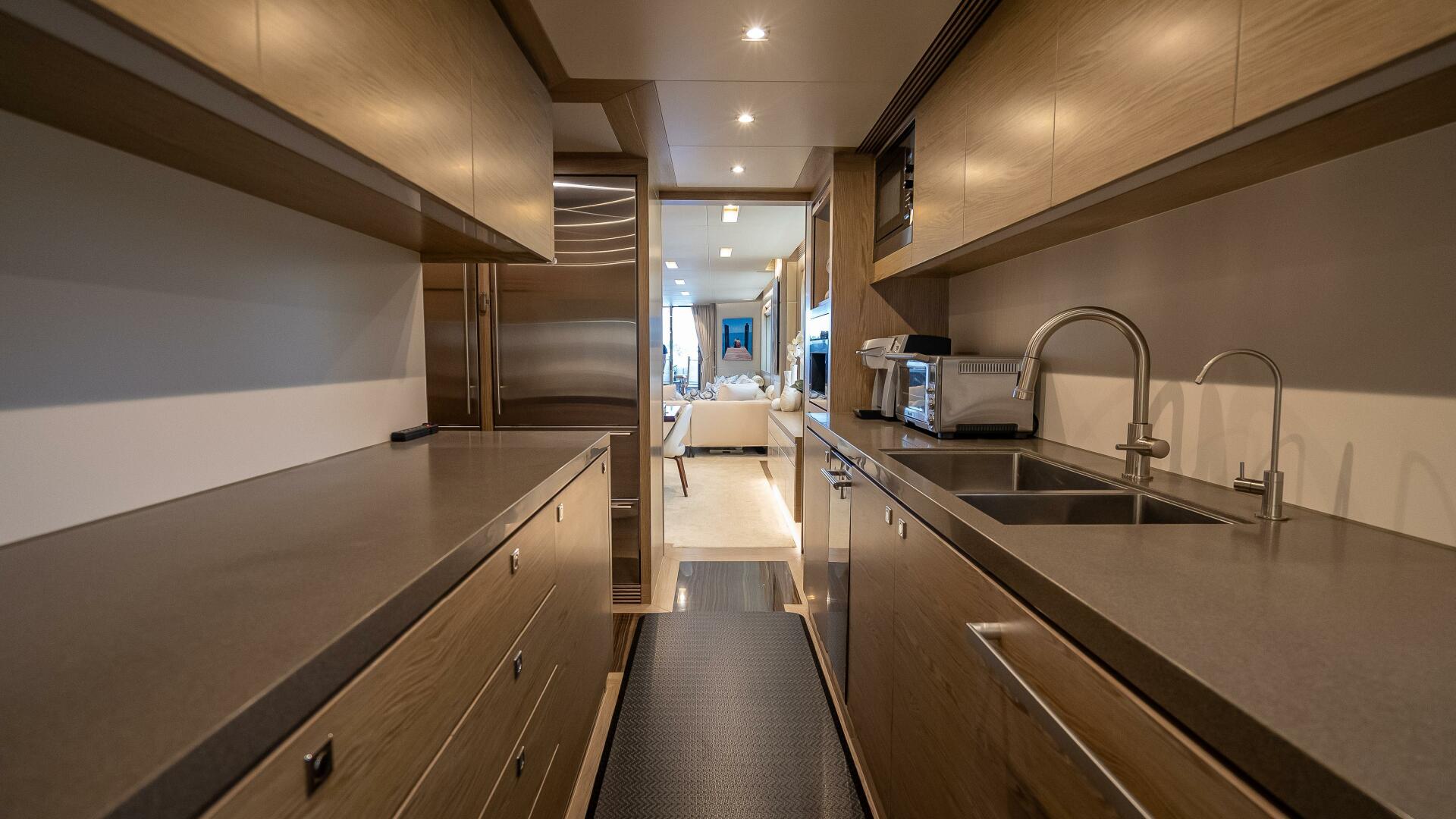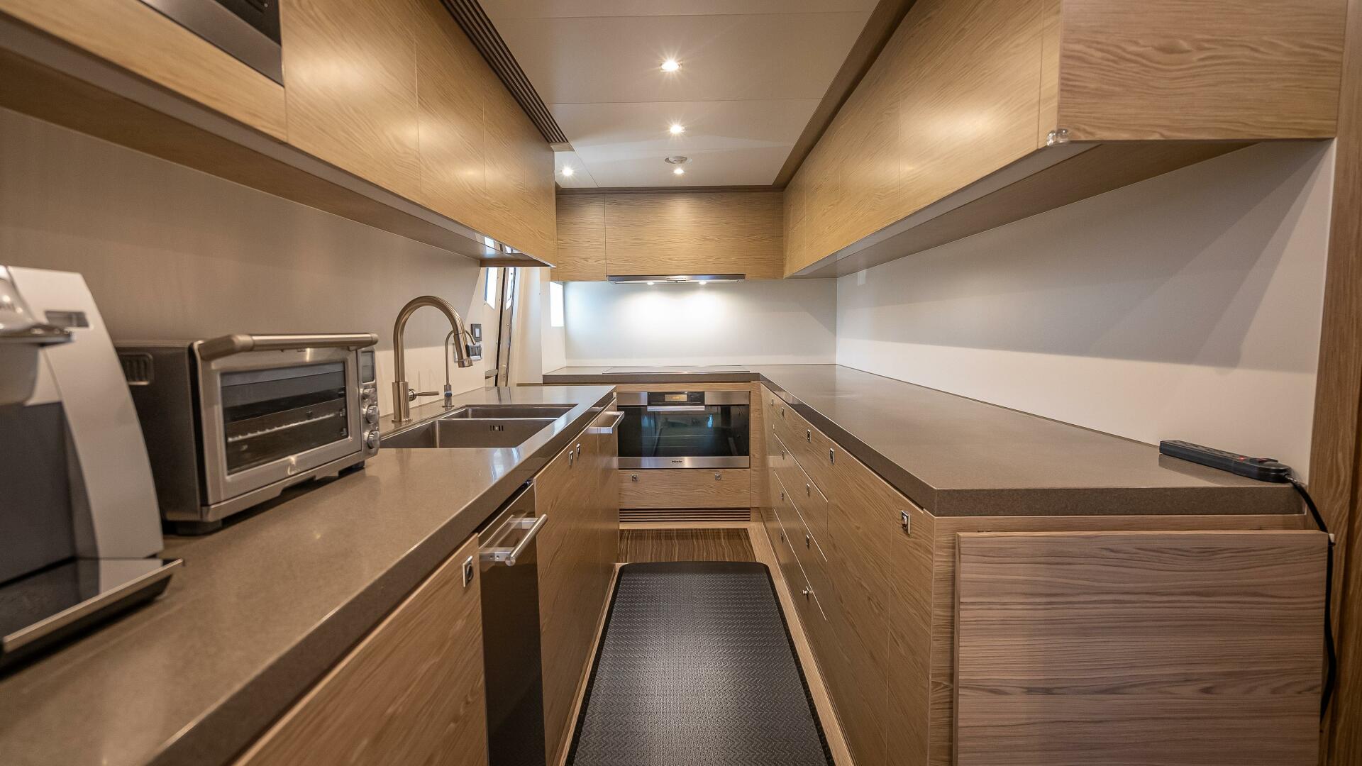 Forward to port, the fully-equipped galley features dual light and dark-toned counter surfaces, two refrigerators and freezers, and plenty of storage for provisions during a long voyage. A cabinet in the entryway is designed with a tambour door for additional storage and brings in natural light with a window. All appliances are standard 110V, which also complies with the United States, Canada and Japan.