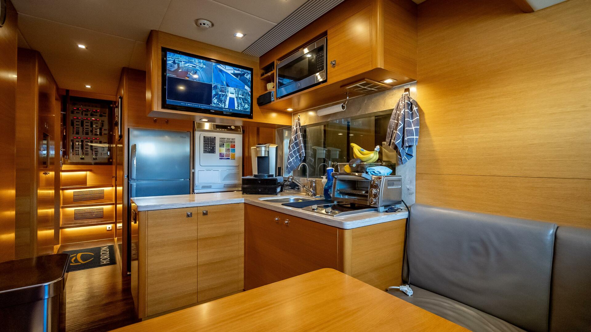 - Crew mess with L-shaped dinette, fridge/freezer, storage, microwave, and cooktop