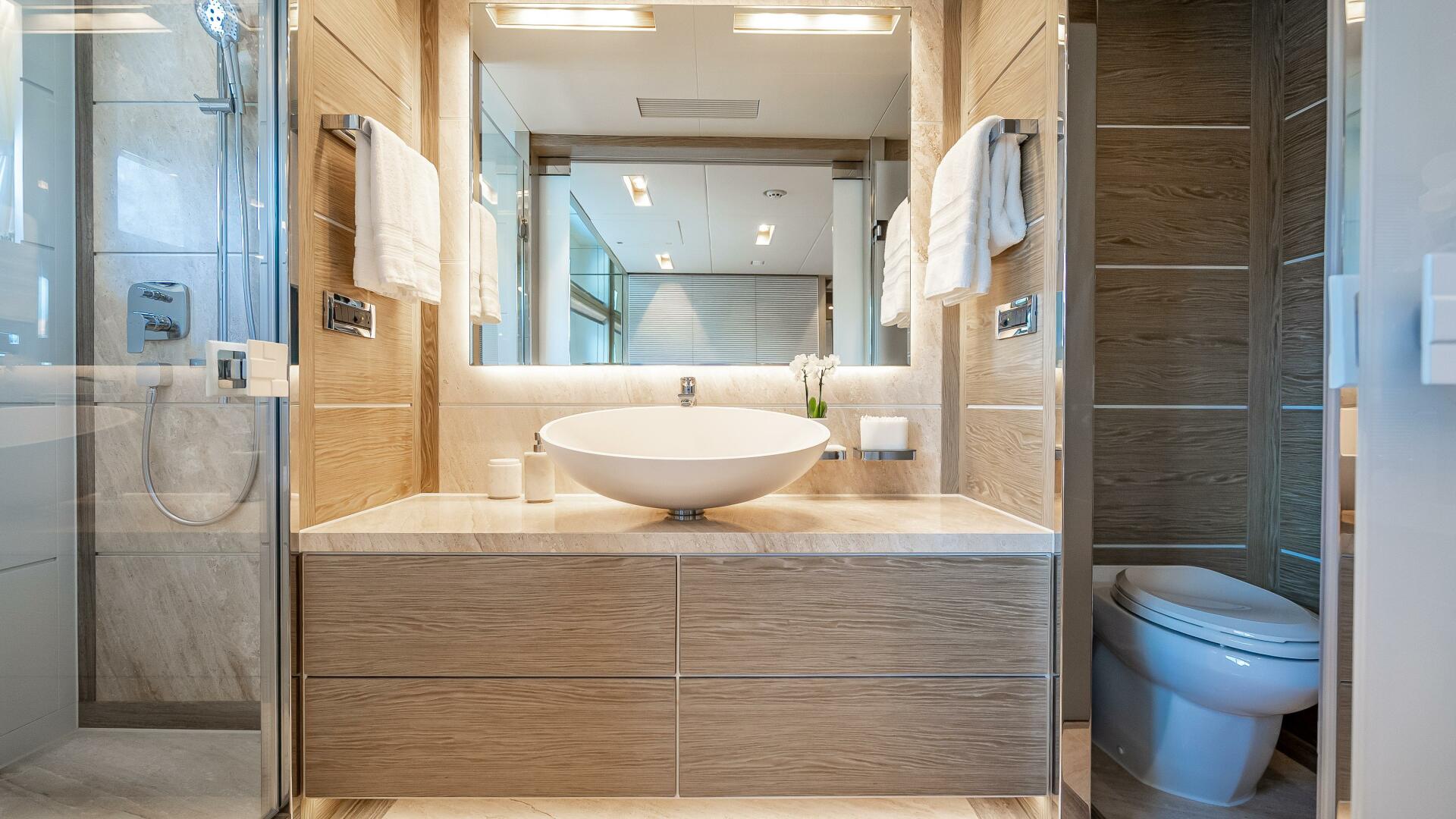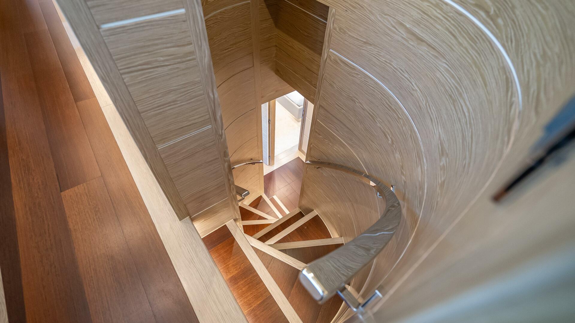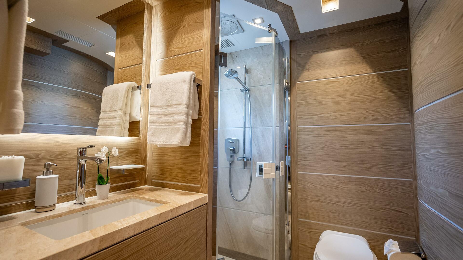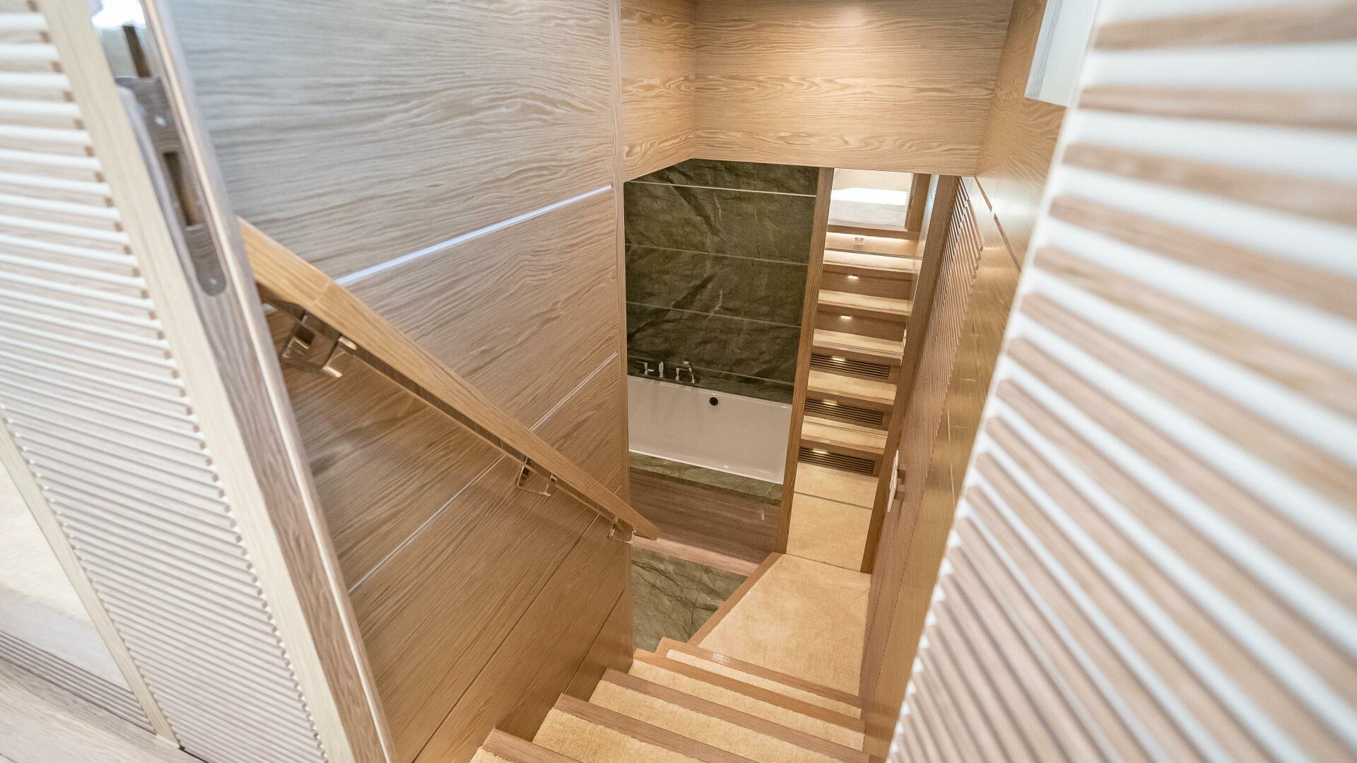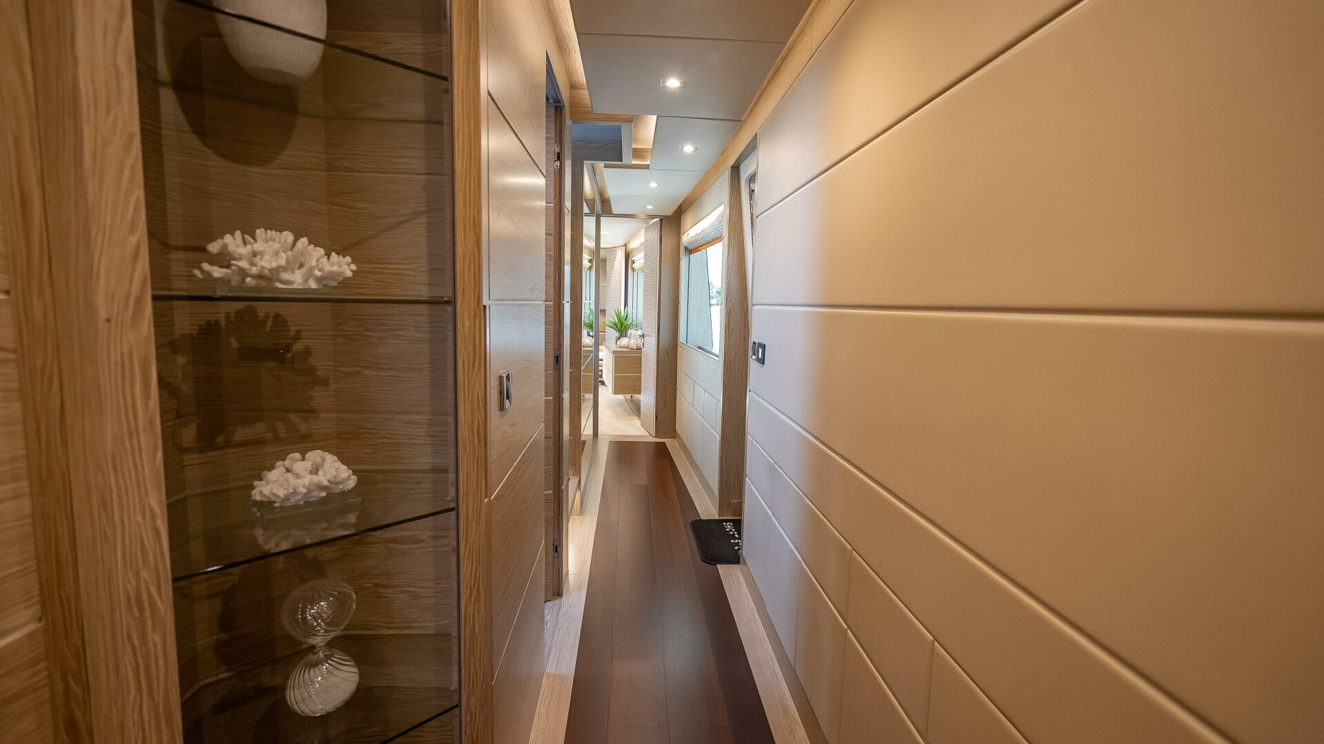 On the lower deck, the crew area is situated aft of the engine room, while four en suite guest cabins are found forward. All staterooms are beautifully designed with a very appealing natural colour tone throughout. Mirrored VIP staterooms, respectively outfitted this light, neutral Gray-toned wood, feature frosted glass sliding doors that open to the en suite’s sink and mirror creating an additional feeling of spaciousness. Mirrored twin staterooms respectively outfitted in blue and green décor themes are situated forward of the main staircase.