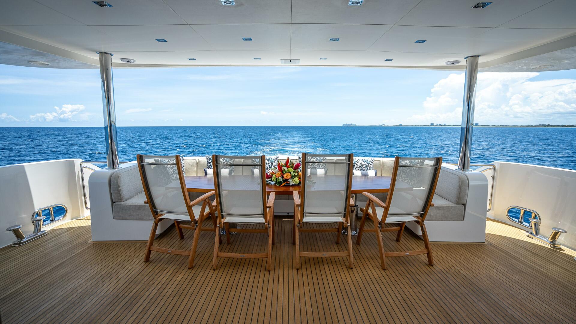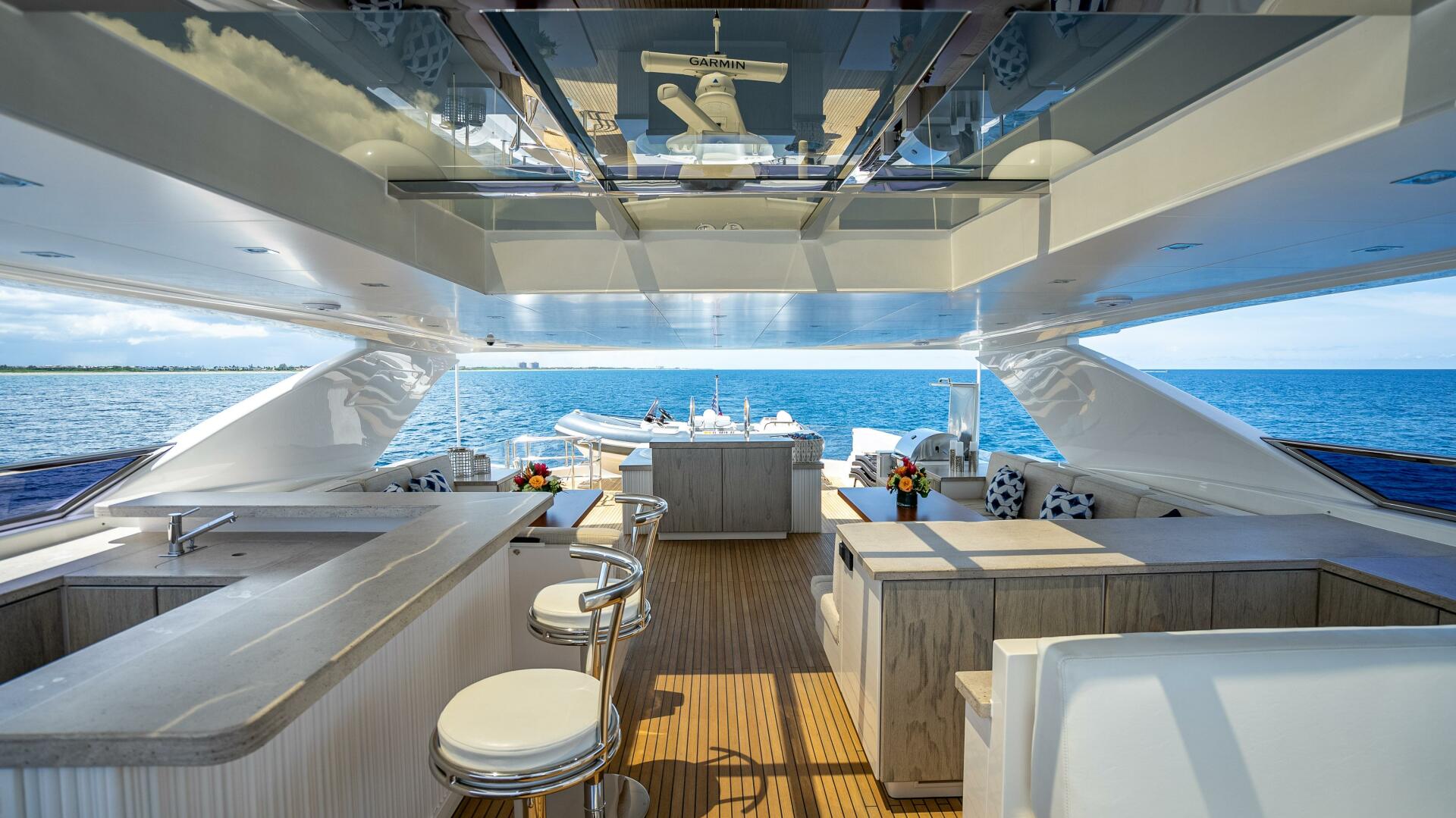 The new Horizon RP120 superyacht features a sleek exterior profile from U.S. designer JC Espinosa built atop Horizon’s proven low resistance hull platform, which ensures superior seakeeping and comfort when under way. Famed Italian interior designer Luca Dini created a contemporary and elegant interior atmosphere; while there is a strong European influence, the RP120 also emphasizes comfort and usability. Her 26’2” beam provides a functional five en suite guest stateroom layout – including an on-deck master – plus crew quarters aft of the engines. With a 7' draft, the 122' is suited for extended cruises to the Bahamas, where her tender garage and hydraulic swim platform will provide hours of fun and relaxation.