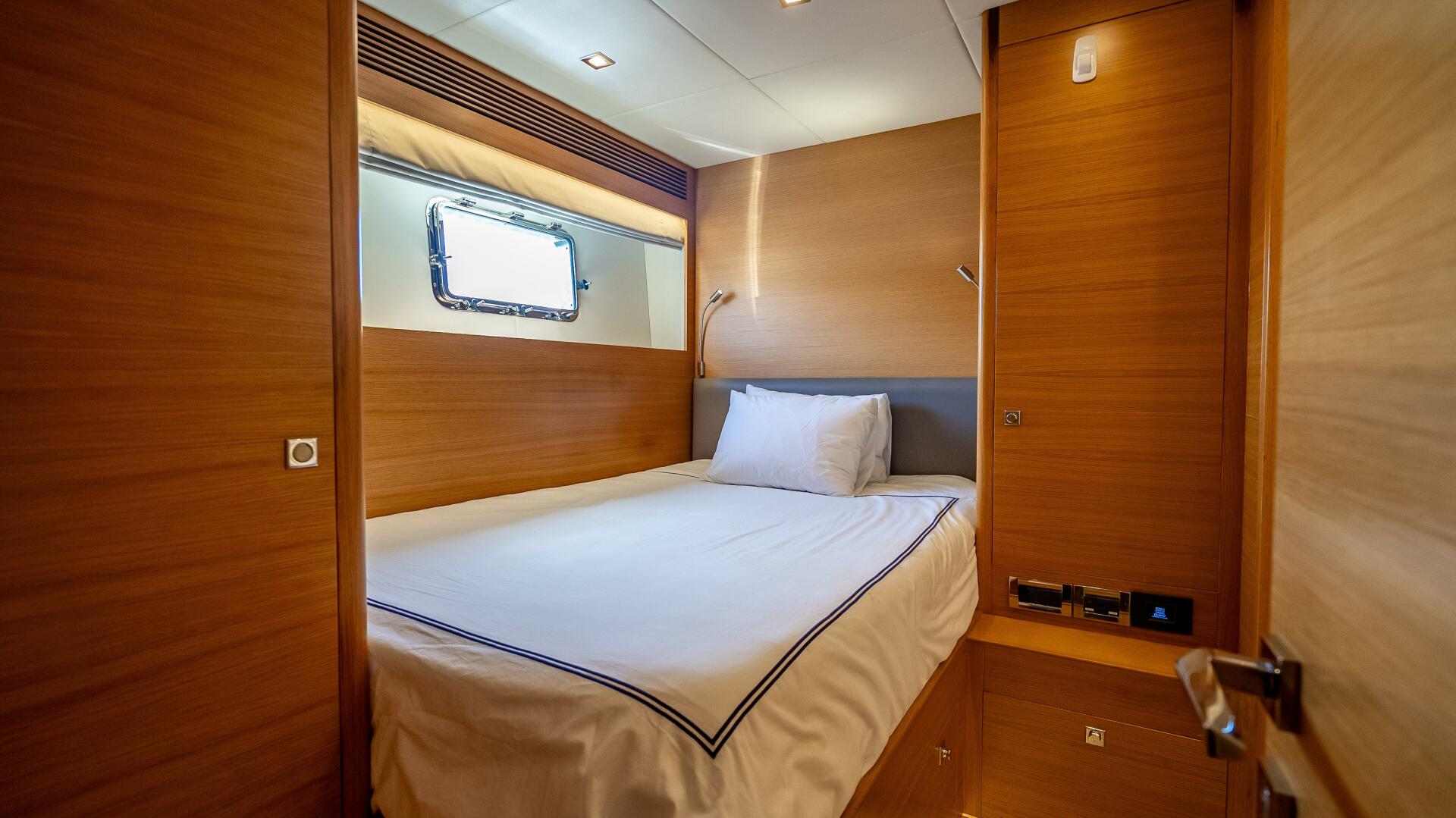 - Captain's cabin w/ bed and dual hanging lockers; en suite head with shower, sink and water closet