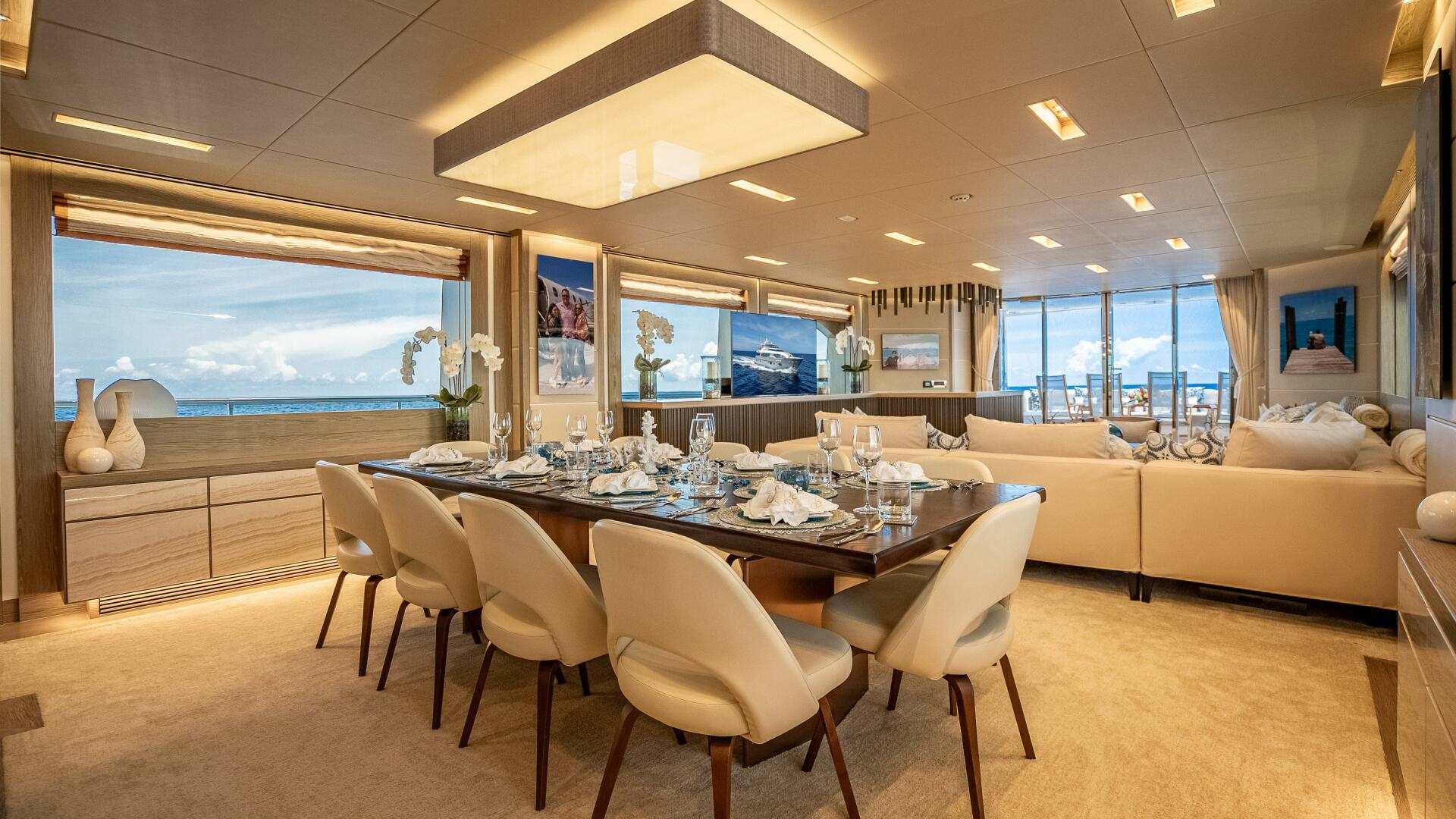 Forward, the formal dining area, highlighted by a mirrored bulkhead wall with thin wood inlays, accommodates ten guests in a Zen-like atmosphere. Electric sliding doors to port and starboard are finished in exquisite detail, feature small wooden slabs on a lacquer surface that, when accented by artfully placed spotlights, yields a pleasant “chiaroscuro” effect. The built-in cabinets to port and starboard of the dining table feature marble panels, bring a lovely stone texture to this elegant area.