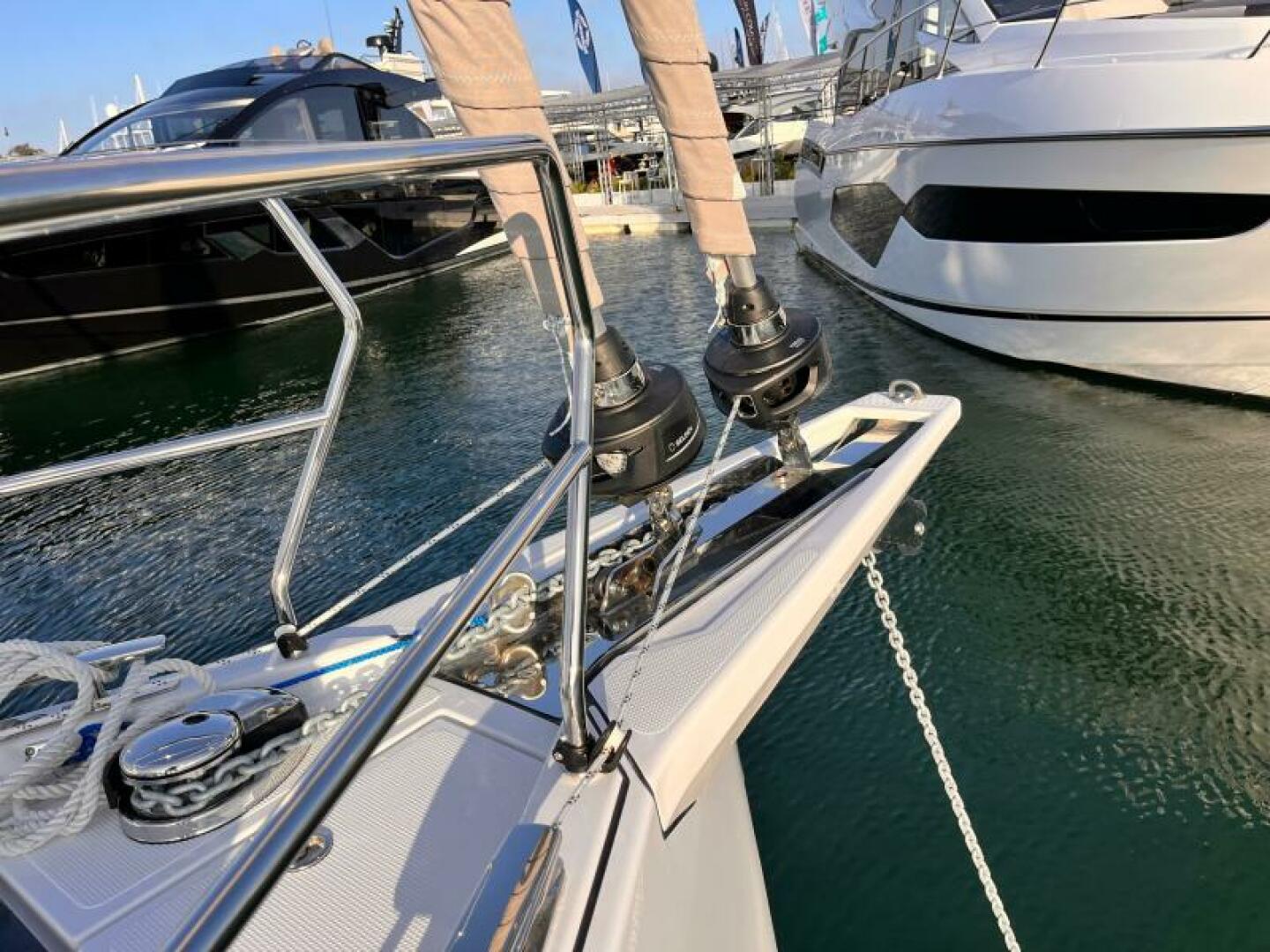 - Covered halyards and control lines lead to cockpit helmposition,organizers and jammers, 4 mooring cleats, handrails on coach roof