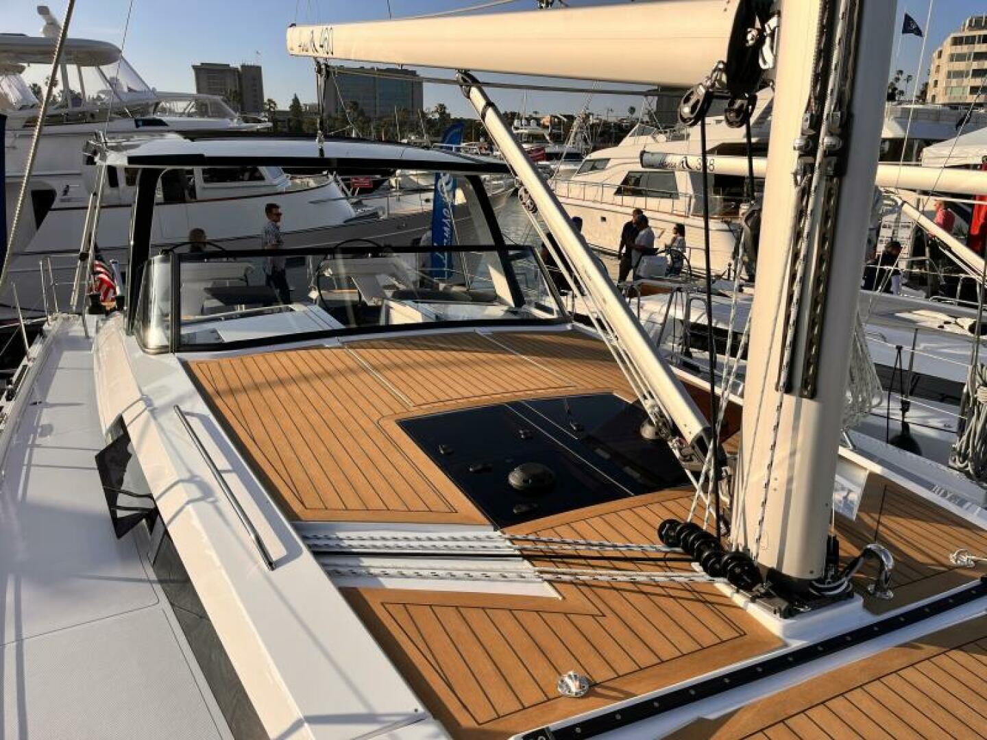 - Covered halyards and control lines lead to cockpit helm position, 4 mooring cleats, handrails on coach roof