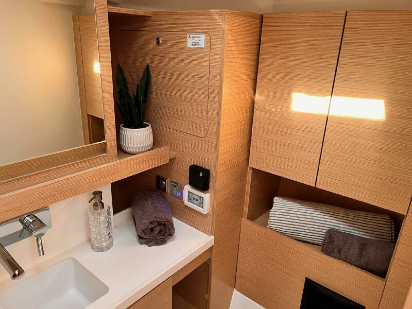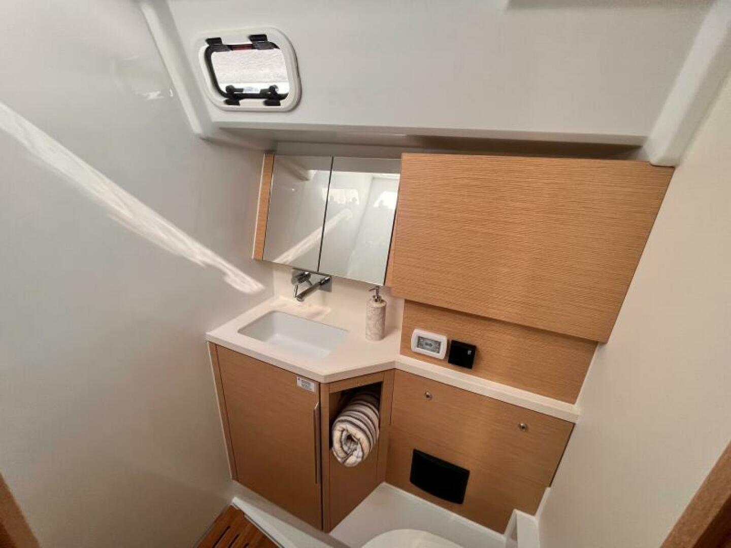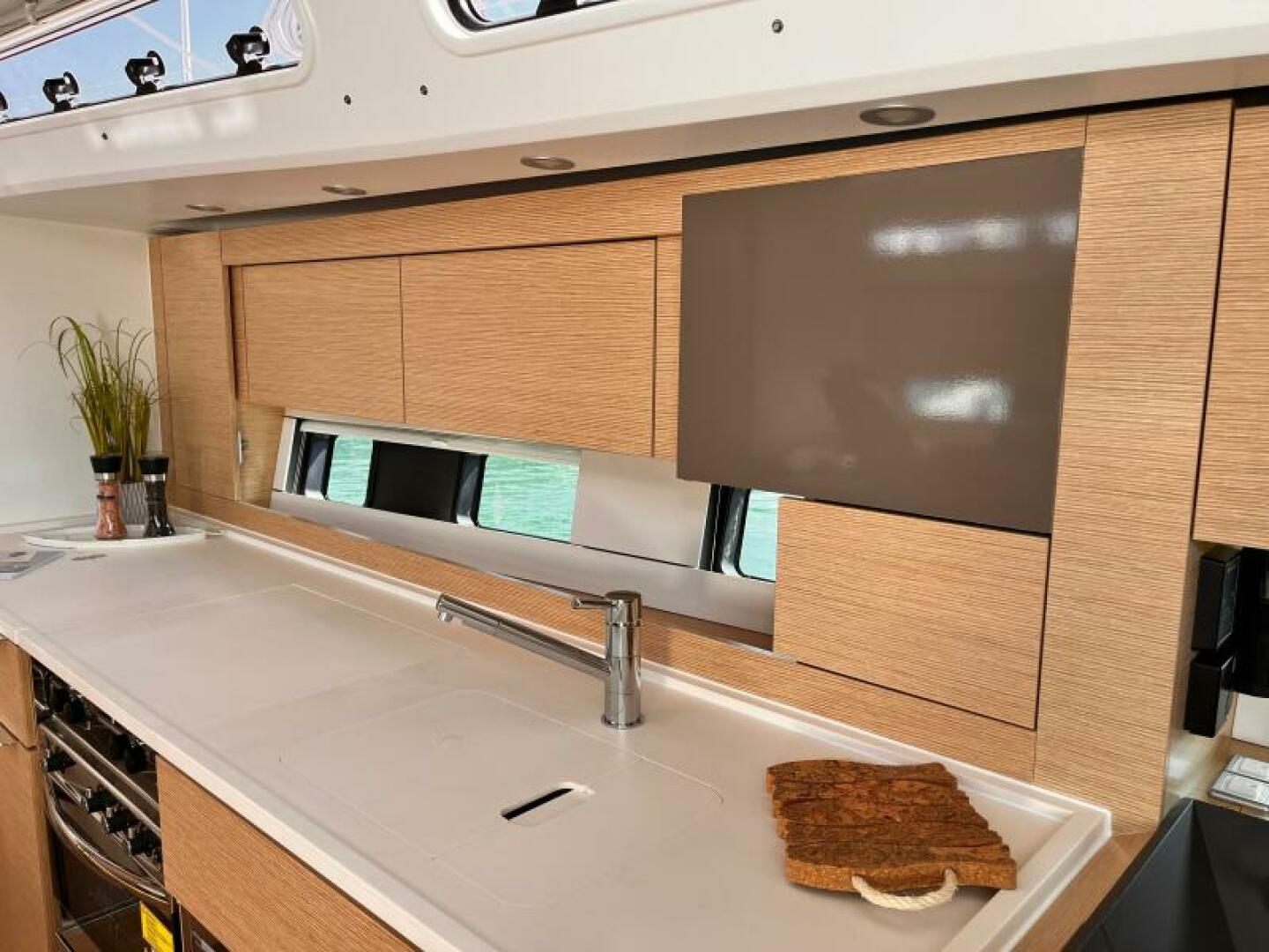 - Worktop, sink and design parts of the galley and worktop in heads Marine Mineral Stone in Off White