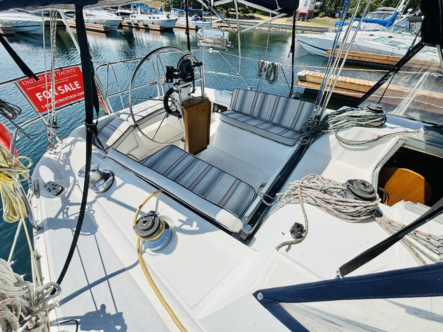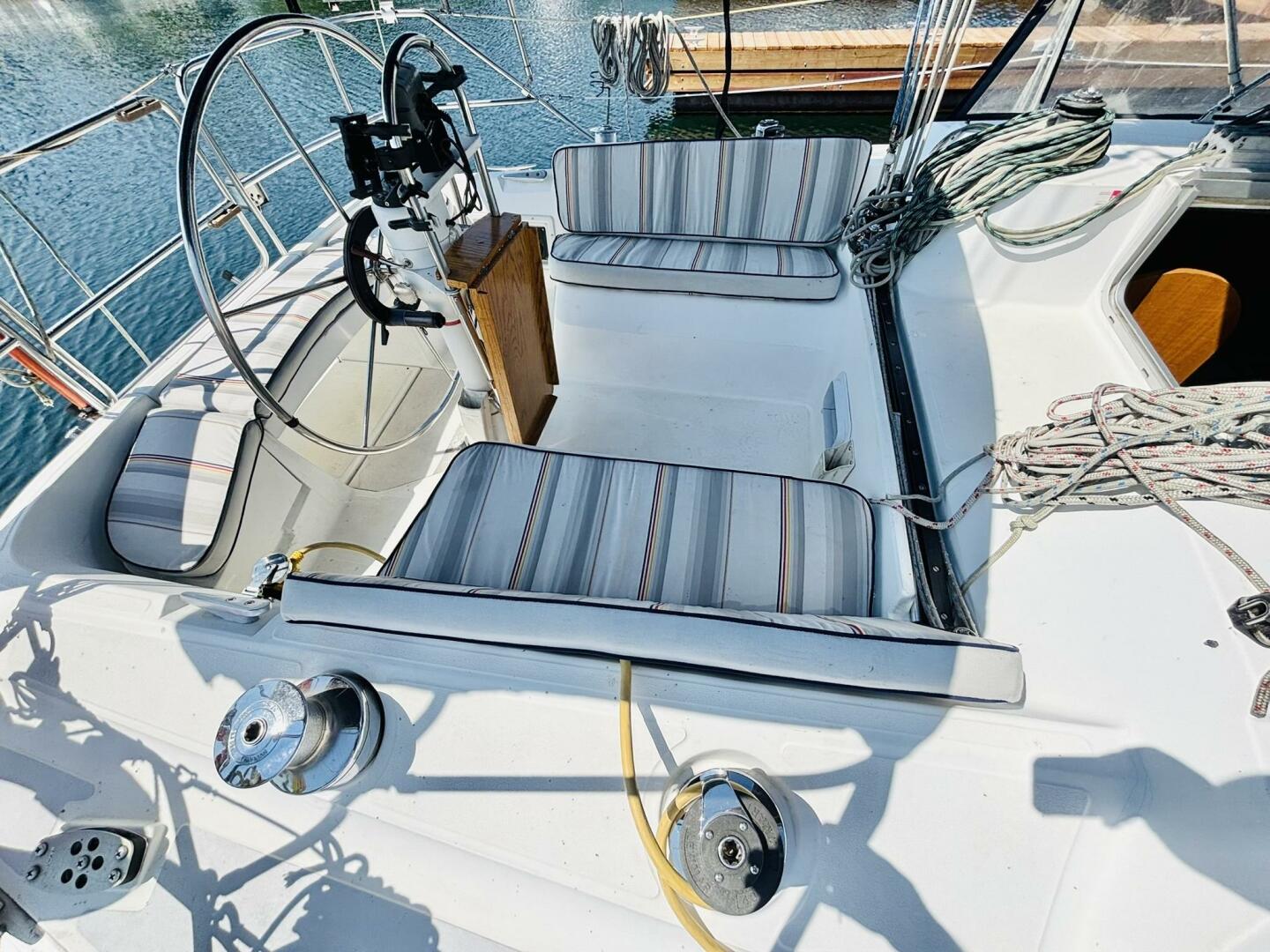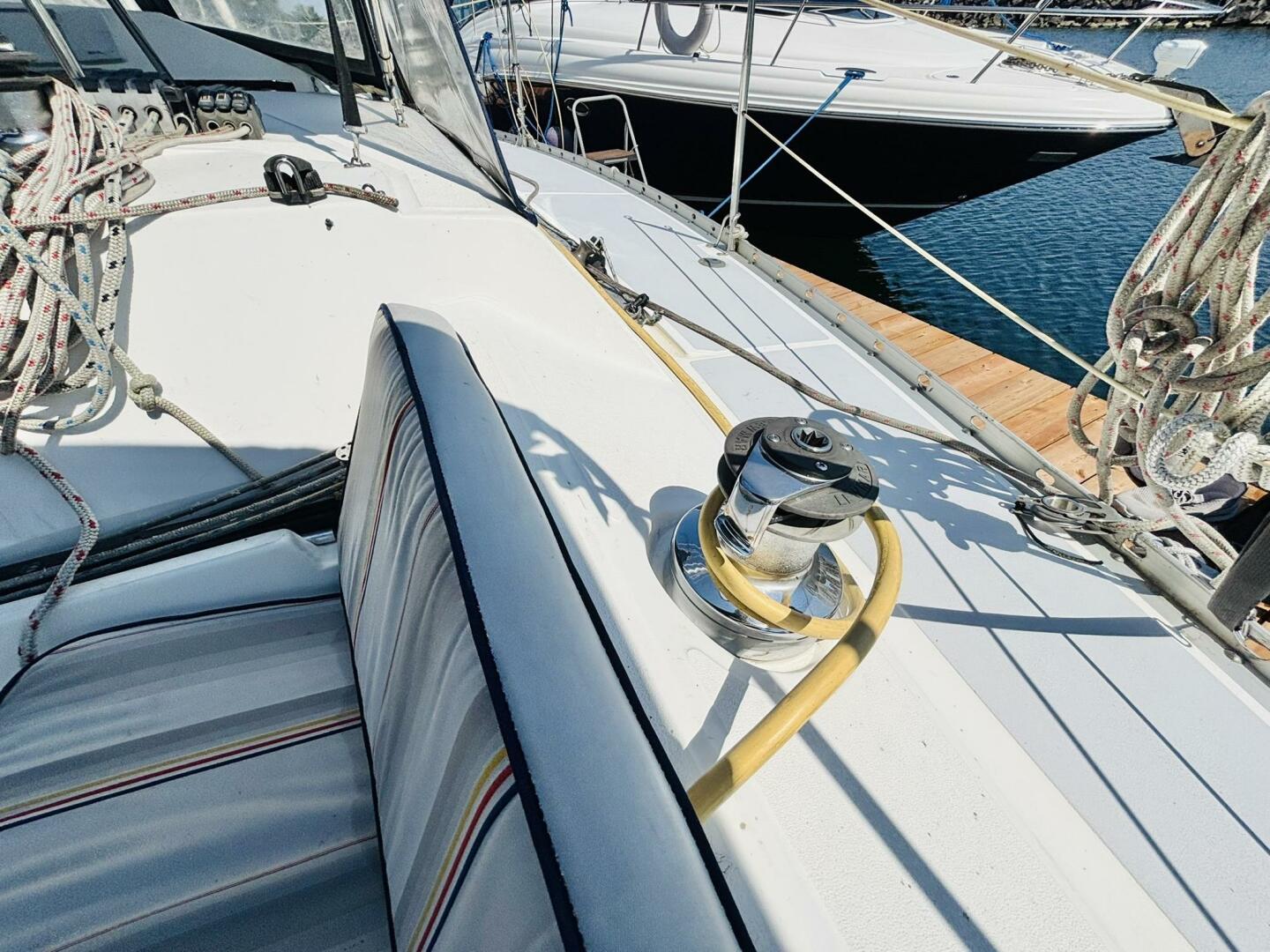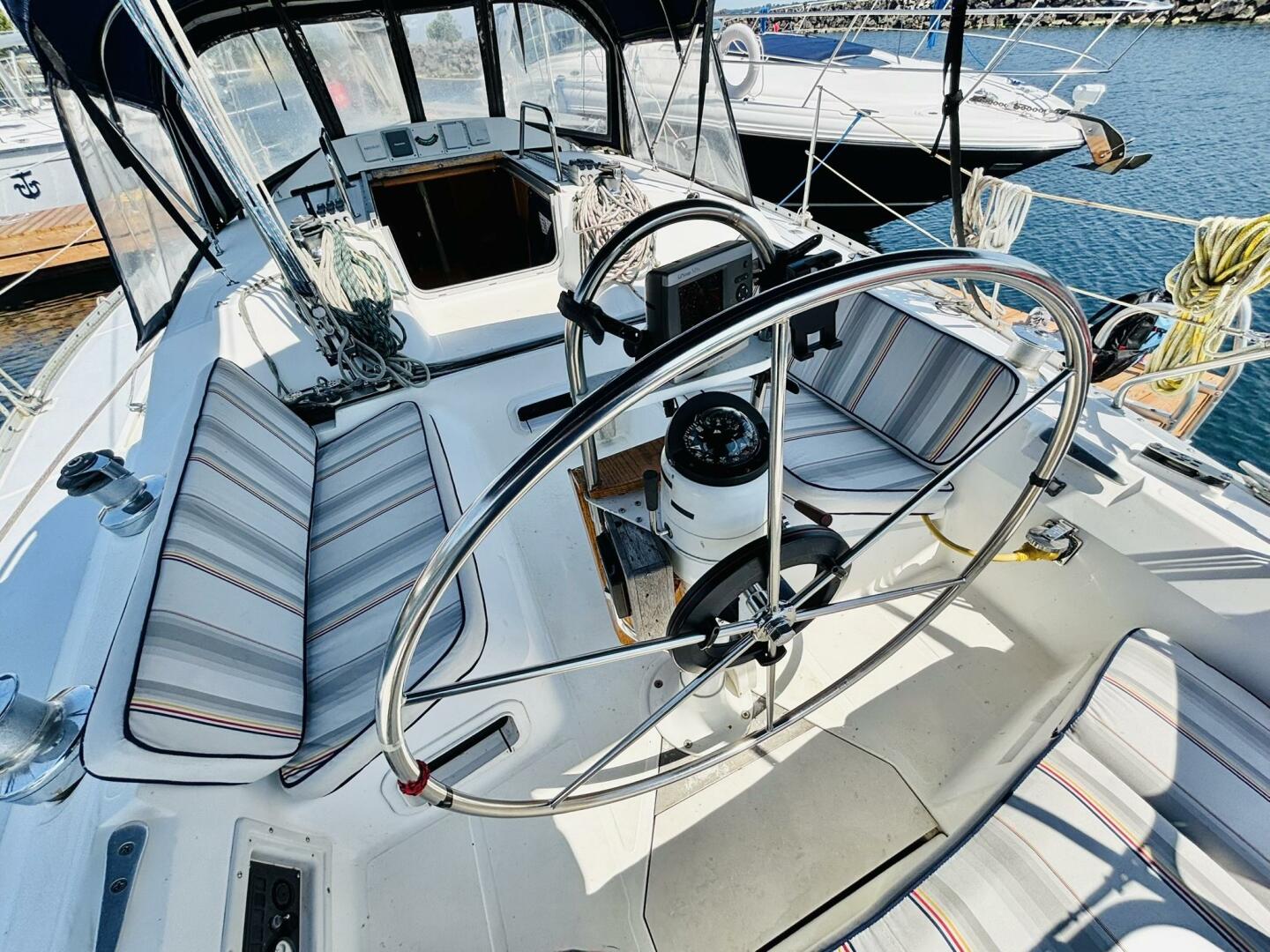 On deck, her wide side decks, secure lifelines, and large cockpit make for safe and comfortable passages. The bimini and dodger offer excellent protection, while self-tailing winches, furling genoa, and well-laid-out controls keep sailing manageable for short-handed crews. Powered by a reliable Yanmar diesel, she offers dependable performance under power.
