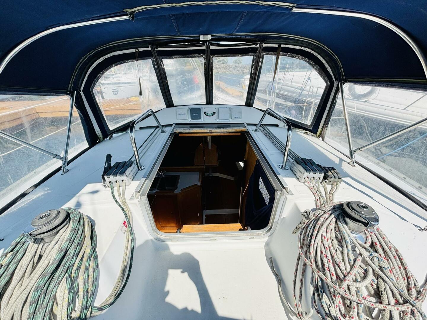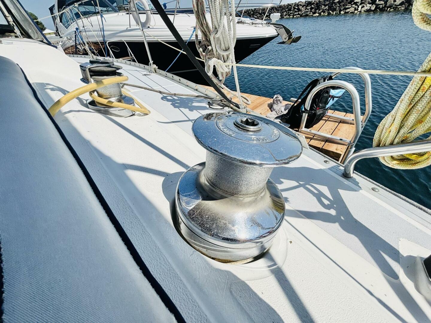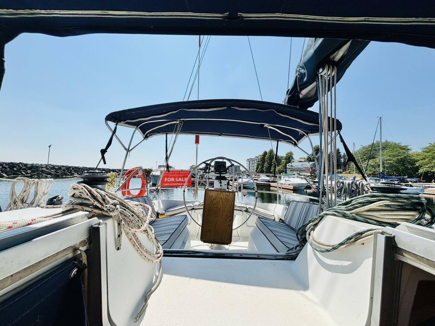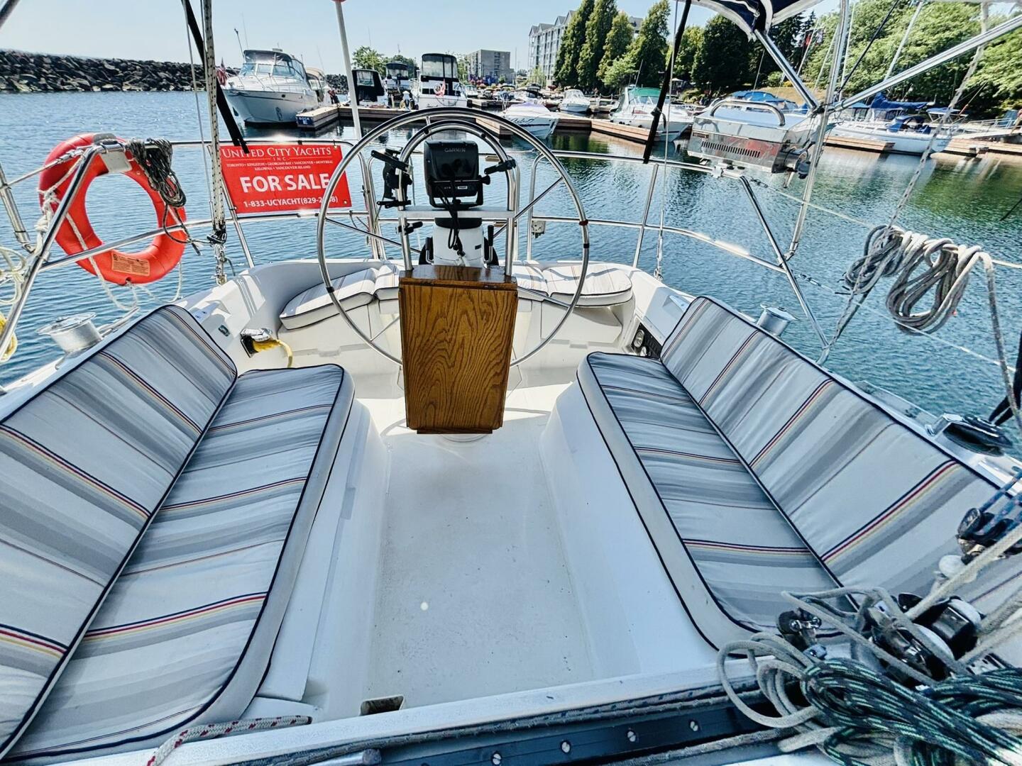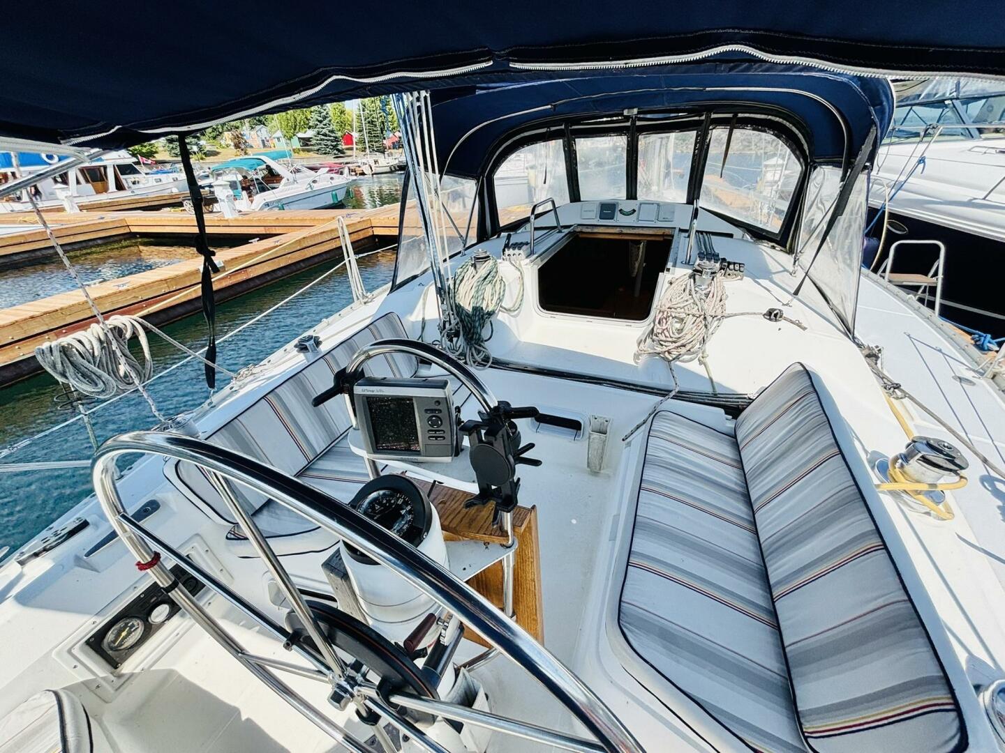 On deck, her wide side decks, secure lifelines, and large cockpit make for safe and comfortable passages. The bimini and dodger offer excellent protection, while self-tailing winches, furling genoa, and well-laid-out controls keep sailing manageable for short-handed crews. Powered by a reliable Yanmar diesel, she offers dependable performance under power.