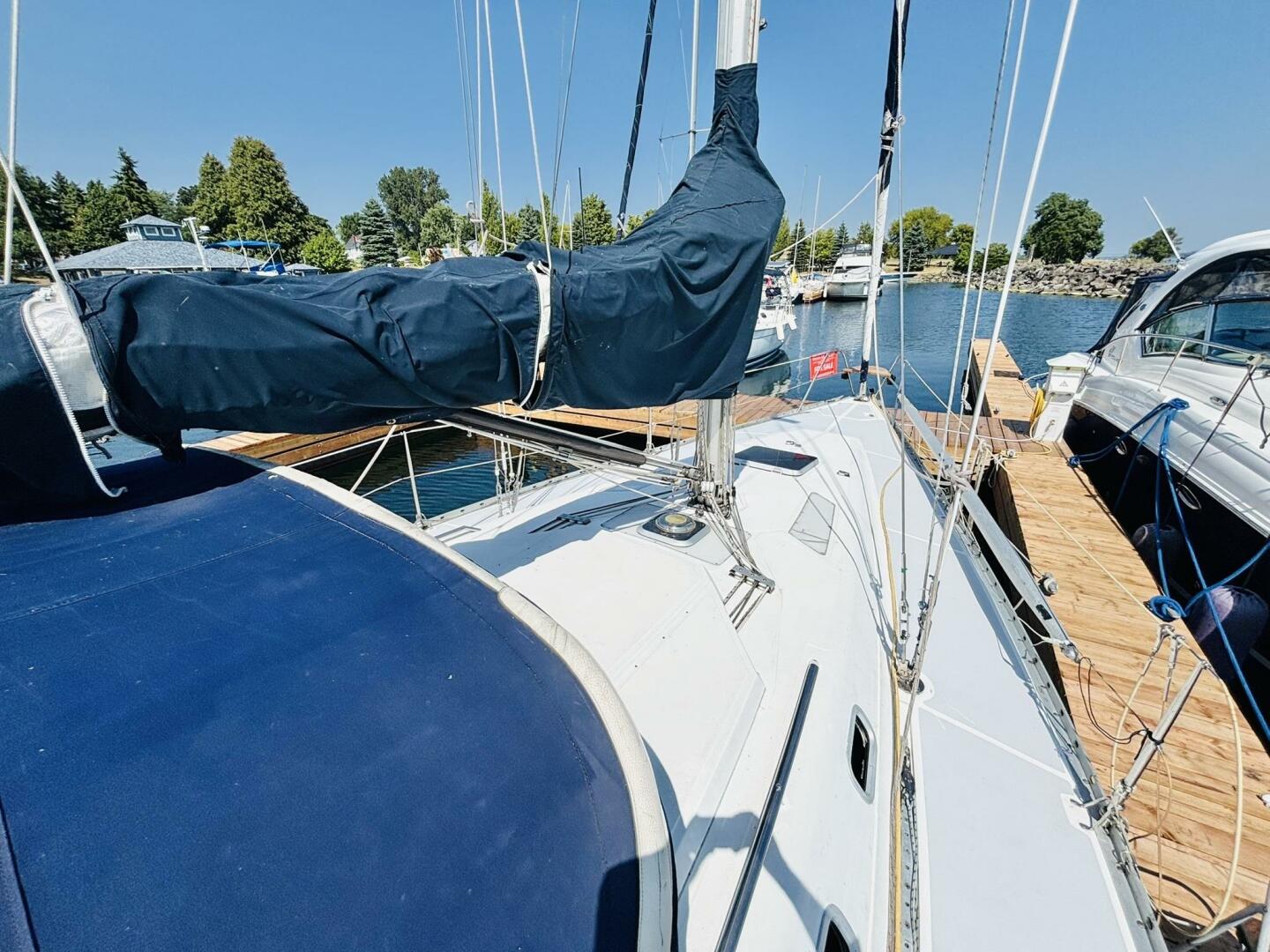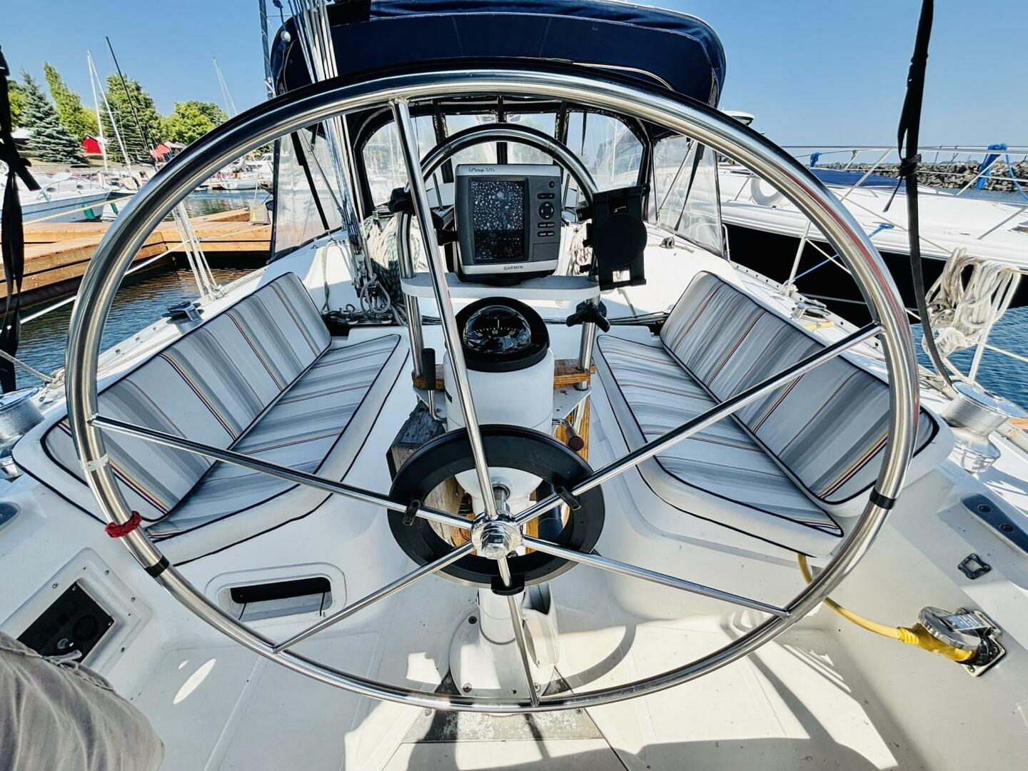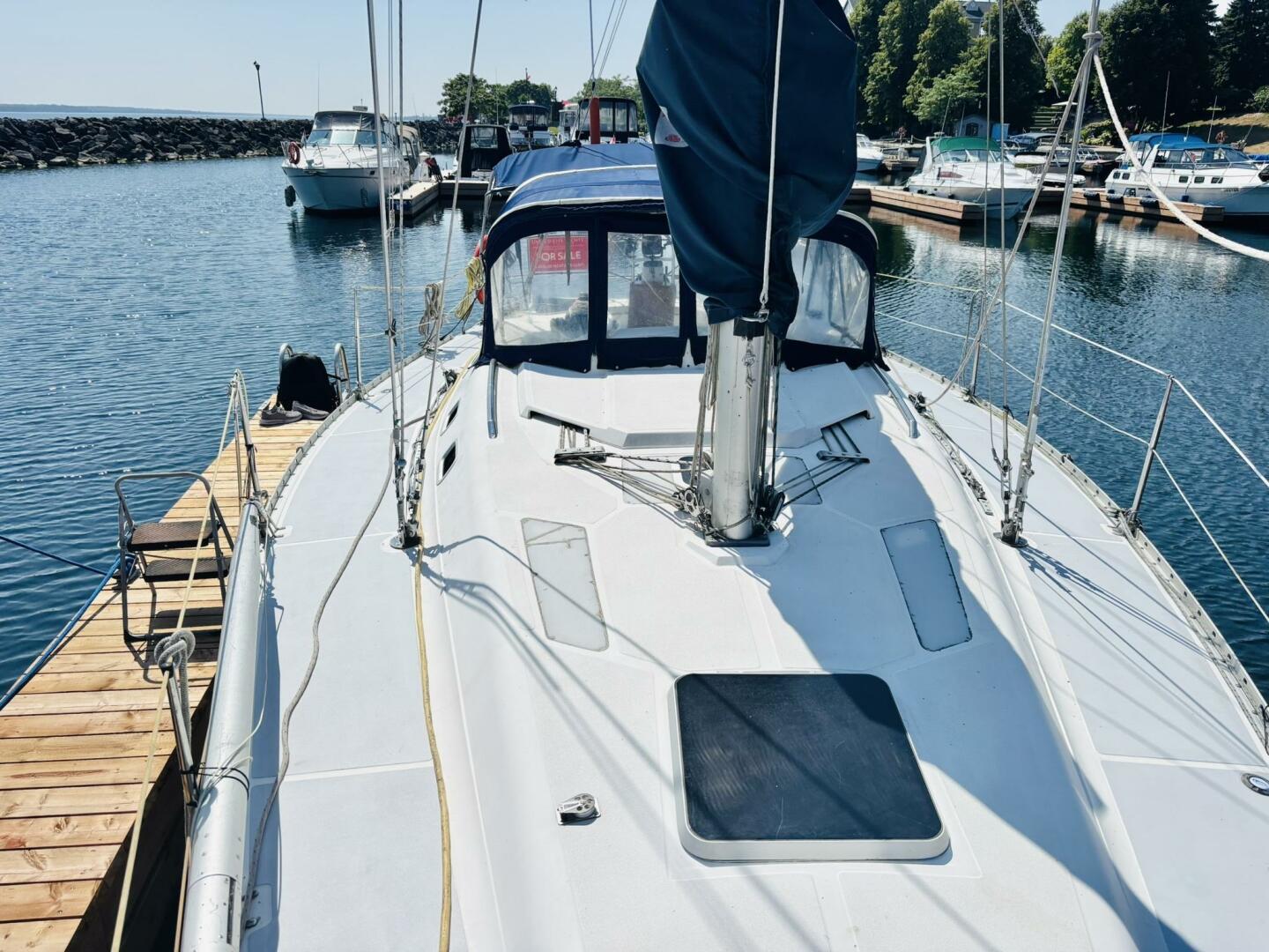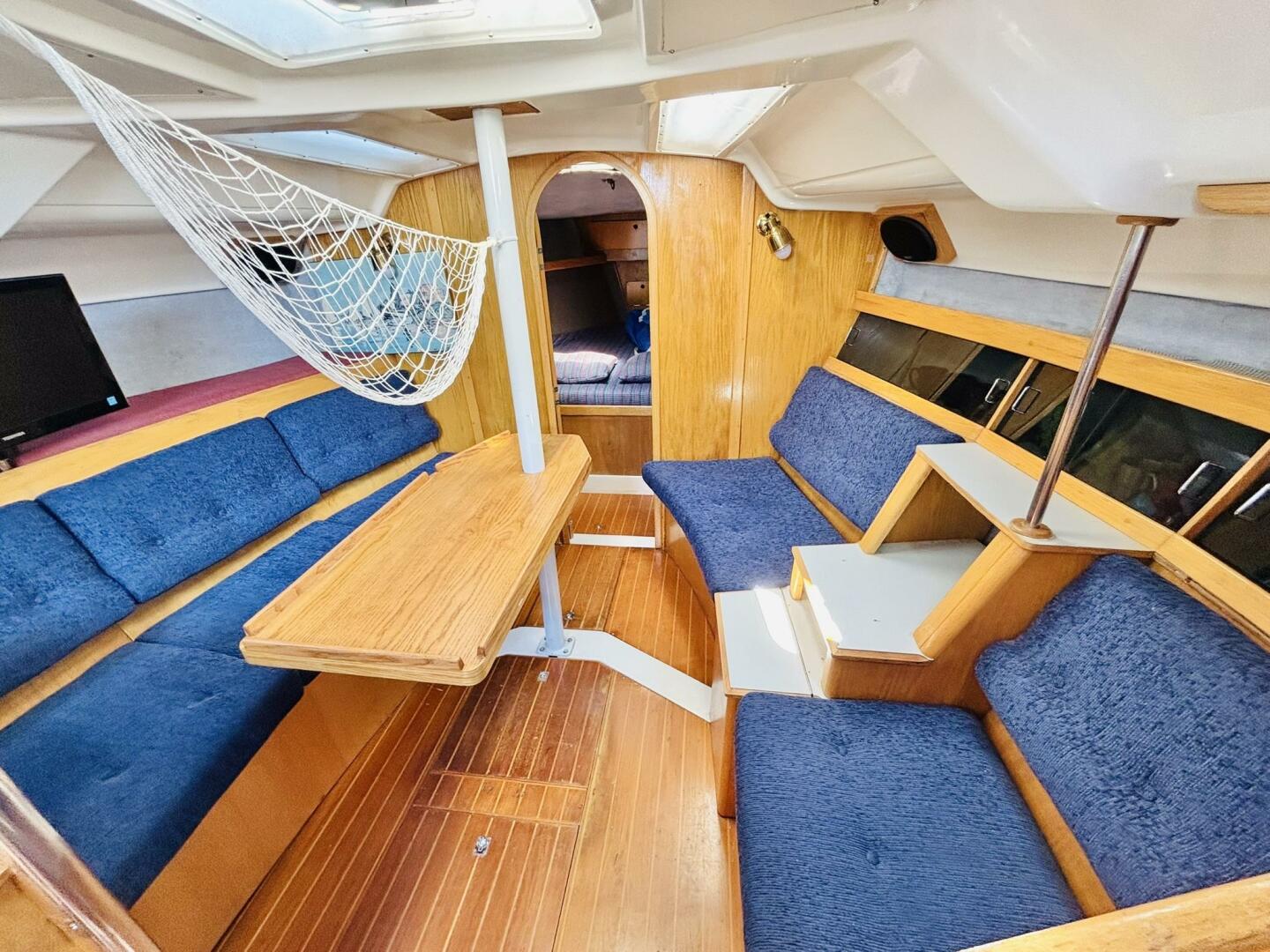 On deck, her wide side decks, secure lifelines, and large cockpit make for safe and comfortable passages. The bimini and dodger offer excellent protection, while self-tailing winches, furling genoa, and well-laid-out controls keep sailing manageable for short-handed crews. Powered by a reliable Yanmar diesel, she offers dependable performance under power.