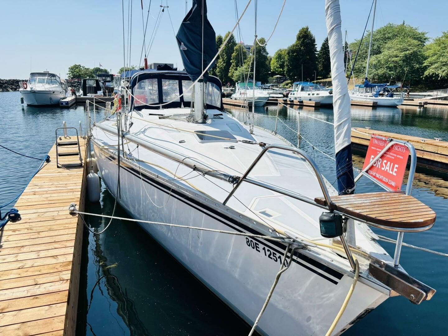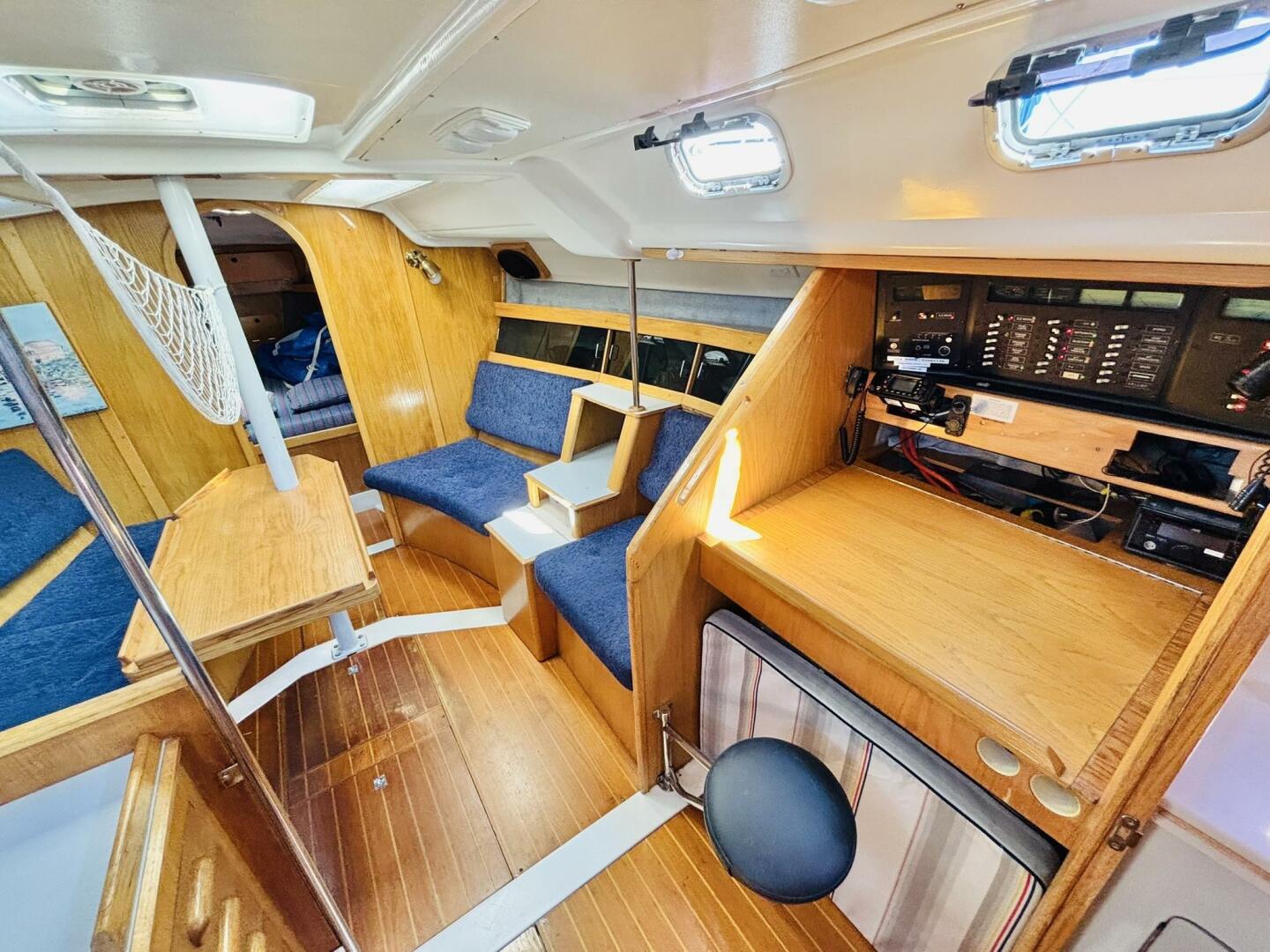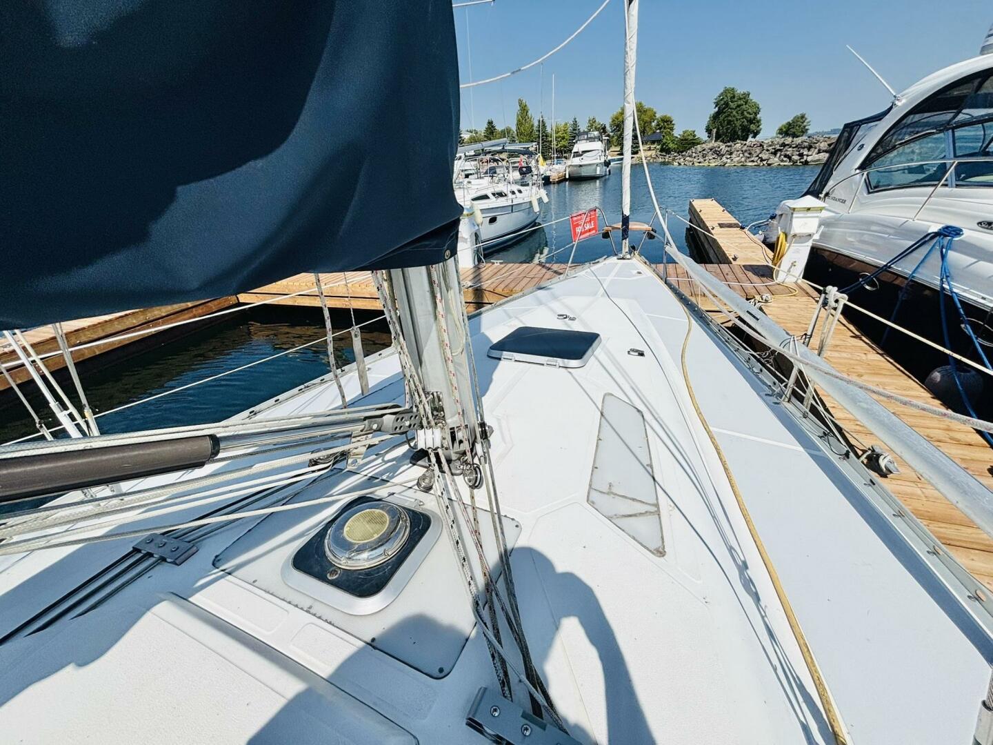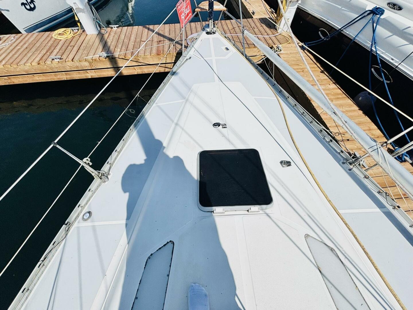 On deck, her wide side decks, secure lifelines, and large cockpit make for safe and comfortable passages. The bimini and dodger offer excellent protection, while self-tailing winches, furling genoa, and well-laid-out controls keep sailing manageable for short-handed crews. Powered by a reliable Yanmar diesel, she offers dependable performance under power.