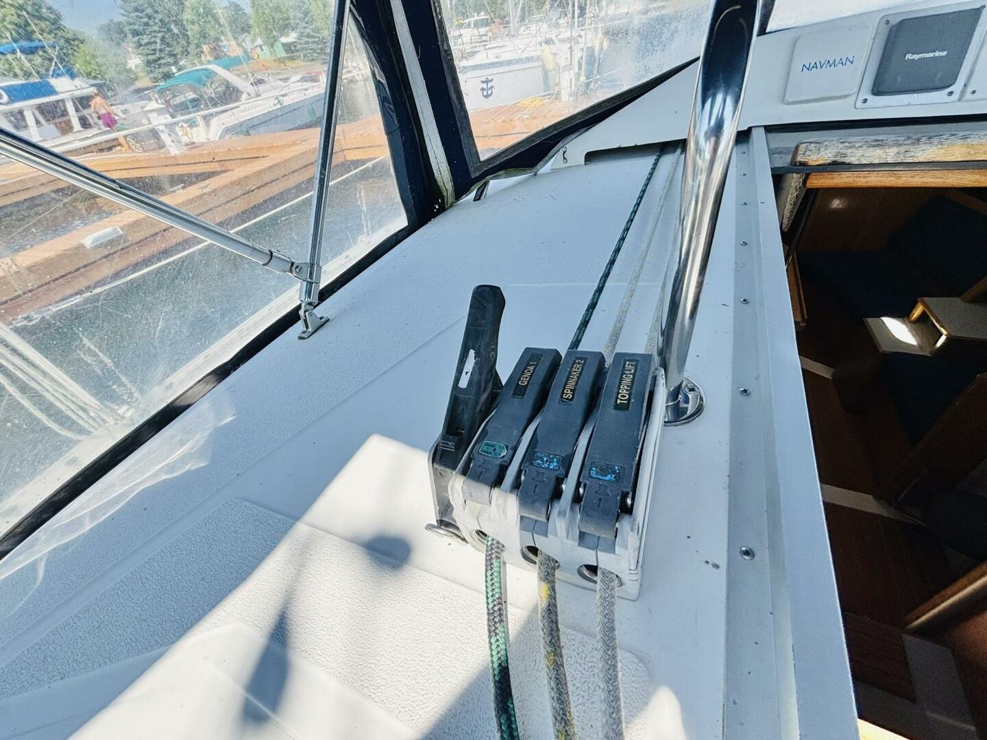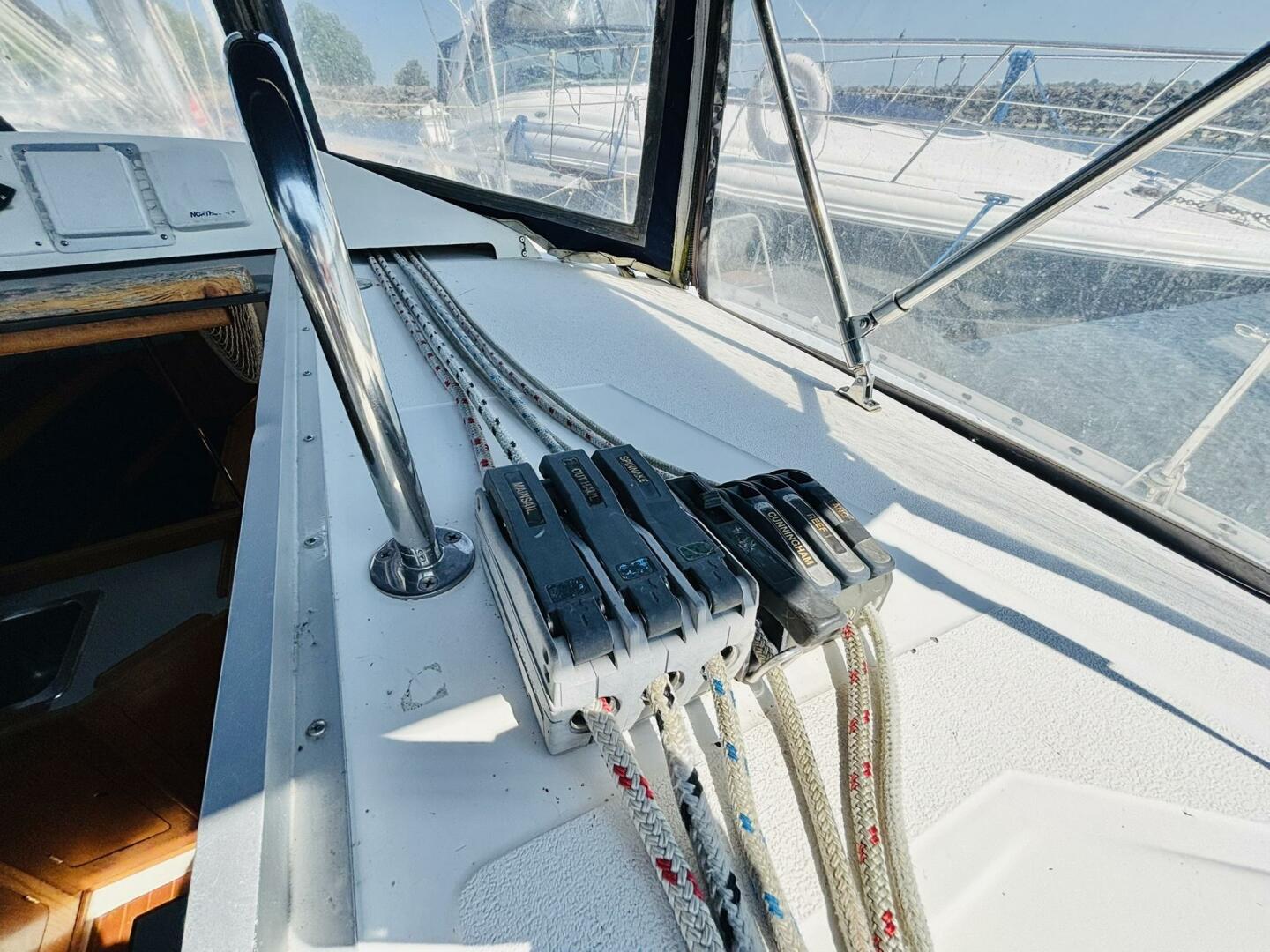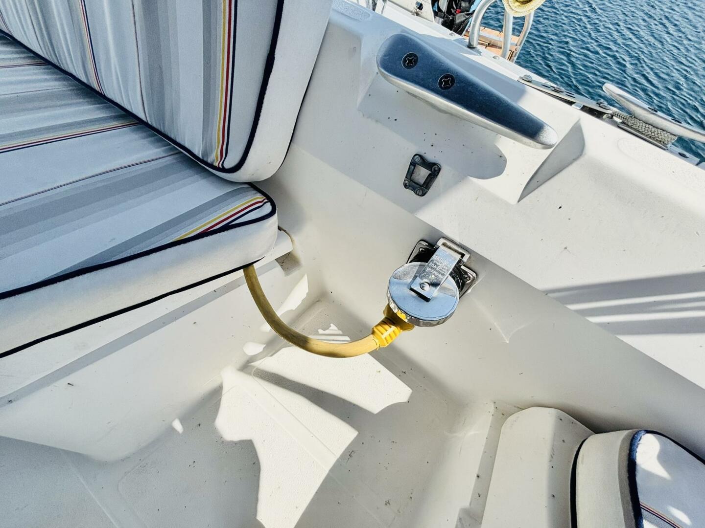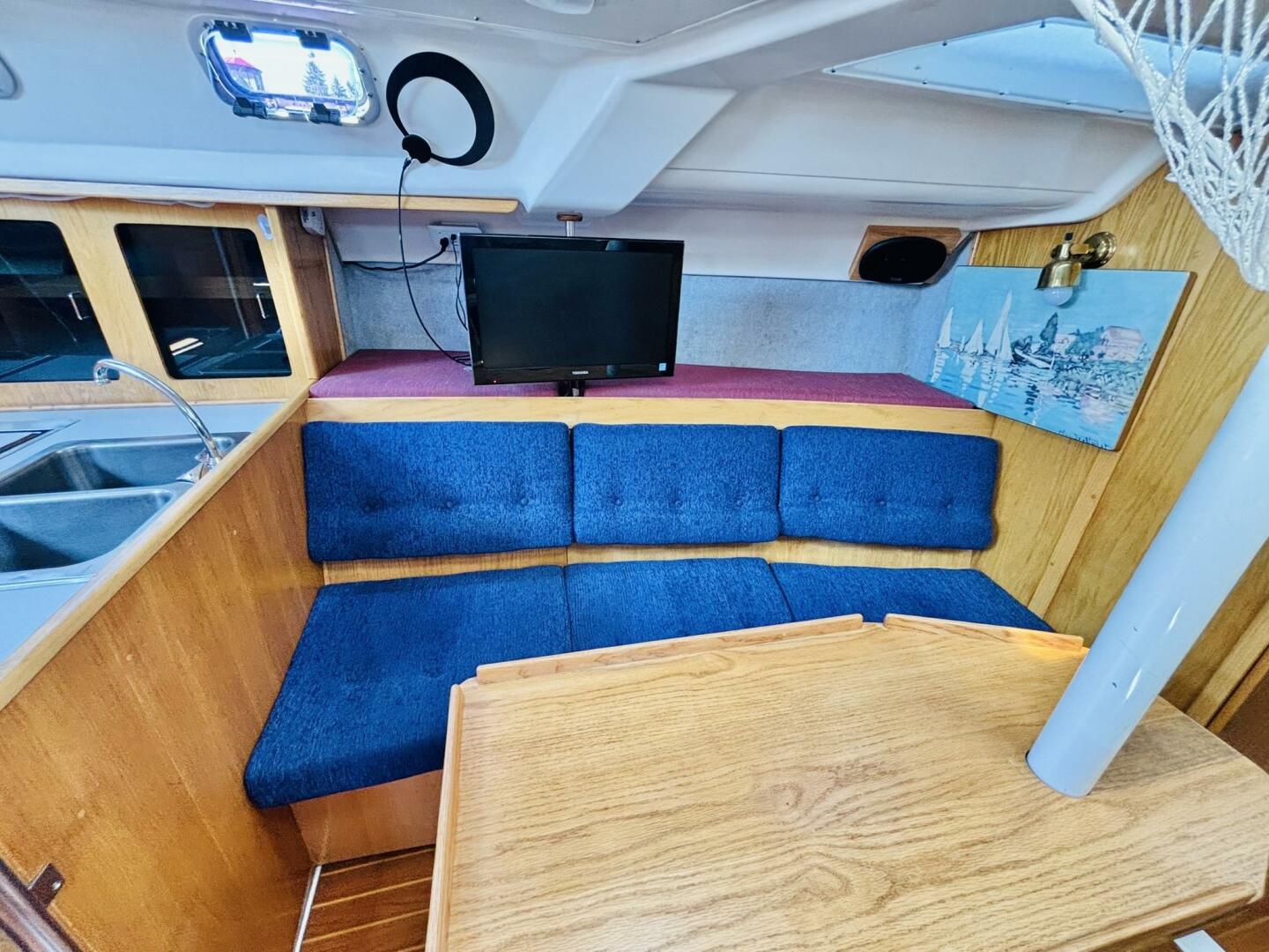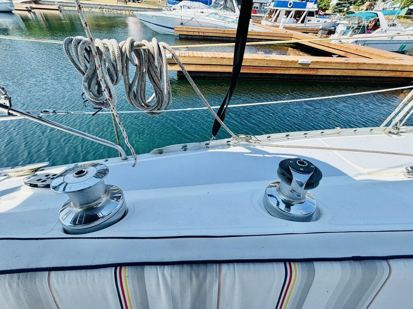 On deck, her wide side decks, secure lifelines, and large cockpit make for safe and comfortable passages. The bimini and dodger offer excellent protection, while self-tailing winches, furling genoa, and well-laid-out controls keep sailing manageable for short-handed crews. Powered by a reliable Yanmar diesel, she offers dependable performance under power.