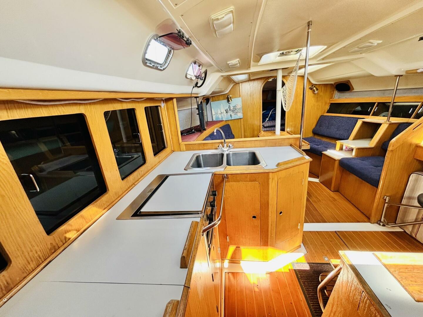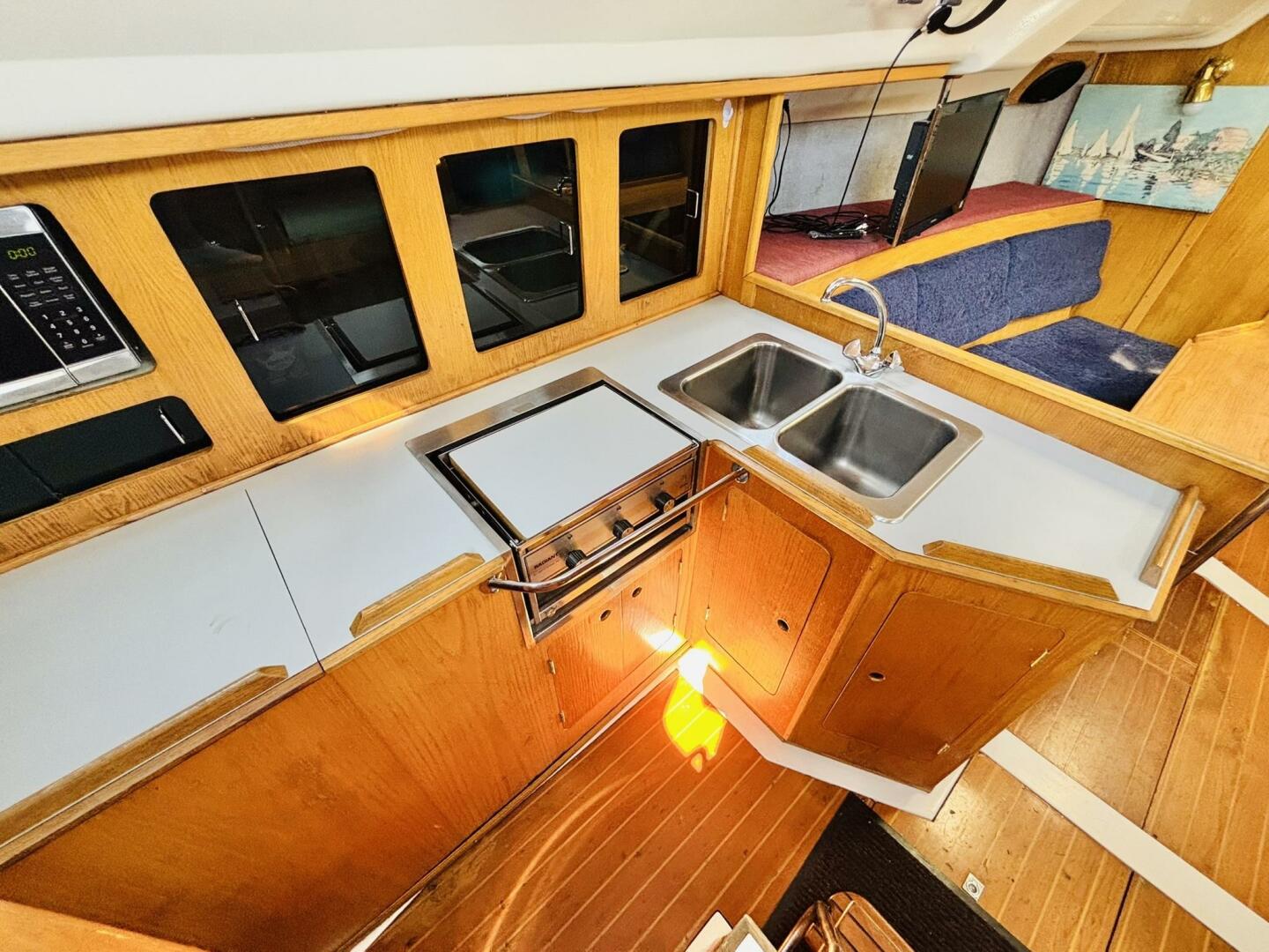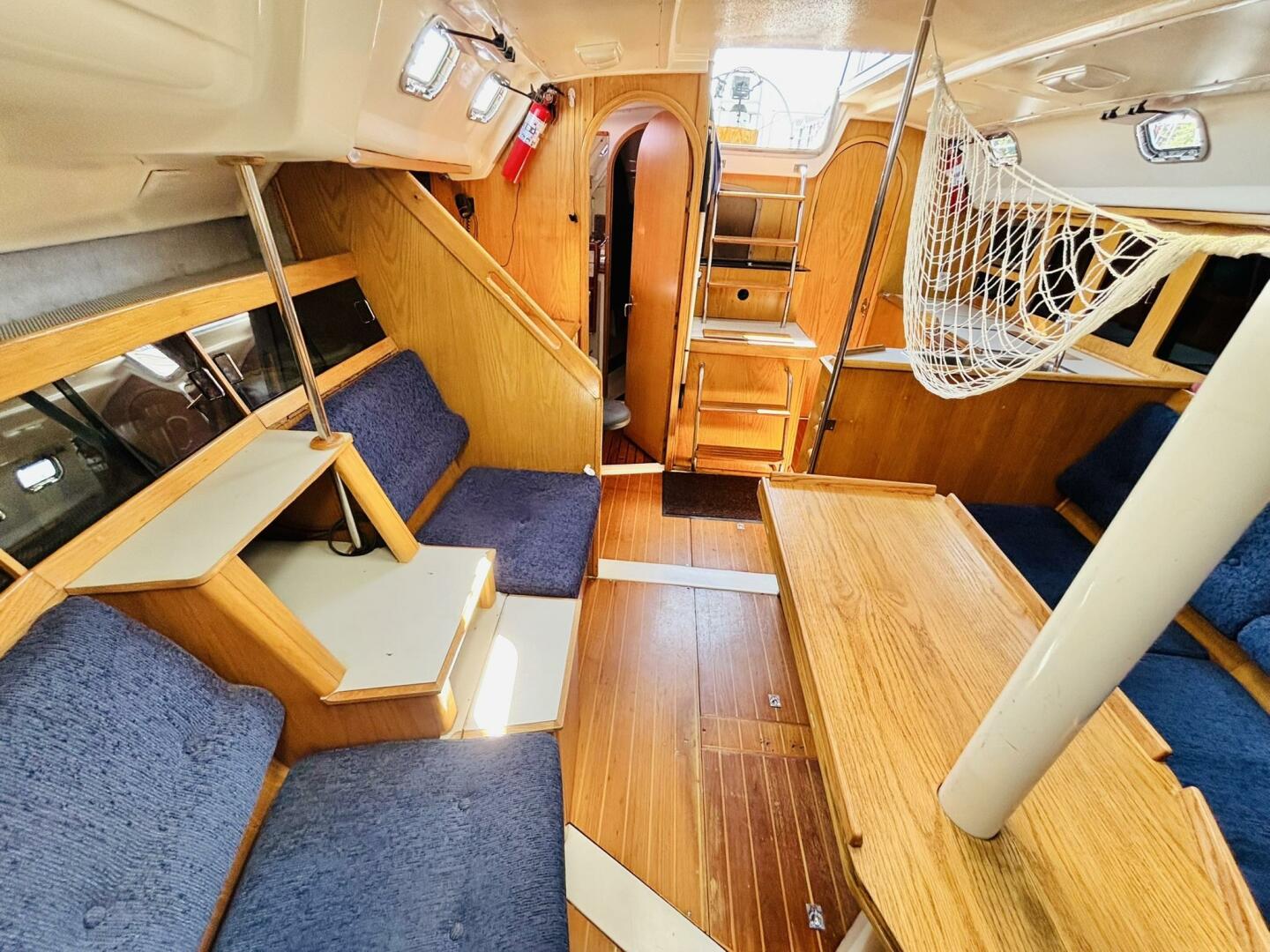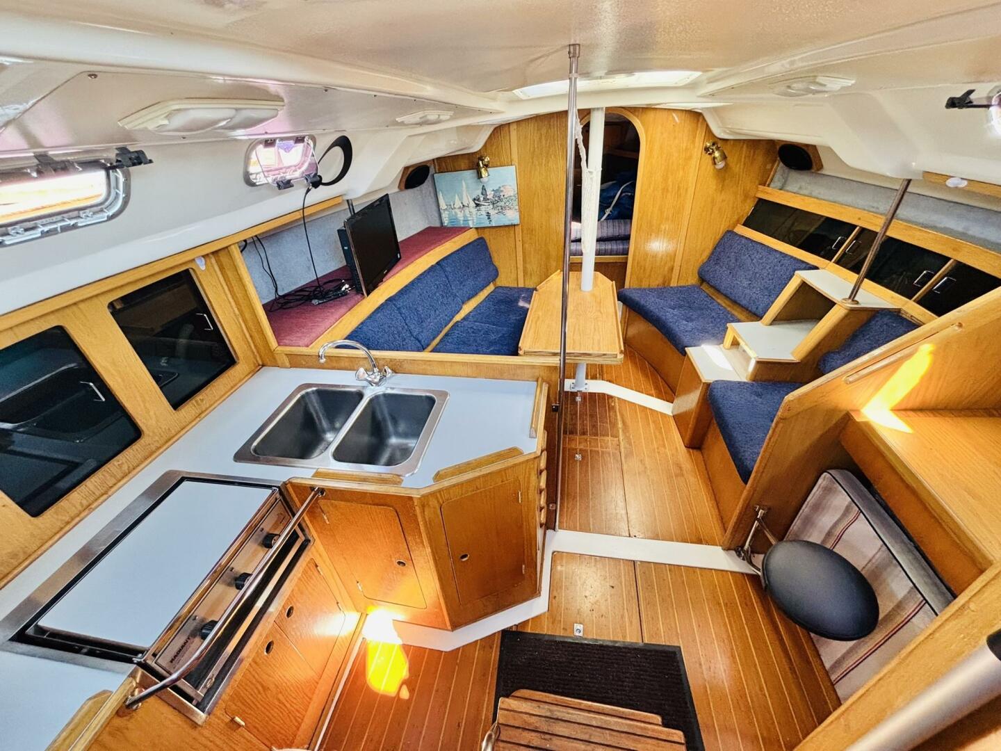Below deck, you’ll find a spacious salon with 6’4” headroom, warm teak finishes, and abundant natural light. The galley is fully equipped with a double stainless sink, propane stove/oven, and generous storage. The private forward V-berth and large aft stateroom provide comfortable sleeping quarters for up to six, while the well-appointed head includes a separate shower area.