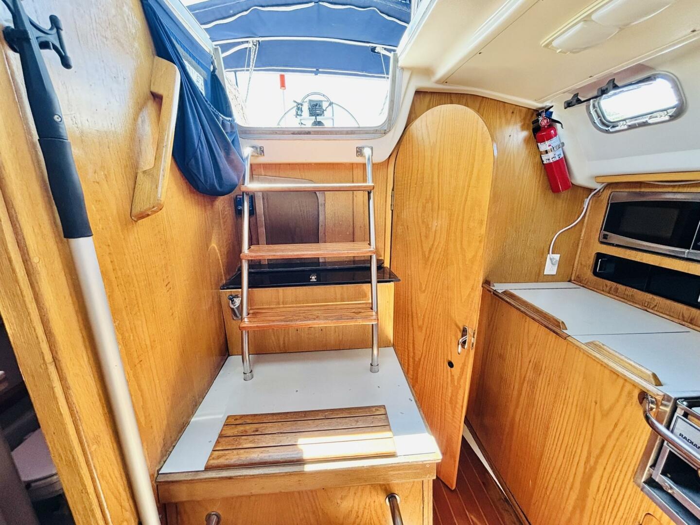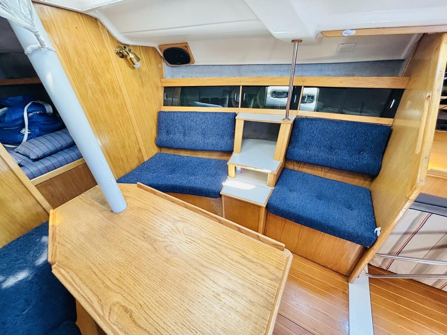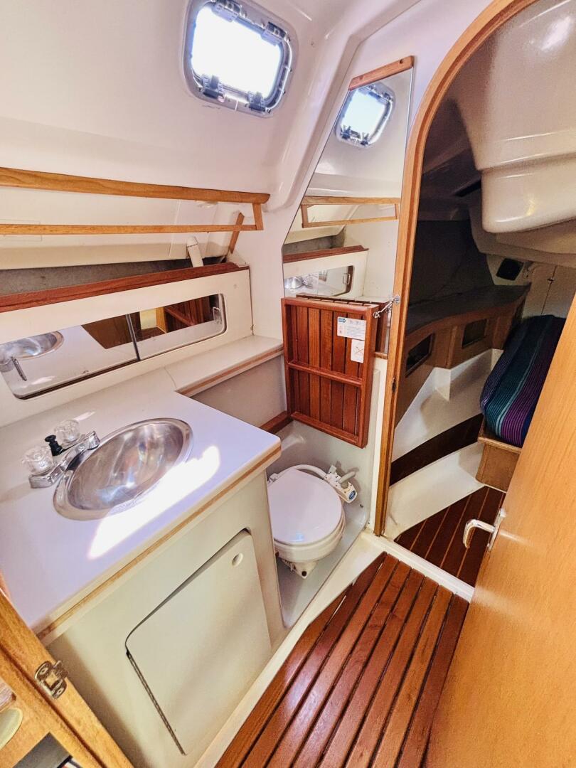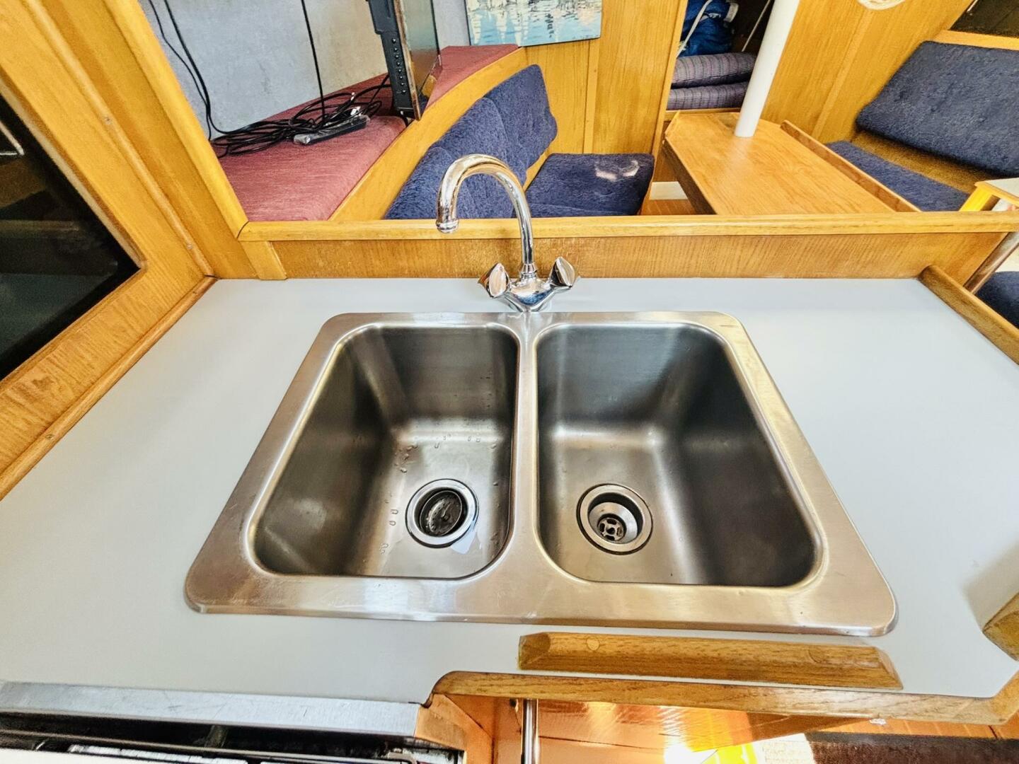 Below deck, you’ll find a spacious salon with 6’4” headroom, warm teak finishes, and abundant natural light. The galley is fully equipped with a double stainless sink, propane stove/oven, and generous storage. The private forward V-berth and large aft stateroom provide comfortable sleeping quarters for up to six, while the well-appointed head includes a separate shower area.
