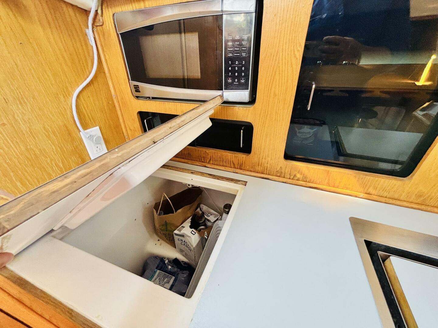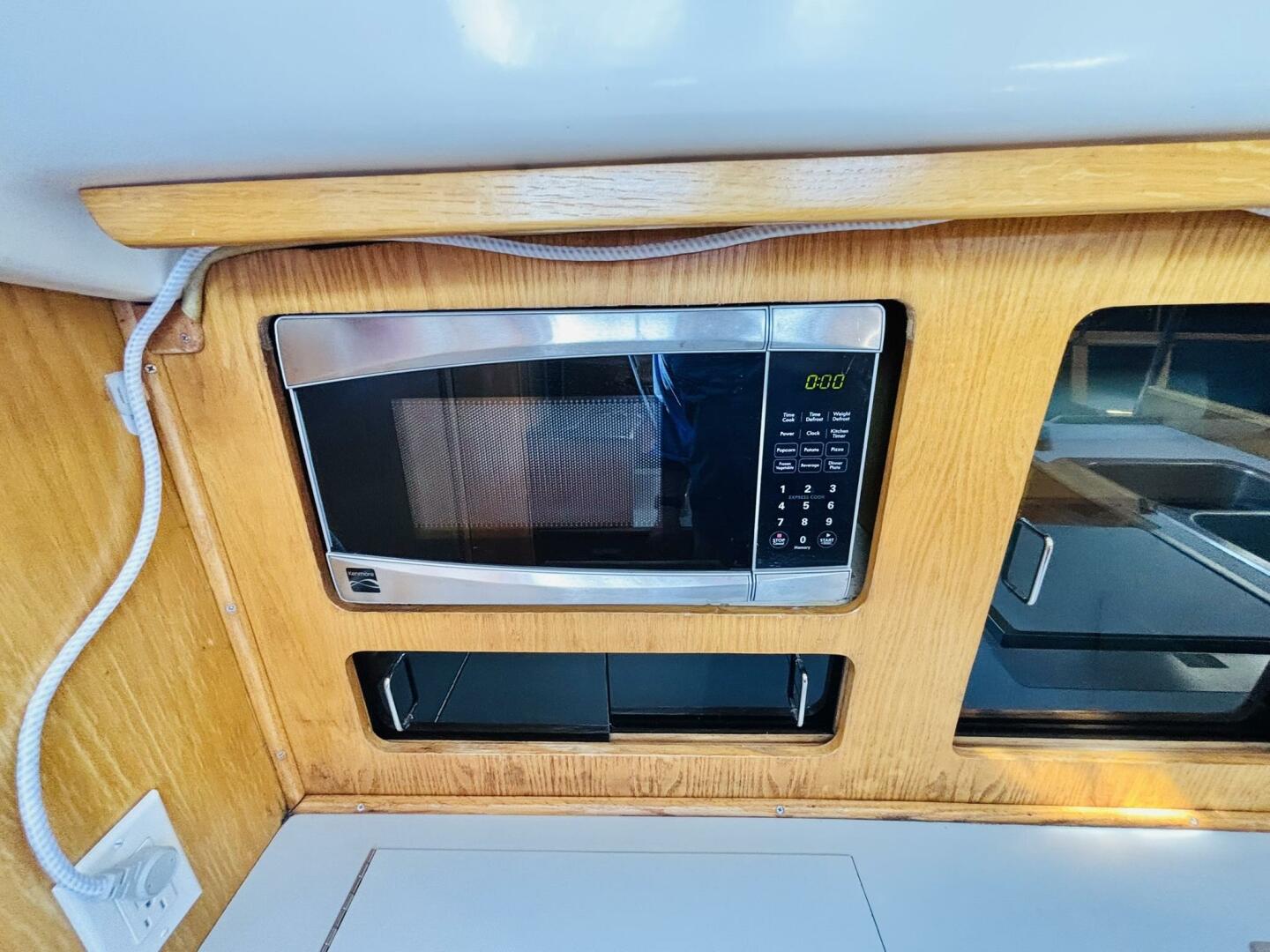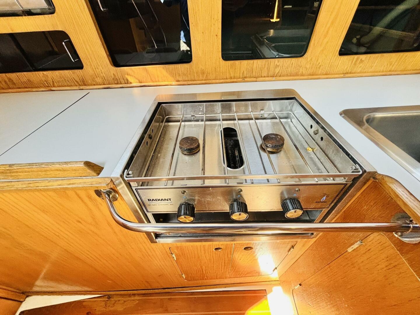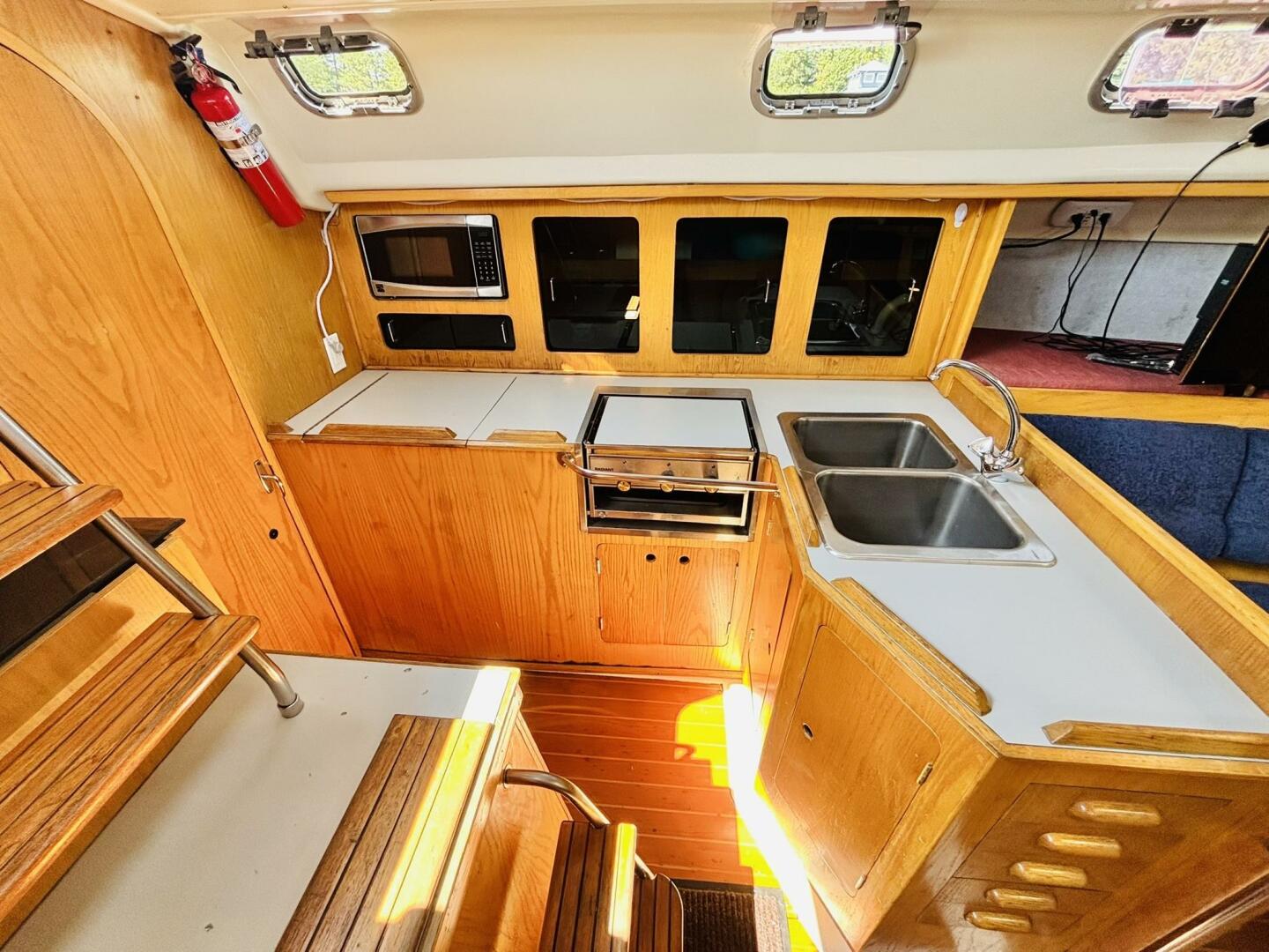 Below deck, you’ll find a spacious salon with 6’4” headroom, warm teak finishes, and abundant natural light. The galley is fully equipped with a double stainless sink, propane stove/oven, and generous storage. The private forward V-berth and large aft stateroom provide comfortable sleeping quarters for up to six, while the well-appointed head includes a separate shower area.