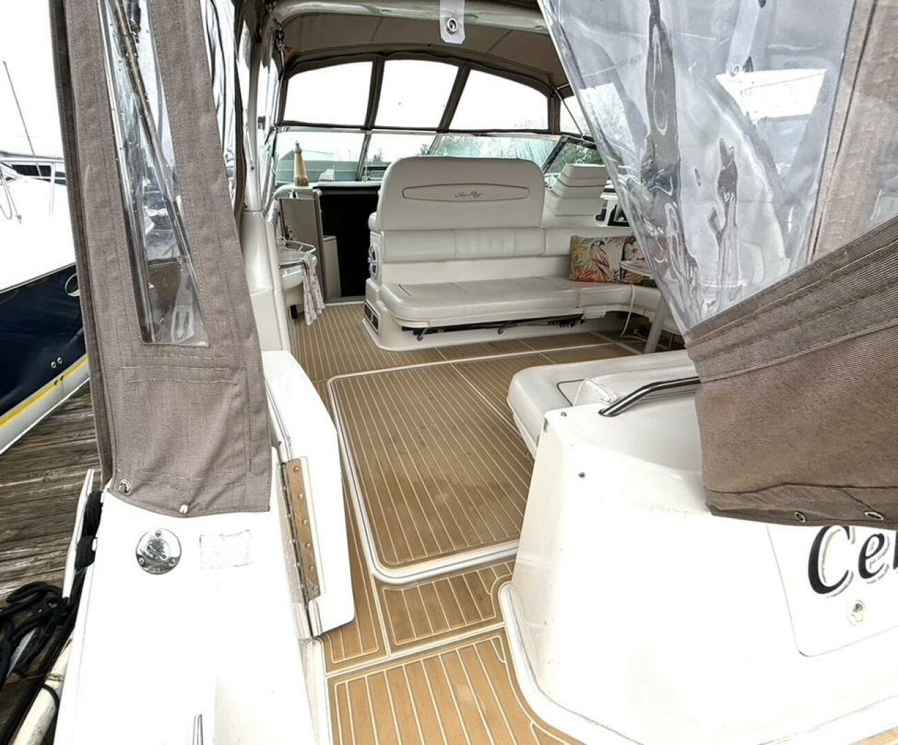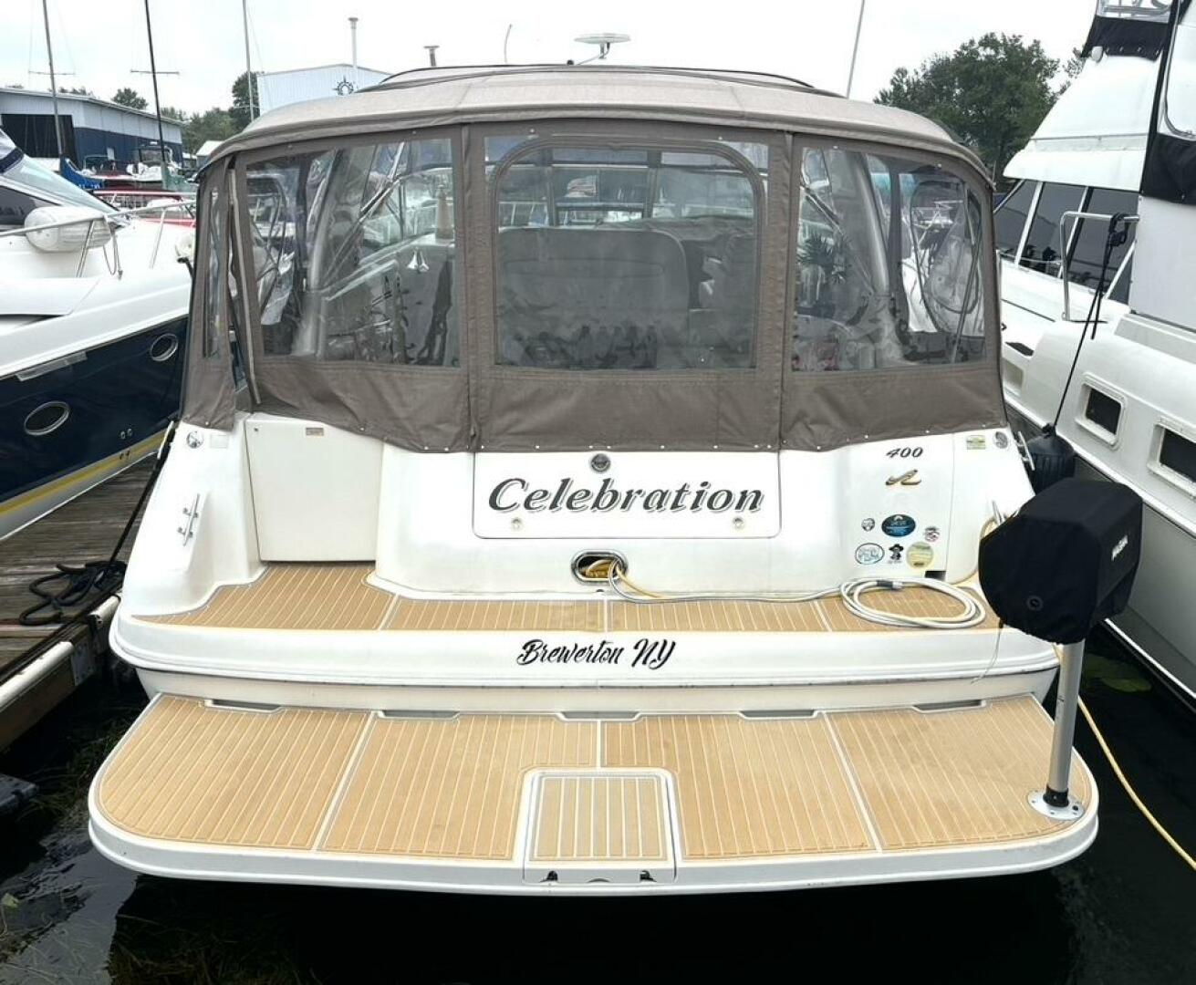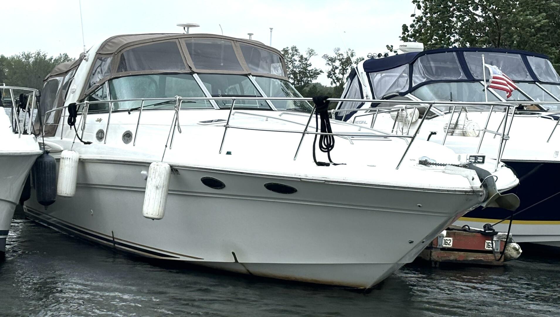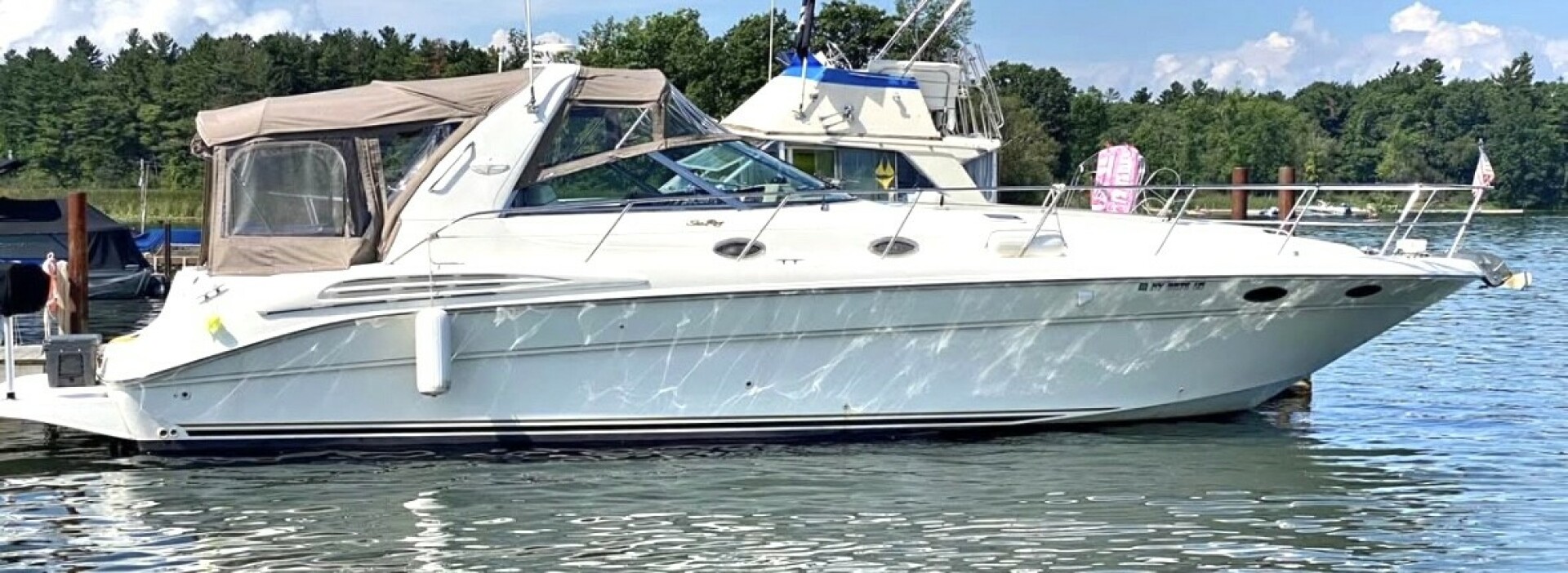 This 400 Sundancer is for those that are looking for a beautifully equipped boat, that is perfect for a weekender or extended stay vessel. Coming from Sea Ray's popular and beloved line, this beauty is in the water and ready to be enjoyed for the rest of the summer and beyond! She has been extremely well taken care of by the sellers and pride of ownership certainly shows. From the The new canvas and SeaDek to the Pioneer/Fusion stereo system and upgraded chartplotters, there have been some very nice upgrades done as well. Entering into the vessel you are greeted by Sea Ray's famous lounging cockpit where there is a ton of living and entertainment space, all thanks to the wrap around lounge seating with removable table. You also have direct access to a wet bar, mini fridge and plenty of storage. Venture up into the helm area and you will find a captain's chair as well as a full bench seat for additional occupancy. Upgraded electronics, stereo controls, and clear views of what's ahead make this a comfortable and enjoyable operating area. When you find your way into the salon, you are greeting by a beautifully equipped galley with full refrigerator and separate freezer, 3 burner stove, microwave, coffee maker and tons of storage! The curved sofa with table can act as a dinette or can convert to additional sleeping accommodations. The aft cabin berth acts as a conversation or living area by day and converts to a double bed at night, with closet space and private head! Privacy door separates the entire space from the rest of the salon. Finally, the master stateroom has a full size pedestal bed with 2 cedar lined hanging closets, plenty of storage, TV and direct access to the master head with full standup shower. The interior is finished off with added amenities such as heat and A/C, central vac, and upgraded speakers, all able to be powered by the onboard generator. The twin 454 Horizon MerCruiser V-Drives will power you around reliably every time!