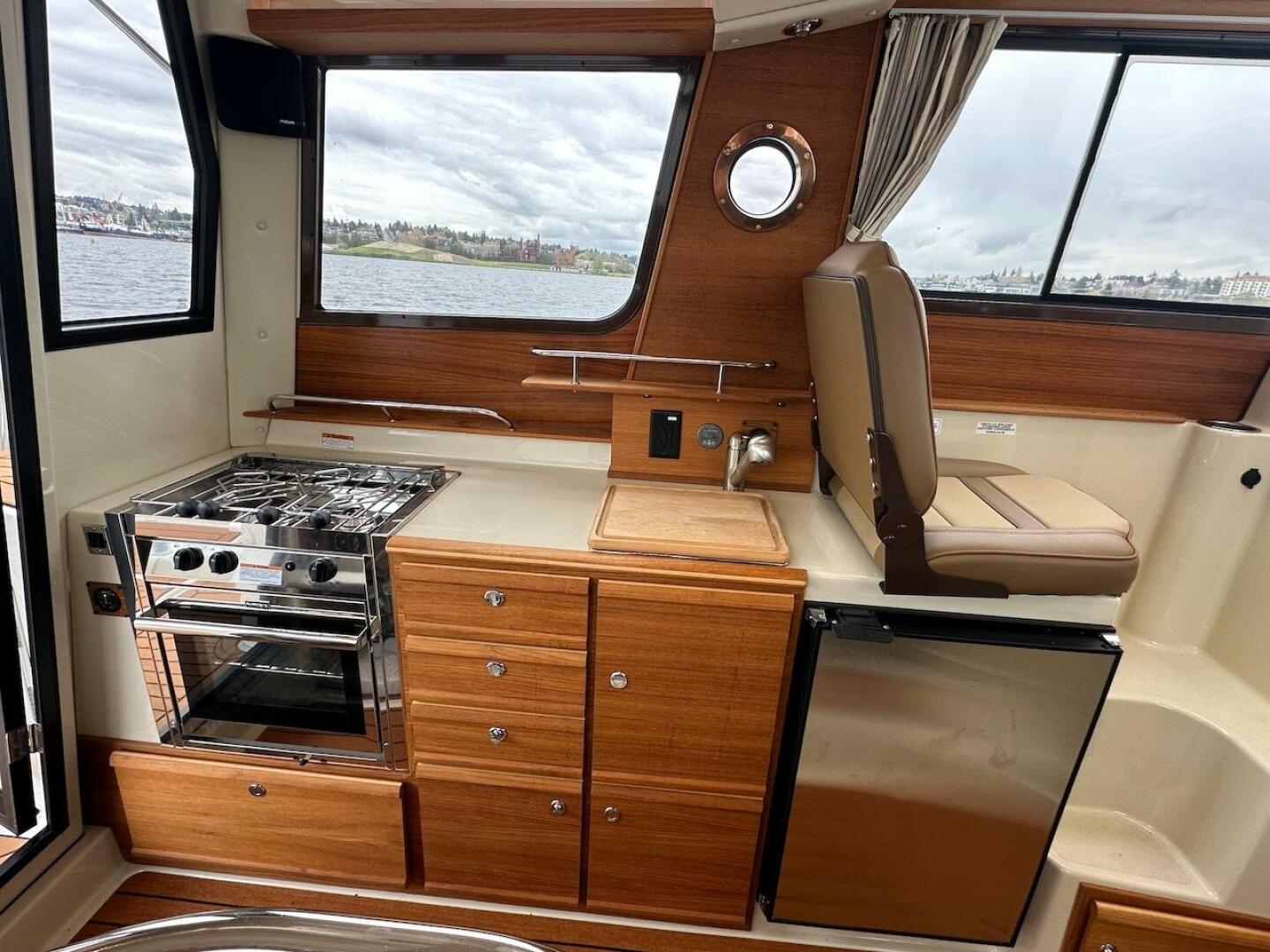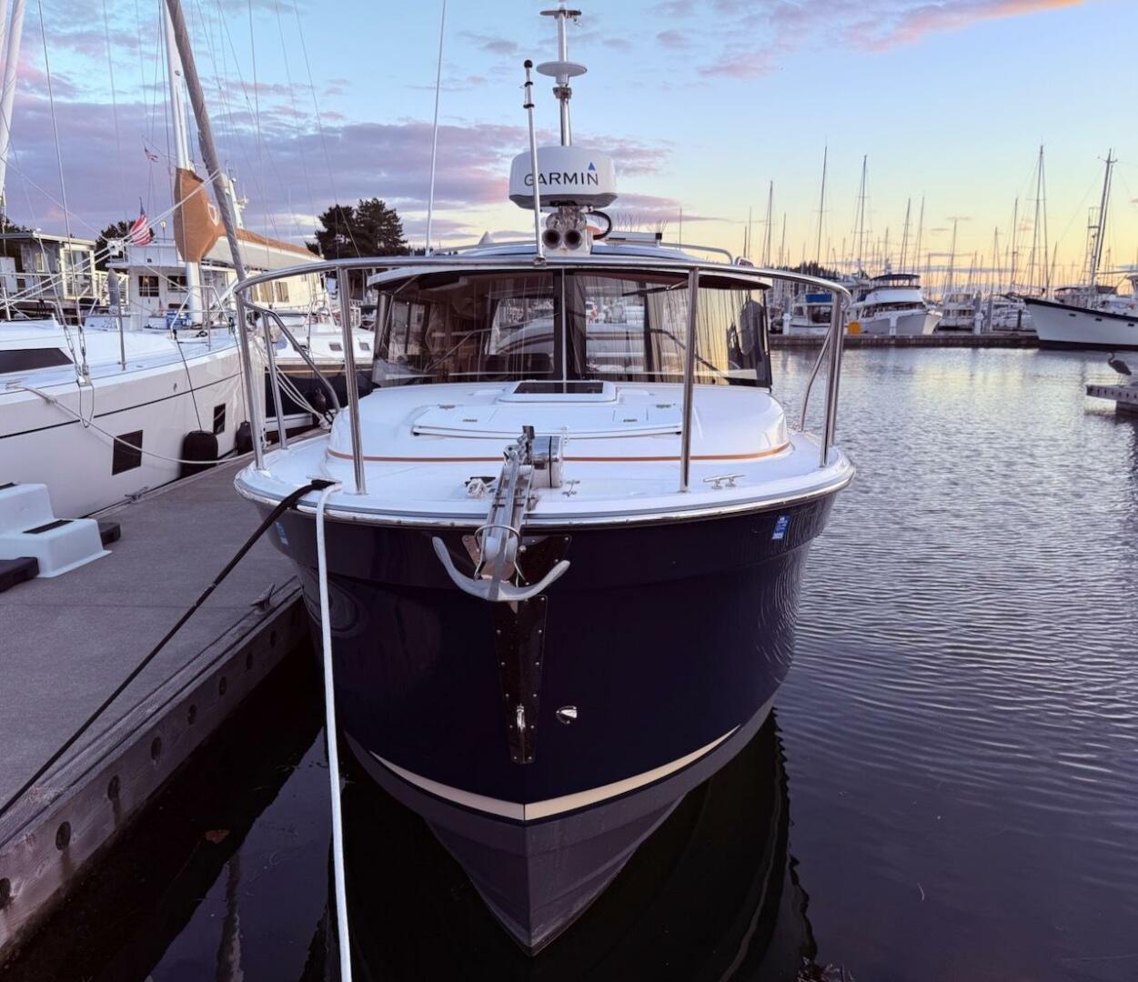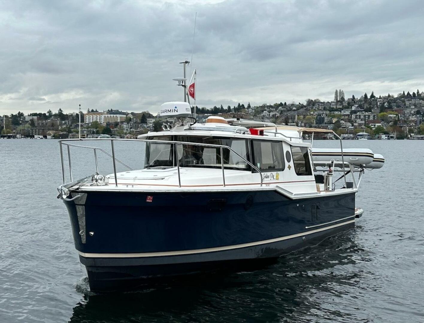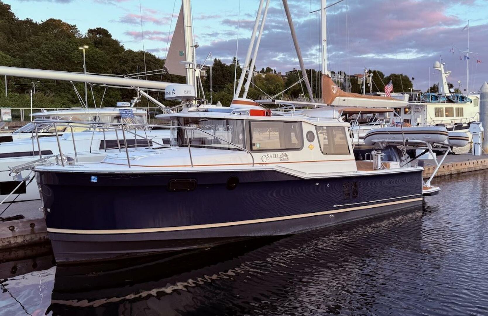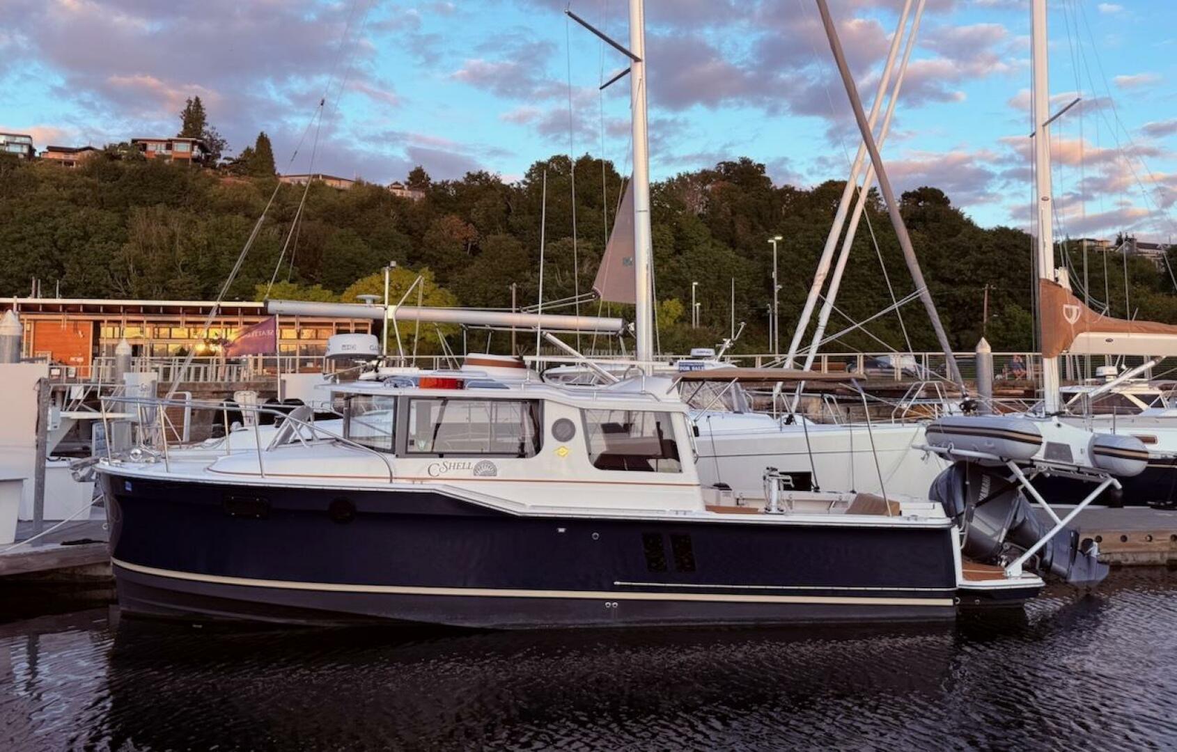 "C Shell" is a 2022 Ranger Tugs R27 Northwest Edition, which means it is specially designed for cold-weather boating, with durable AGM batteries, Forced air diesel-powered heating, and downrigger plugs and pads for adding fishing and crabbing equipment. She also comes equipped with a davit system, tender with fiberglass bottom, and a Torqeedo electric outboard.