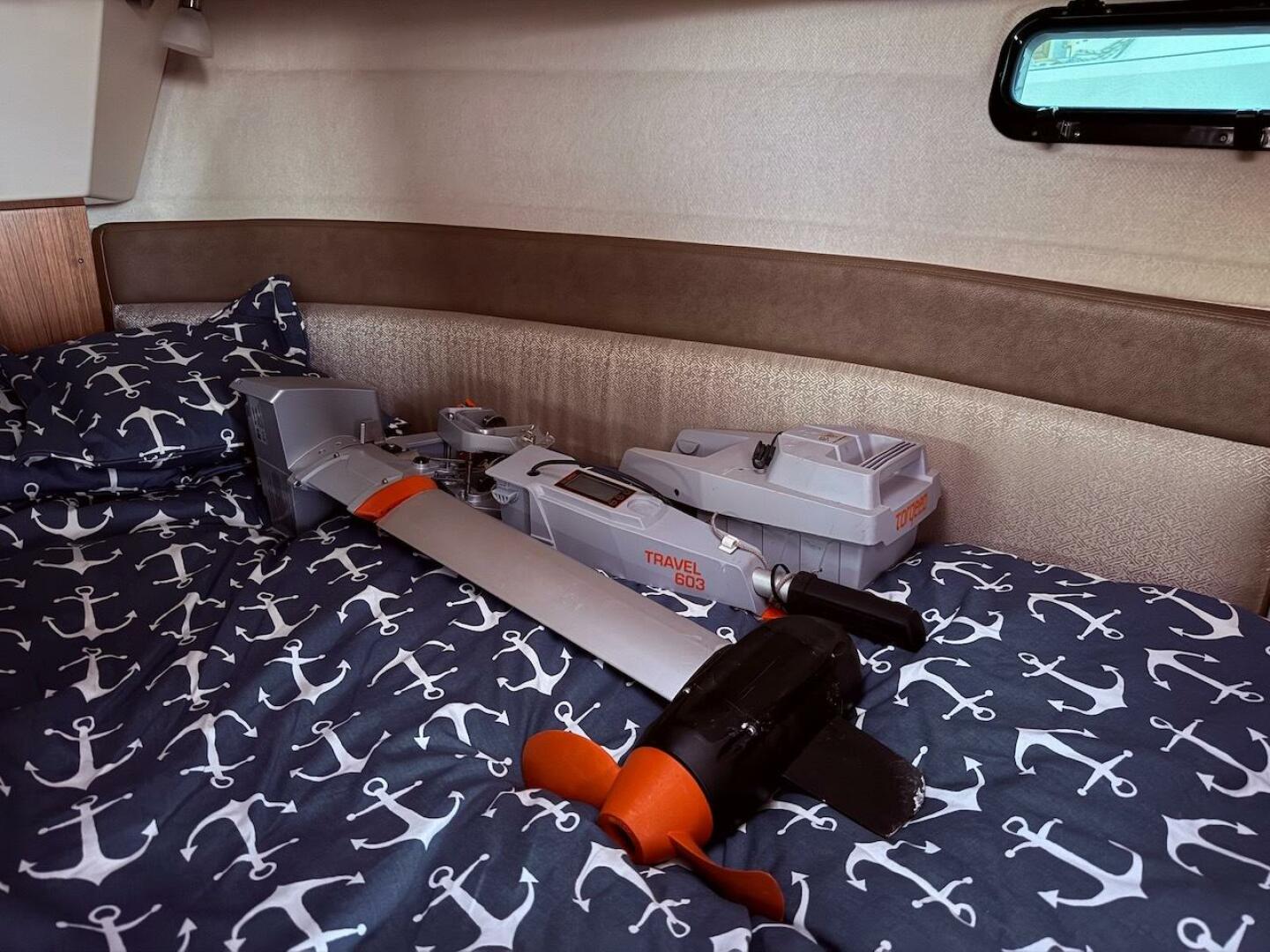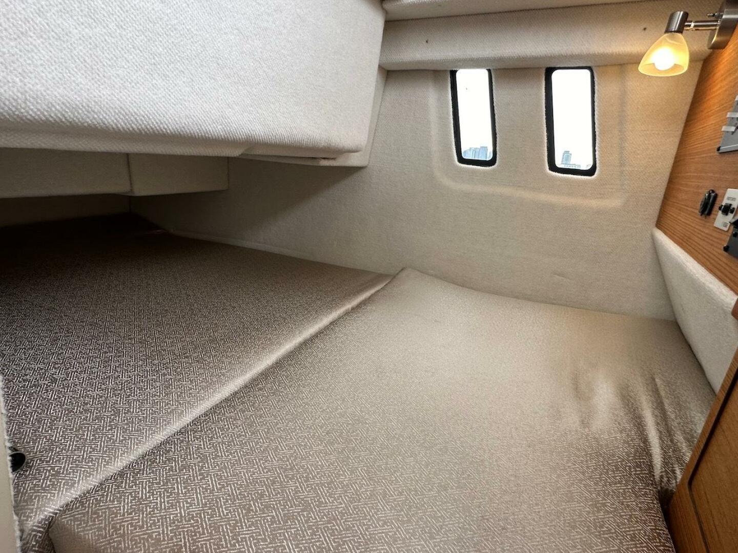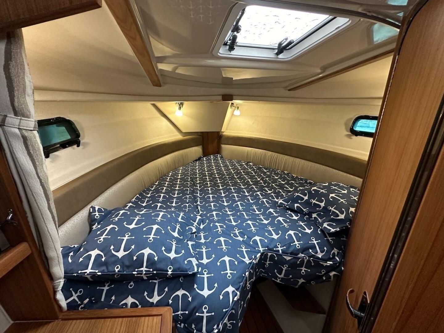 - Convertible Bed – V-Berth, with custom bedding, cover and pillows (Never slept on). The original cushions have a custom mattress topper for extra comfort. Can be converted to V-shaped settee with a small table, by removing the middle insert.