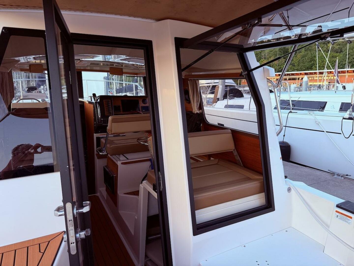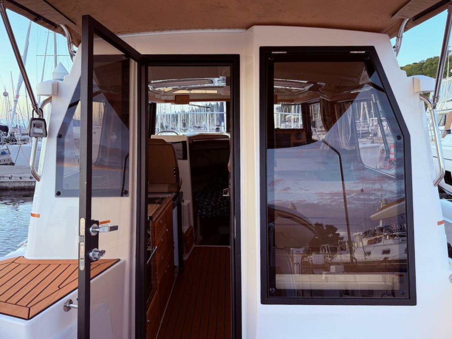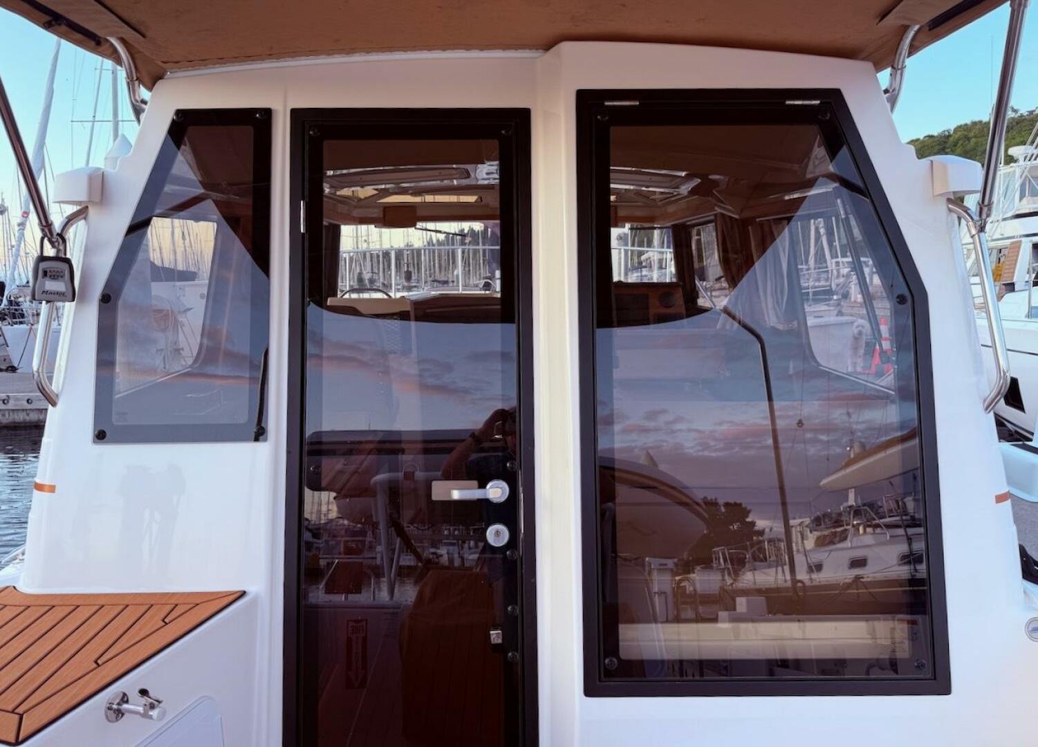 - Opening Bulkhead to the salon – Flip up the glass and metal-framed bulkhead and flip the salon settee back, and you get a nice 2 person bench to sit on.