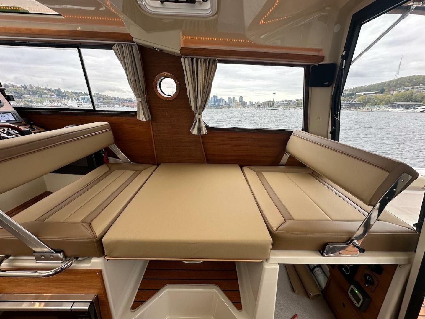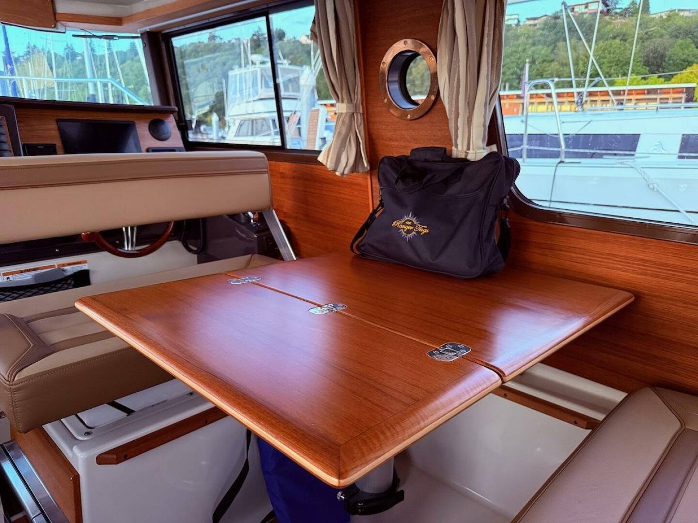 - Dinette Large wood table that cab drop down to make a berth. The bench seats on either side of the table have backs that can be moved forward or back. The forward bench becomes the helm seating when underway.