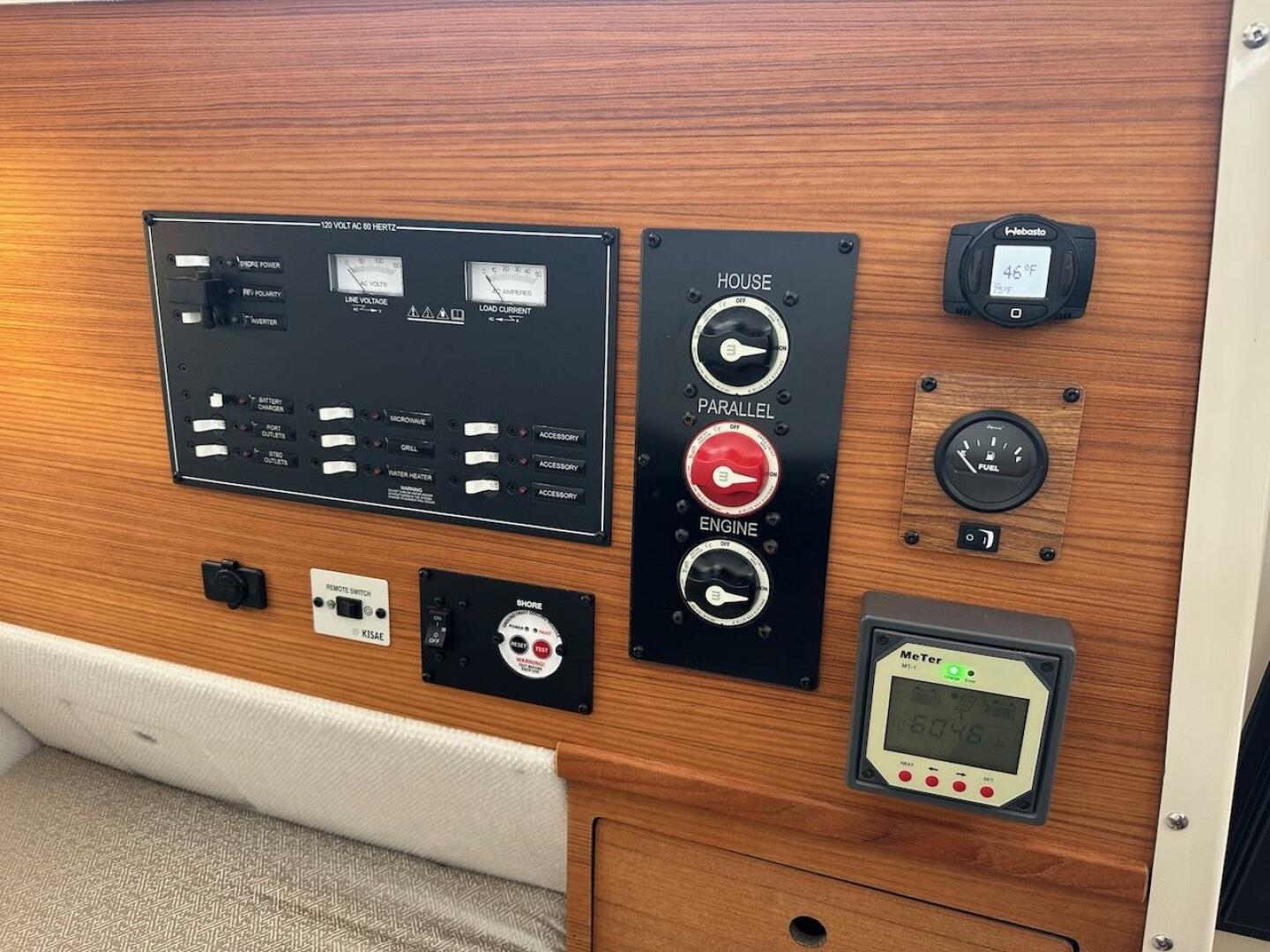 - Control switches – Nav Anchor Light, Chart Light, Fwd & Aft Bilge controls, Macerator, Fan, Wipers, Horn and Windlass up/down, all with breakers